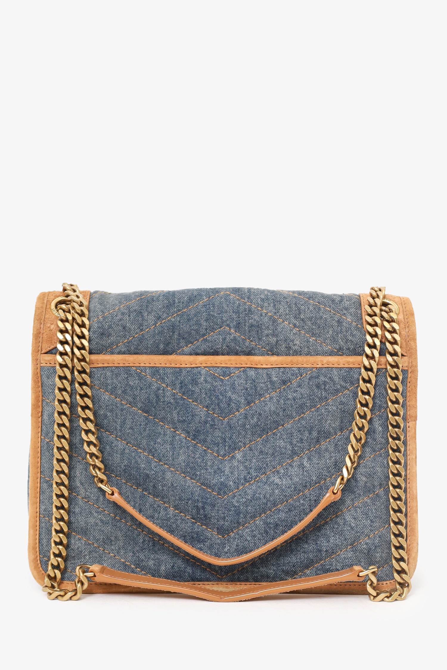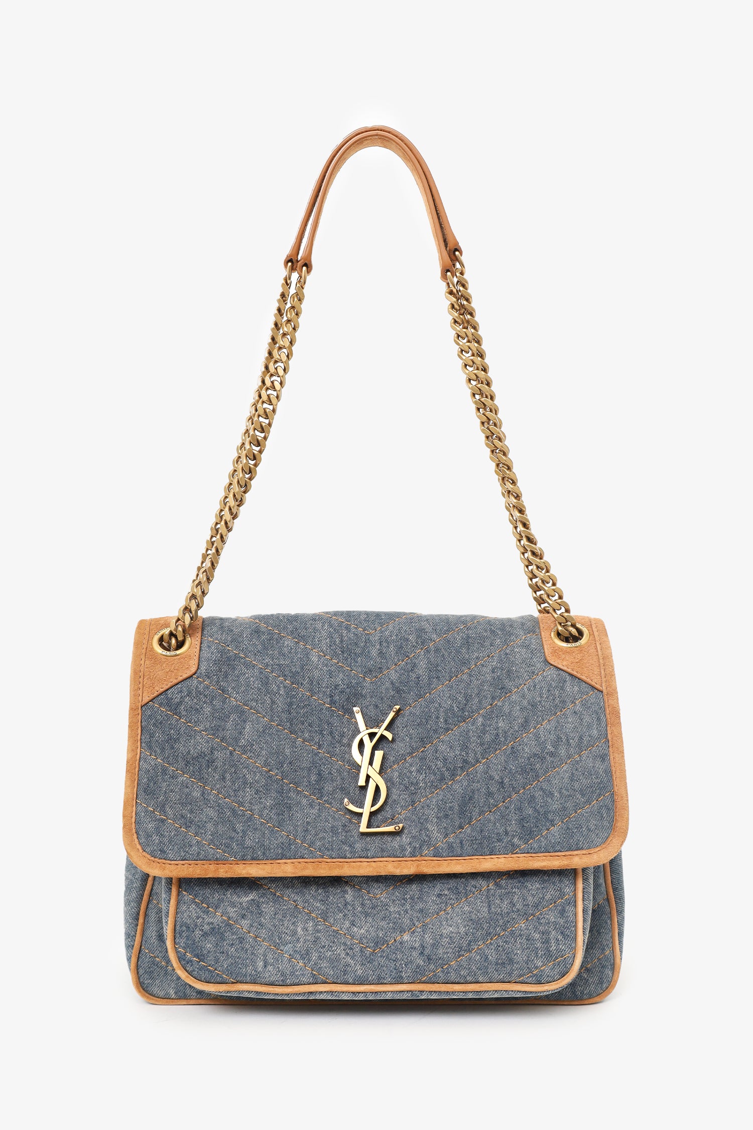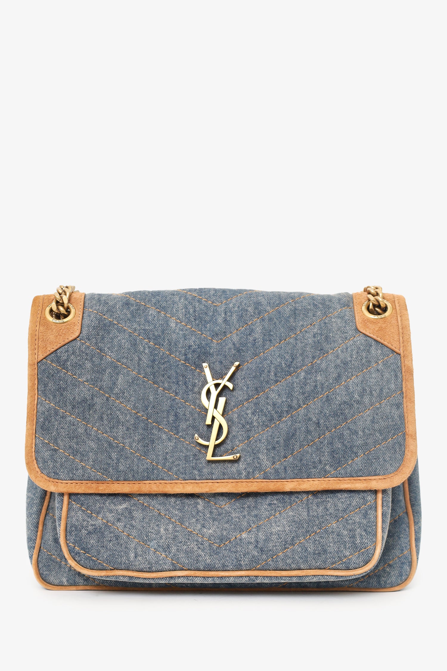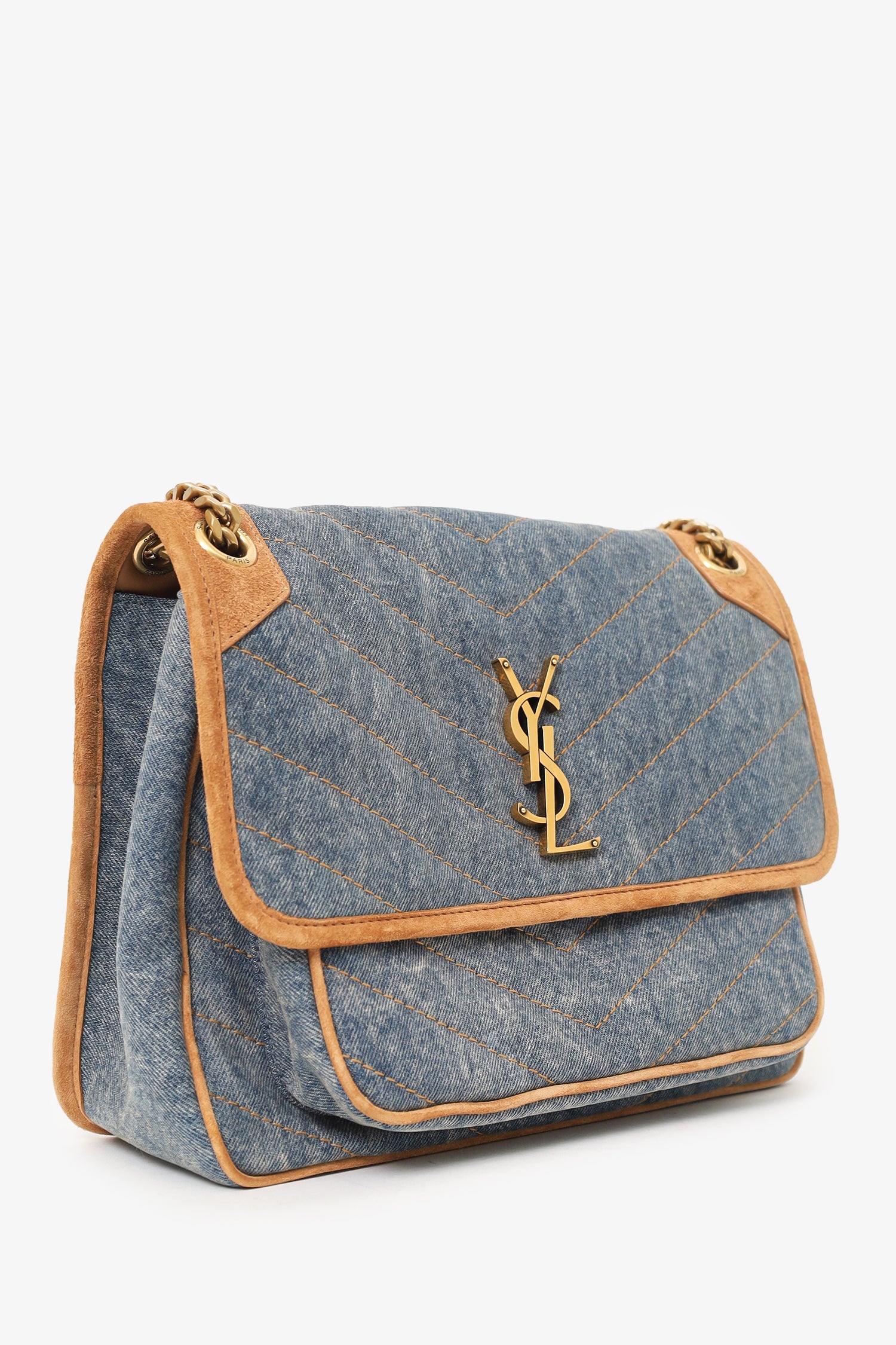 Saint Laurent Blue/Brown Denim/Suede Medium Monogram Matelasse Niki Shoulder Bag. Front fold-over flap with magnetic snap-button closure. Twin chainlink/leather shoulder straps that can pulled in and extended into single long strap. 1 rear exterior slip pocket. 2 interior compartments; single front open slip compartment, back open compartment with one slip and zip pocket. Leather-lined interior. Gold-tone hardware. Contrast/tonal stitching.