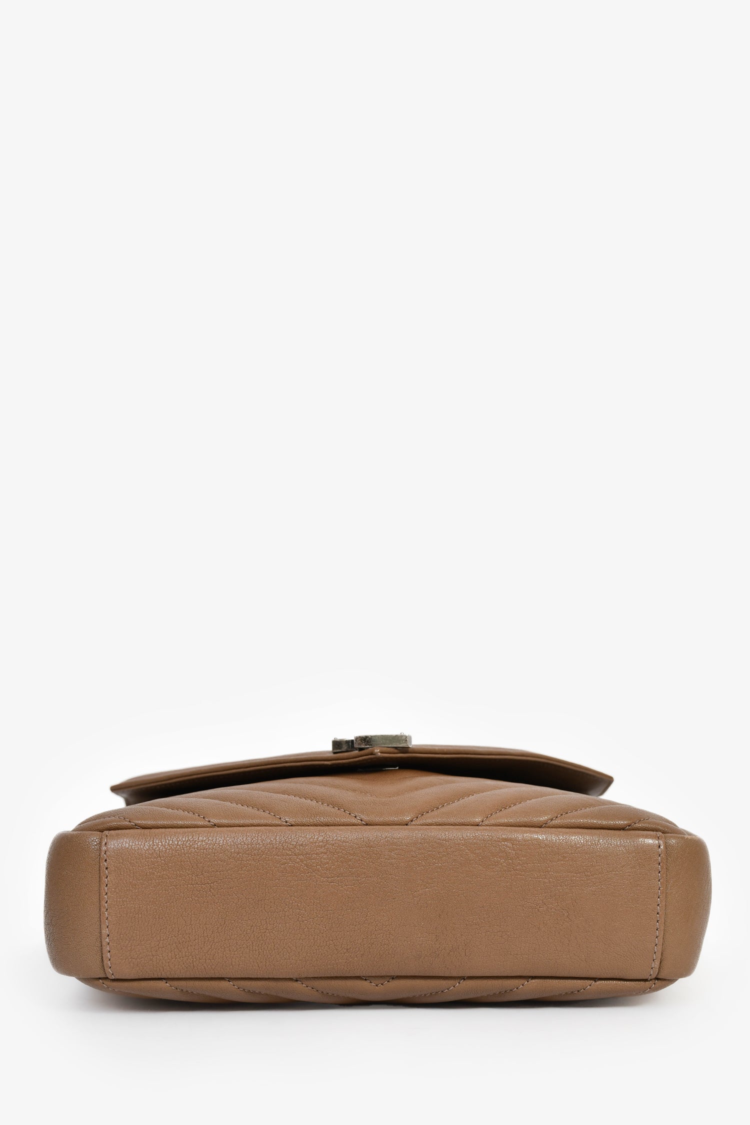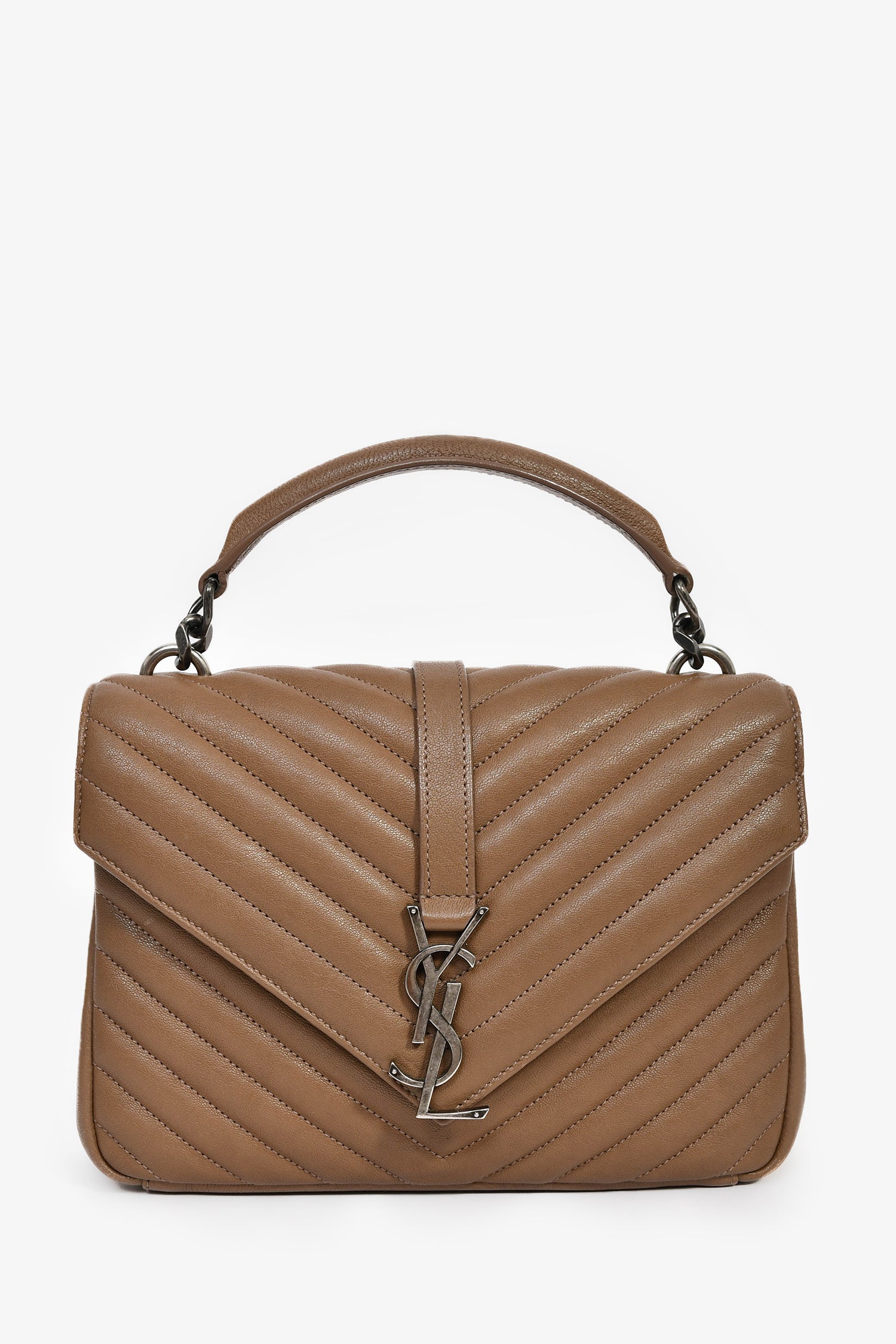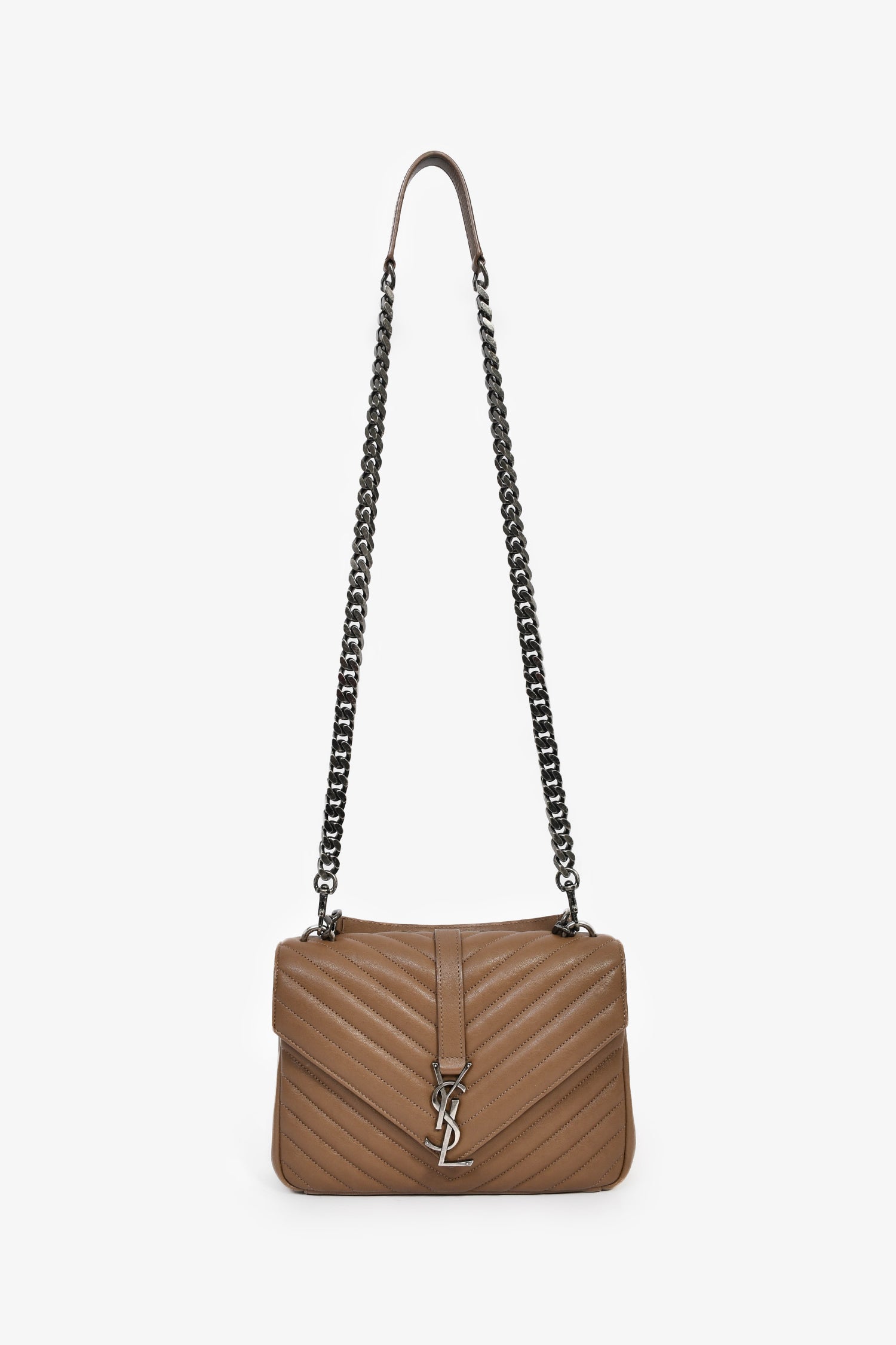 Refresh availabilitySaint Laurent Brown Chevron Leather Medium College Bag With Chain. Front fold-over flap with magnetic button closure. Top handle. Detachable chain strap. Single exterior rear slip pocket. Textile-lined interior. 3 interior compartments; 2 open, 1 with zip closure. Single interior wall slip pocket. Silver-tone hardware. Tonal stitching.