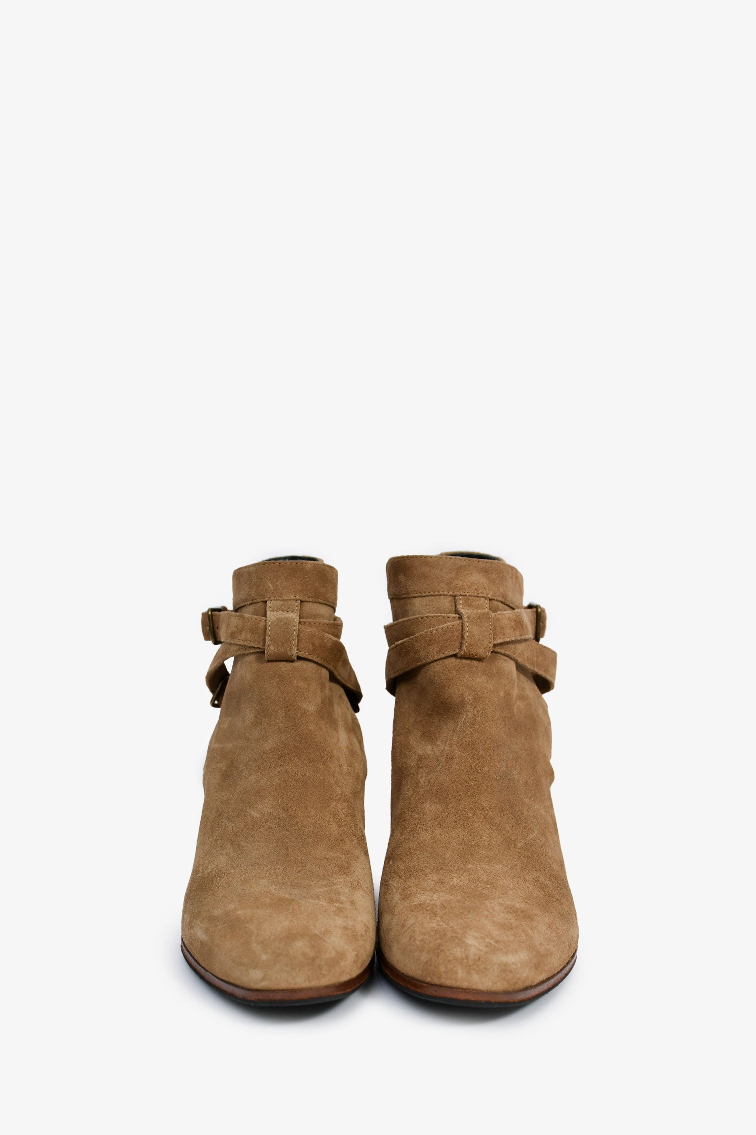 Refresh availabilitySaint Laurent Brown Suede Buckle Ankle Heeled Booties. Almond toe. Side buckle closure. Antique gold-tone hardware. Topy soles. Tonal stitching.