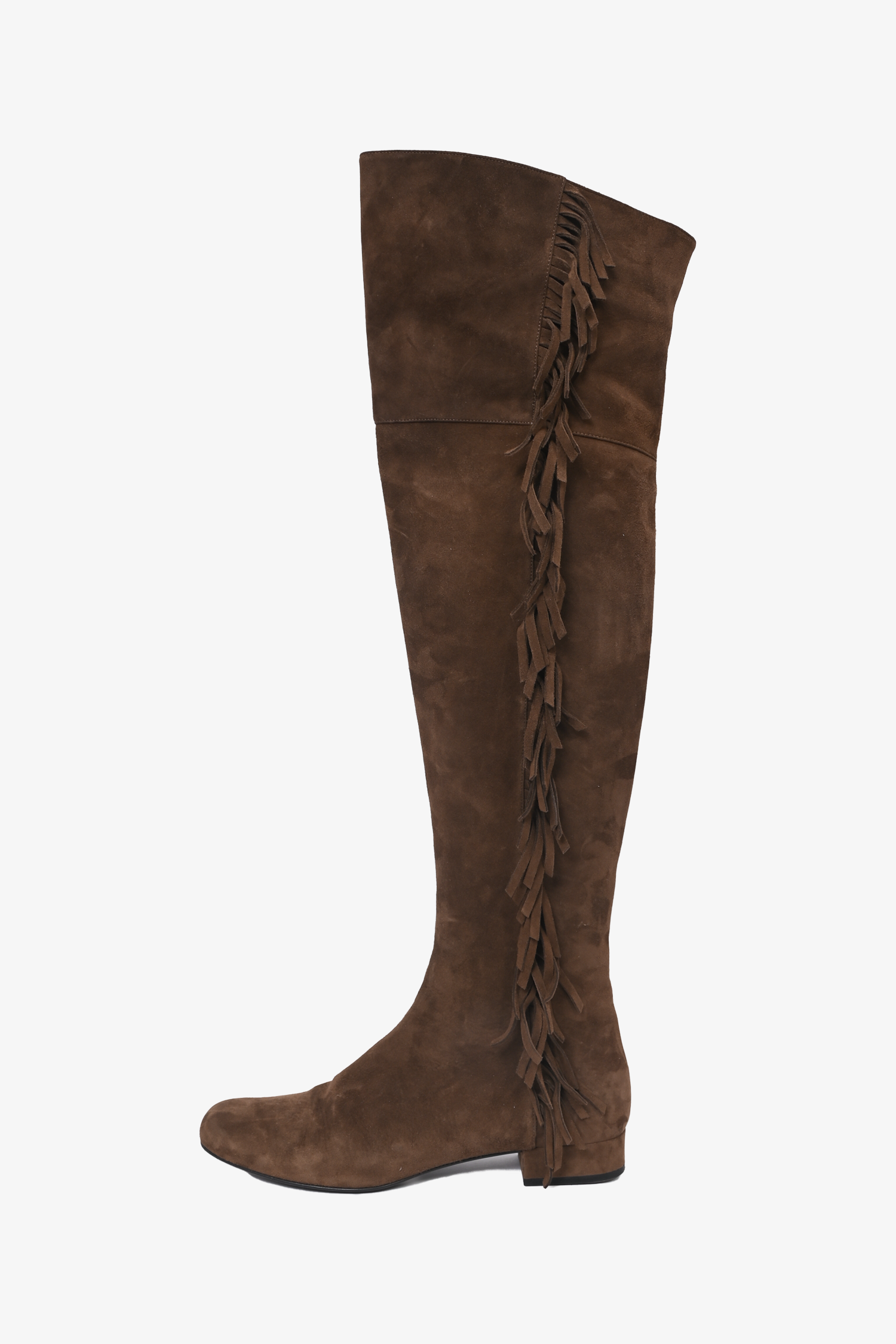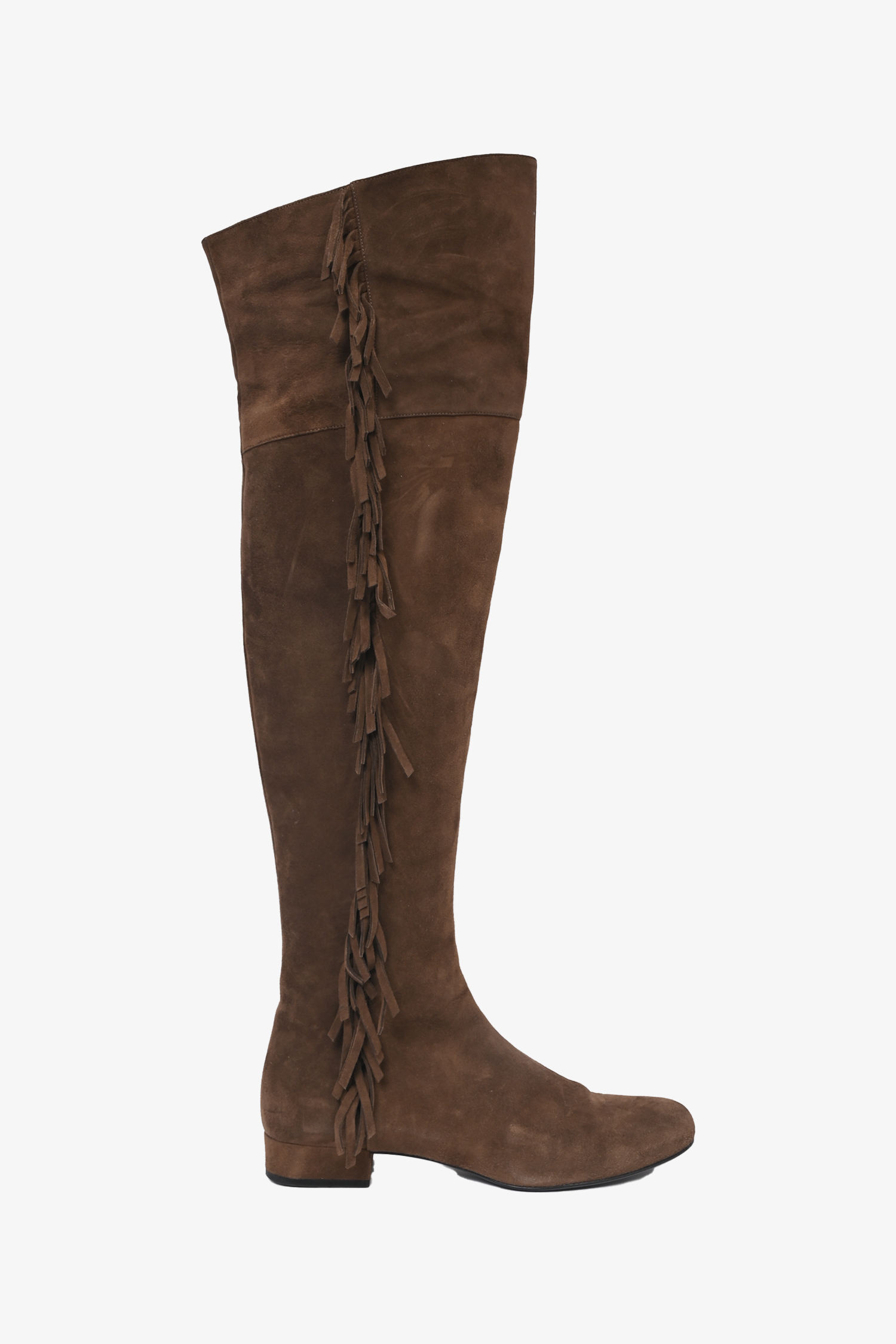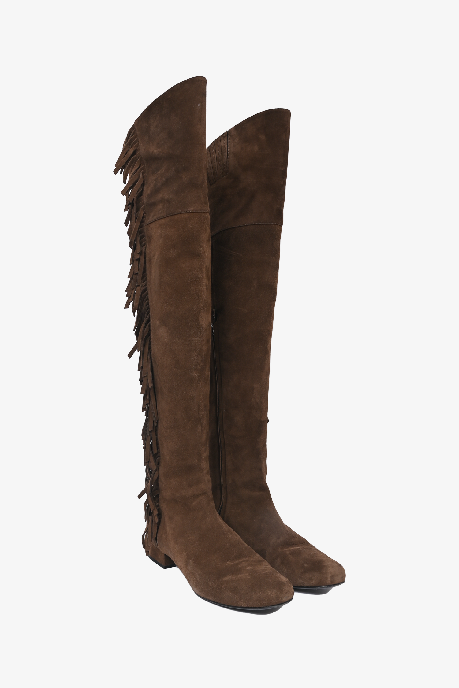 Refresh availabilitySaint Laurent Brown Suede Fringe Knee High Boots. Round toe. Side-zip closure. Tonal Saint Laurent Brown Suede Fringe Knee High Boots. Tonal stitching.