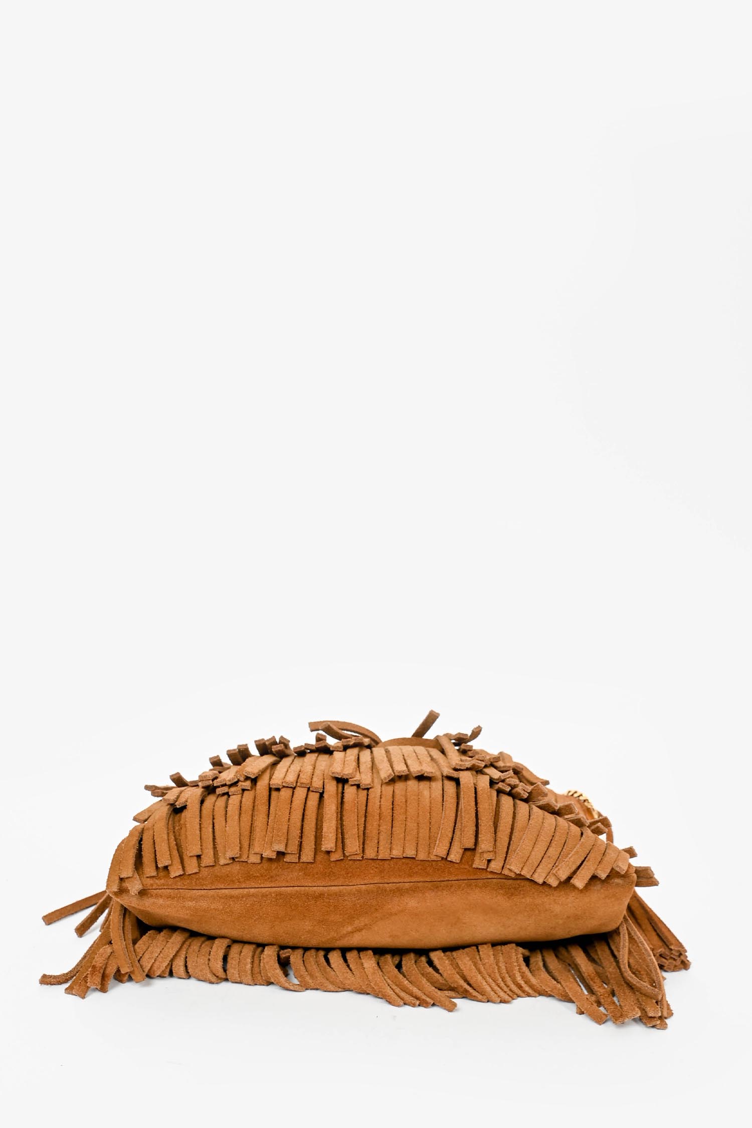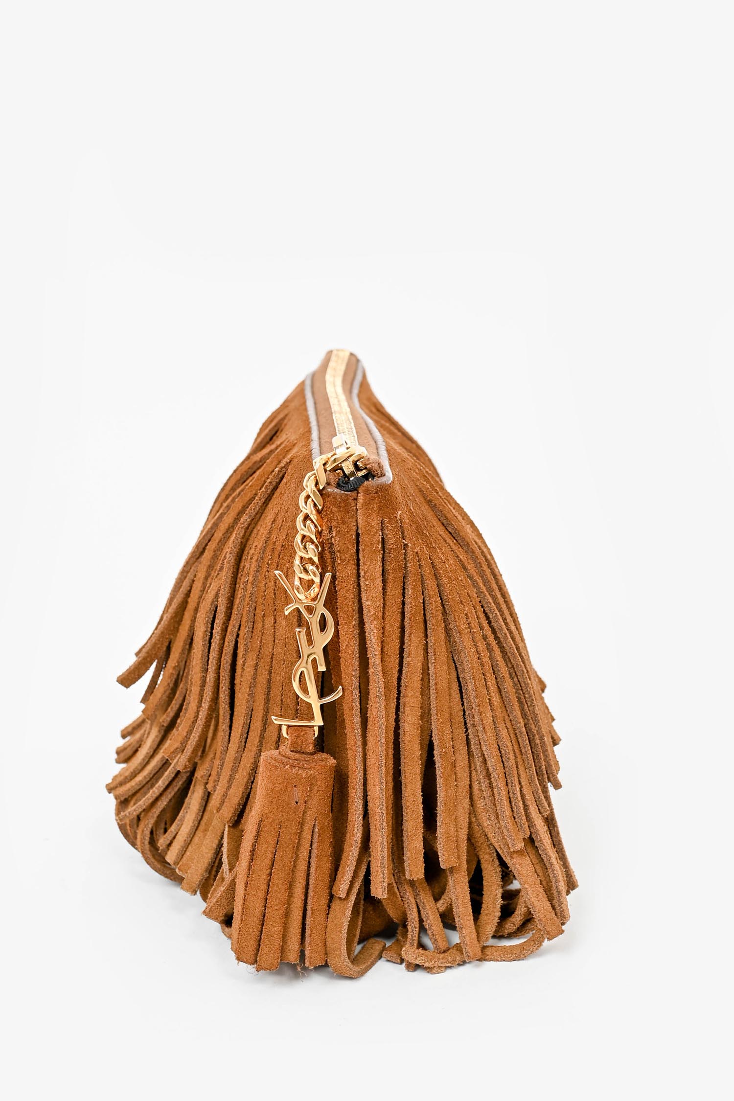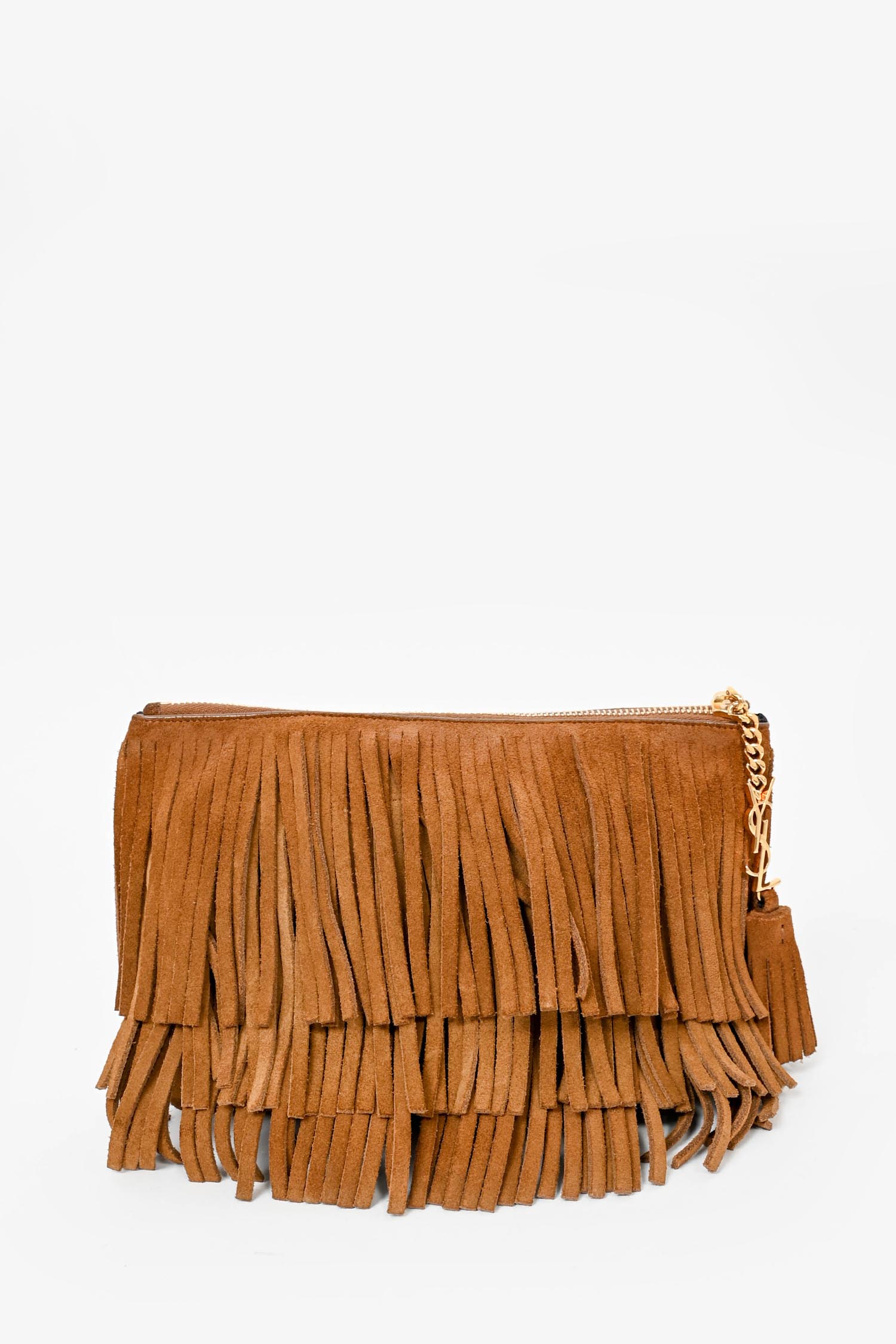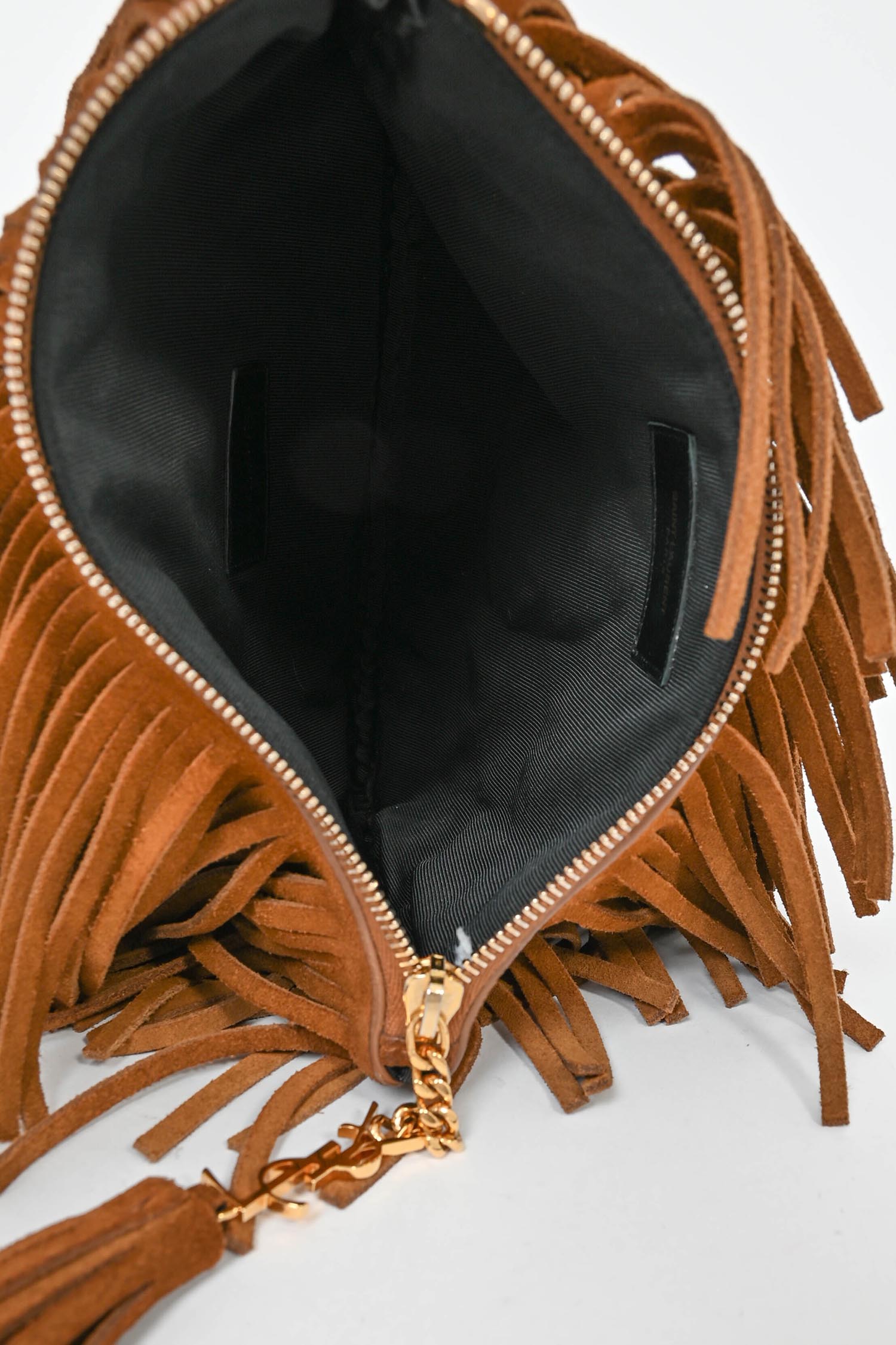 Refresh availabilitySaint Laurent Brown Suede Fringe Zip Pouch Clutch. Black textile interior lining.