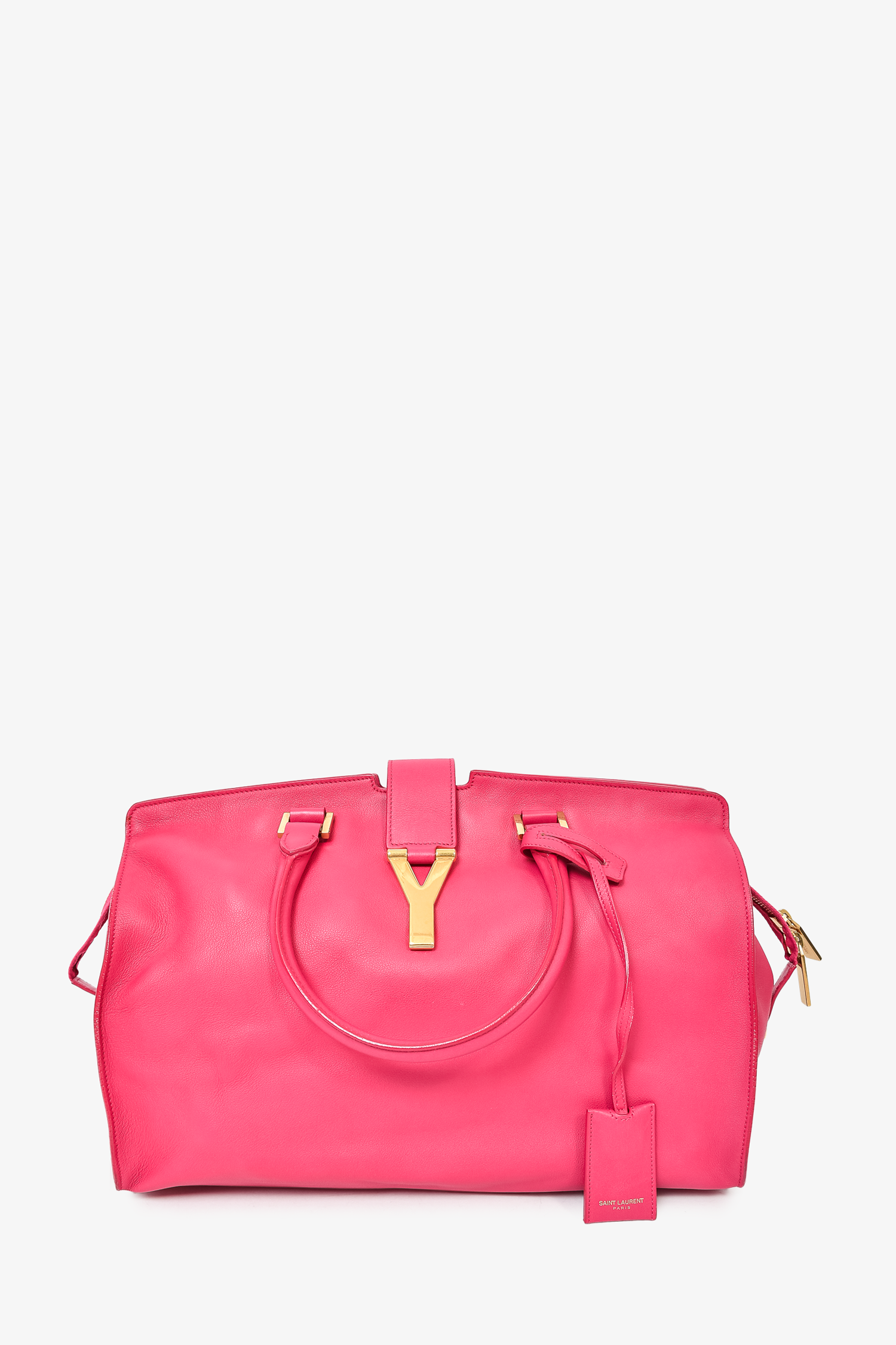 Refresh availabilitySaint Laurent Fuchsia Leather 'Y' Cabas Medium Tote. Twin rolled top handles. Top zip closure with magnetic 'Y' flap. Open interior. 2 interior slip pockets. 1 interior zippered pocket Protective bottom studs. Removable adjustable shoulder strap. Gold tone hardware. Tonal stitching.