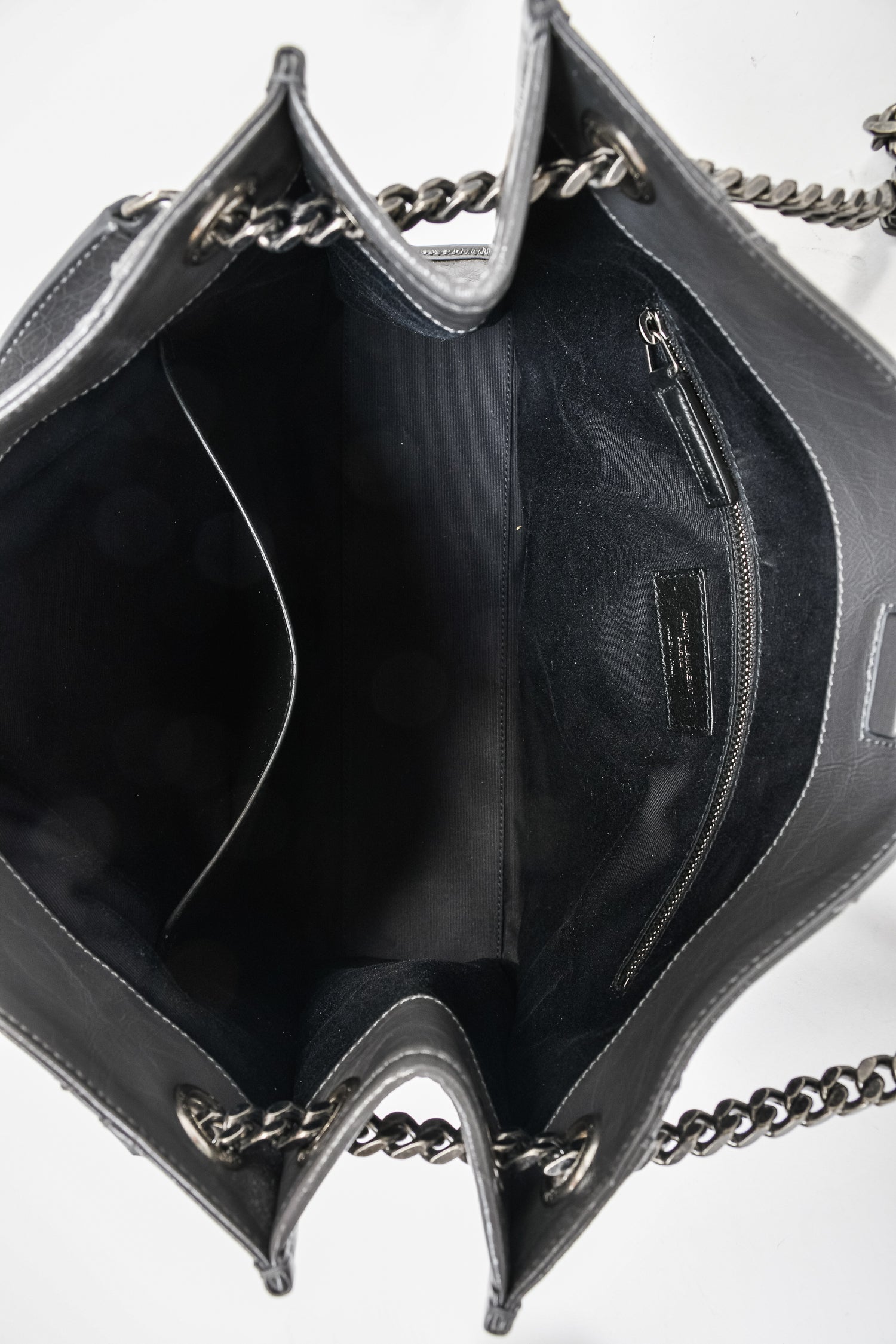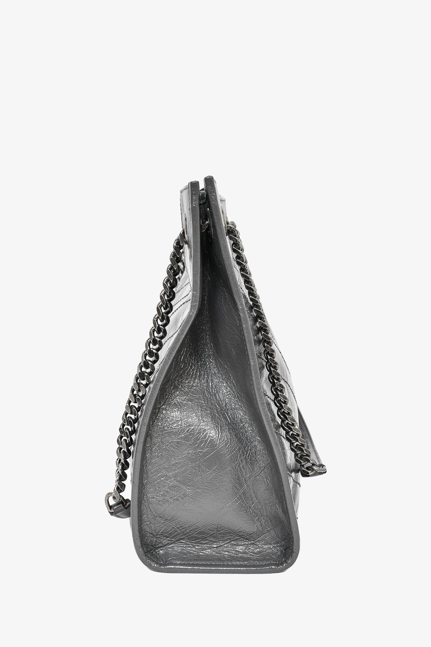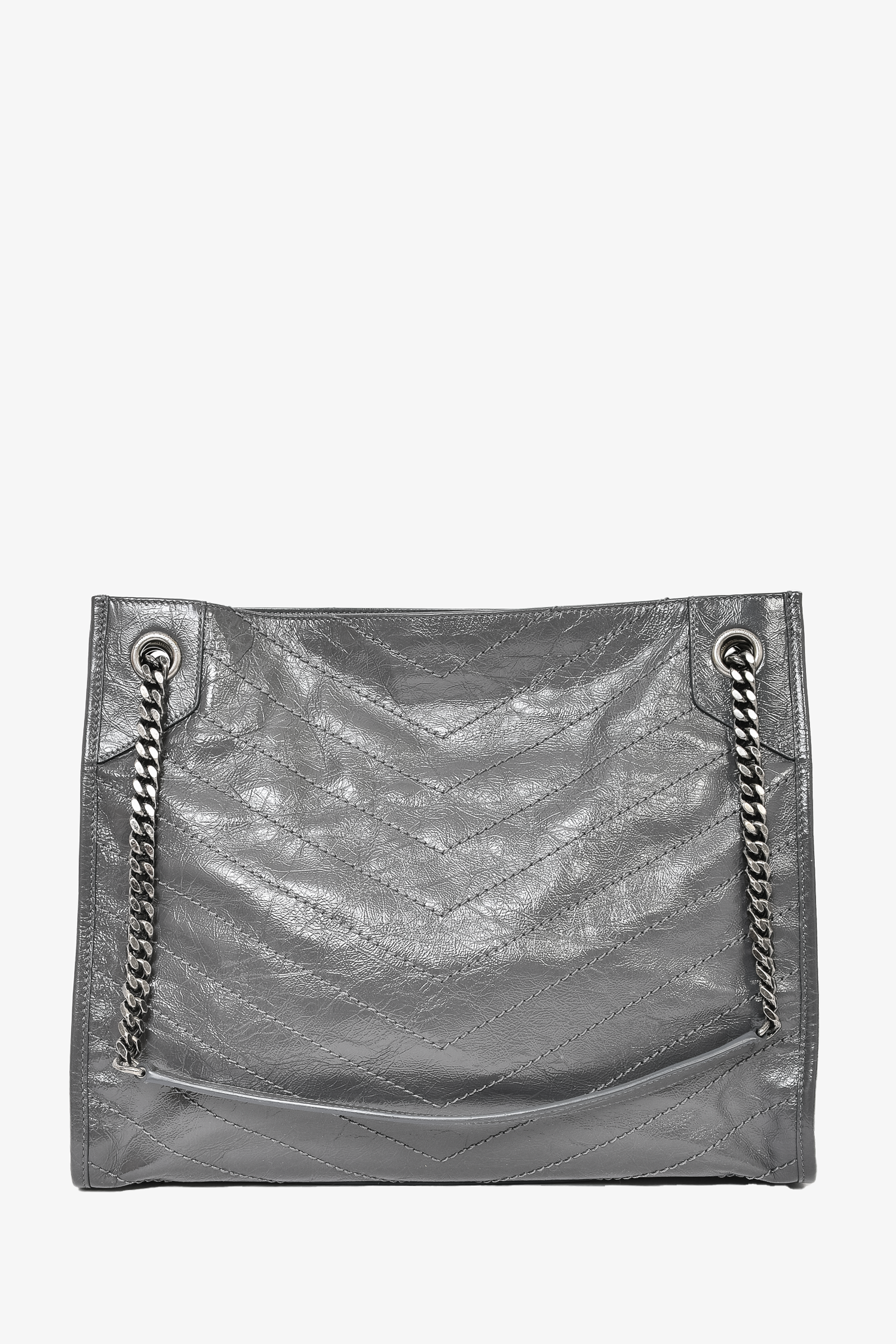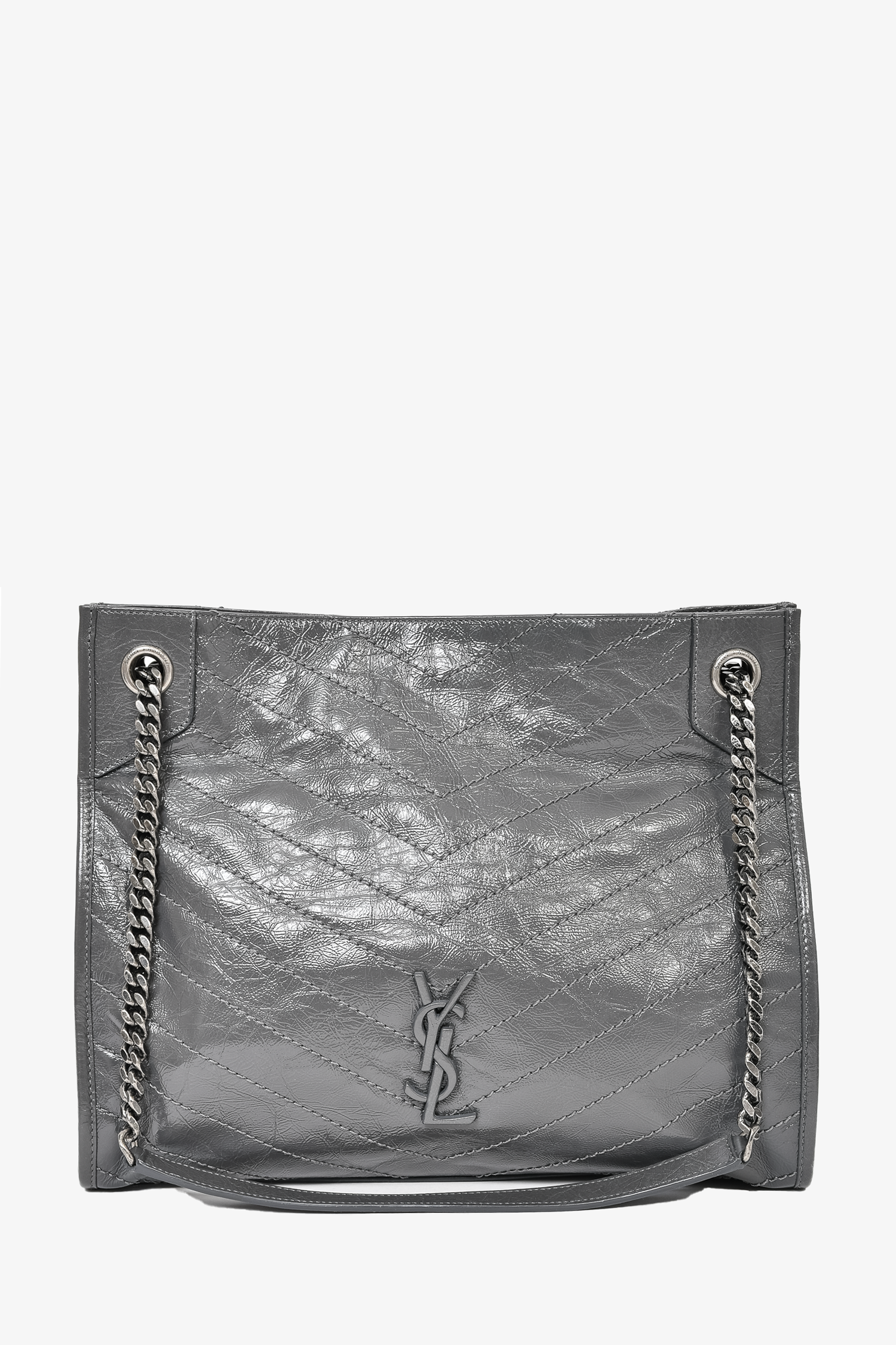 Refresh availabilitySaint Laurent Grey Crinkled Leather Large Niki Shopping Tote Bag. Interior magnetic button closure. Black textile interior lining. 2 interior wall pockets; 1 slip and 1 with zip closure. Slide-around chain. Silver-tone hardware. Tonal stitching.