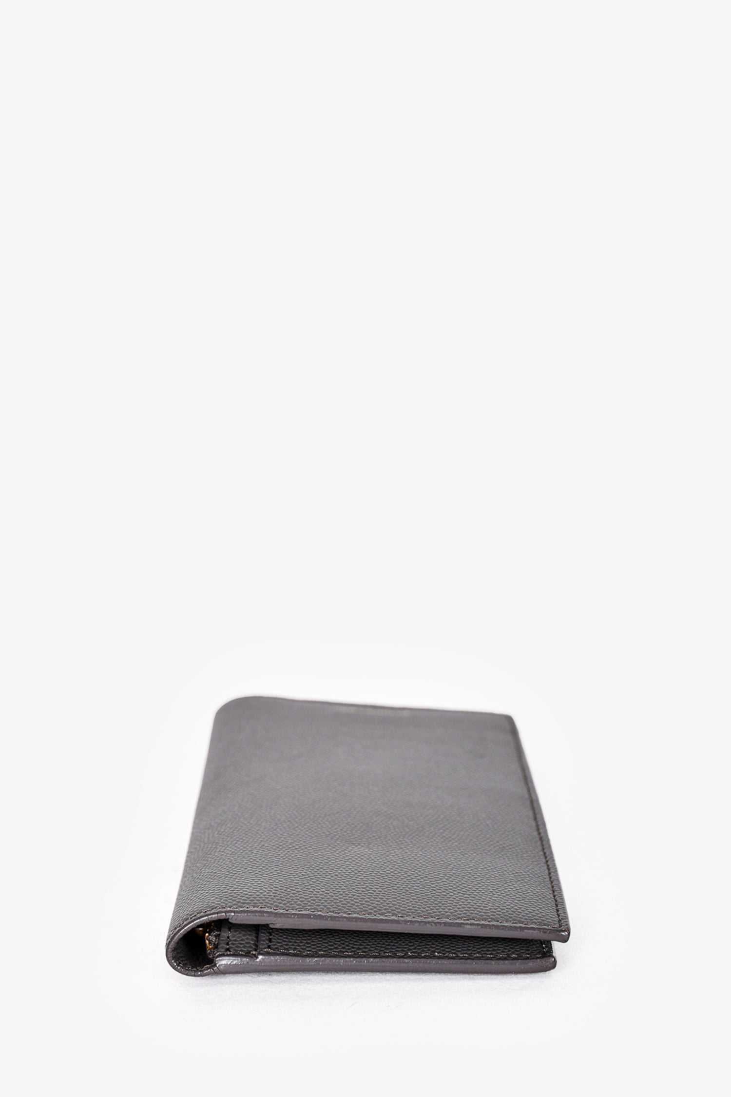 Refresh availabilitySaint Laurent Grey Grain de Poudre Leather Vertical Continental Bifold Wallet. 14 card slots. 4 interior bill fold compartments. 1 interior zip pockets. Tonal stitching. Gold tone hardware.