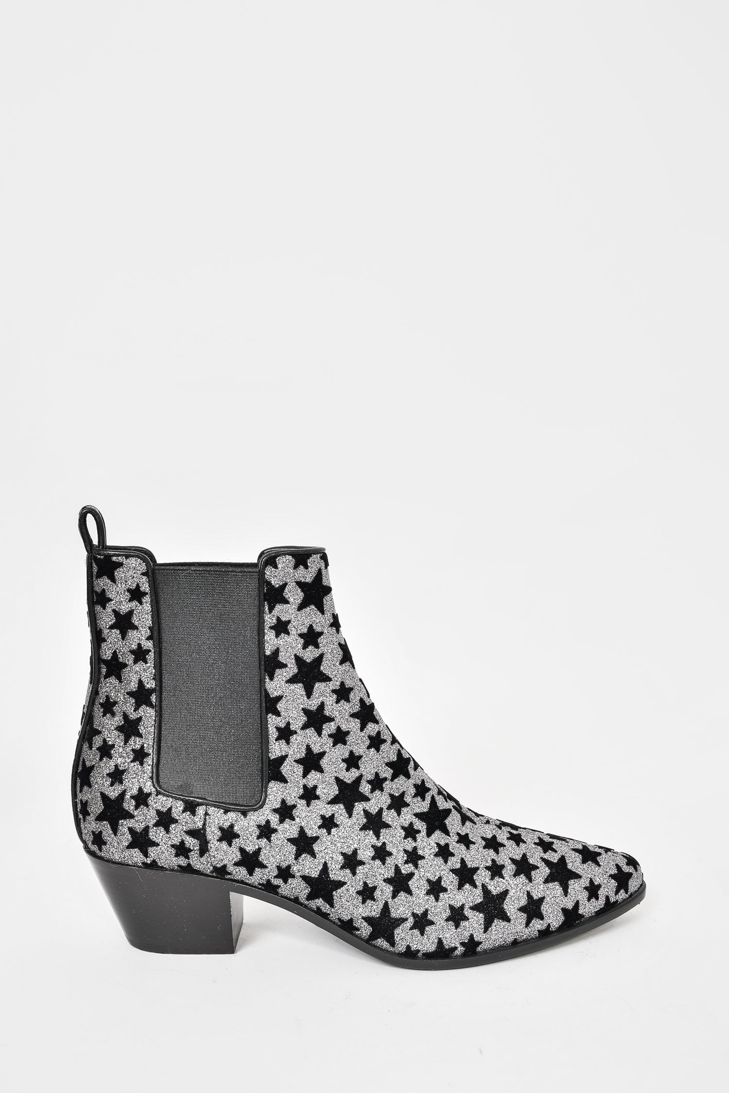 Refresh availabilitySaint Laurent Grey Star Glitter Boots. Pointed toe. Pull-on. Elasticized trims on the sides. Tonal stitching.