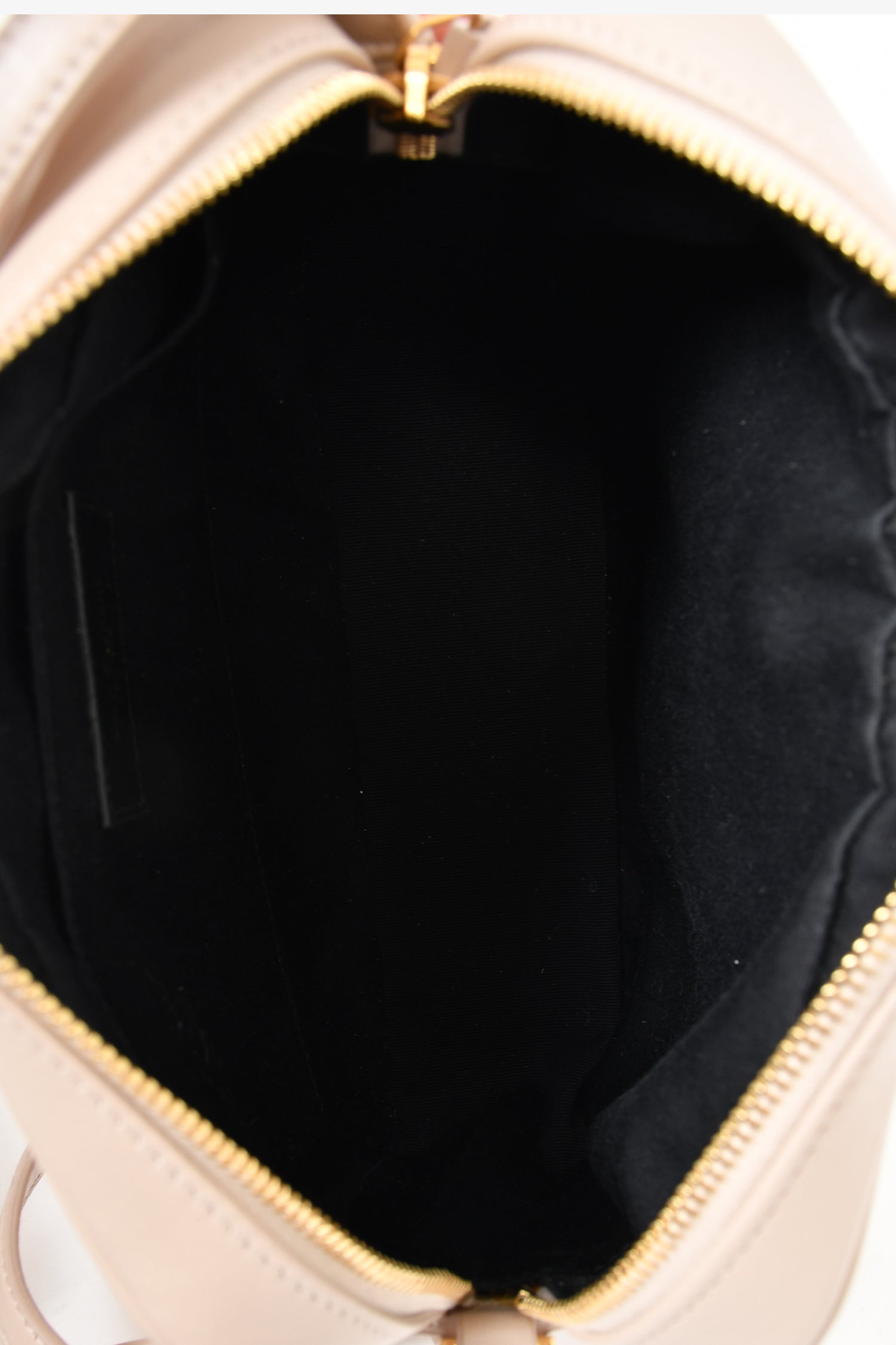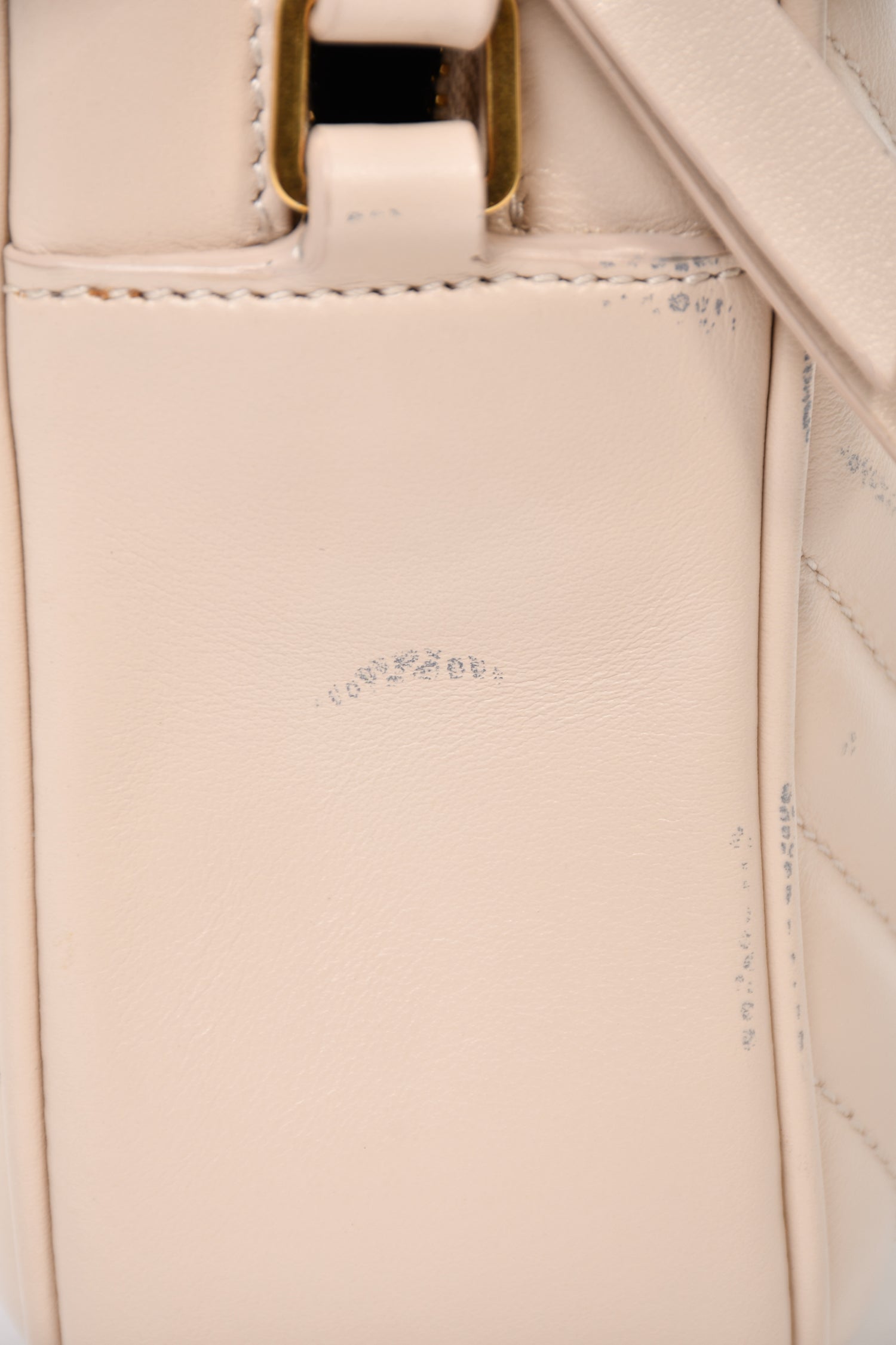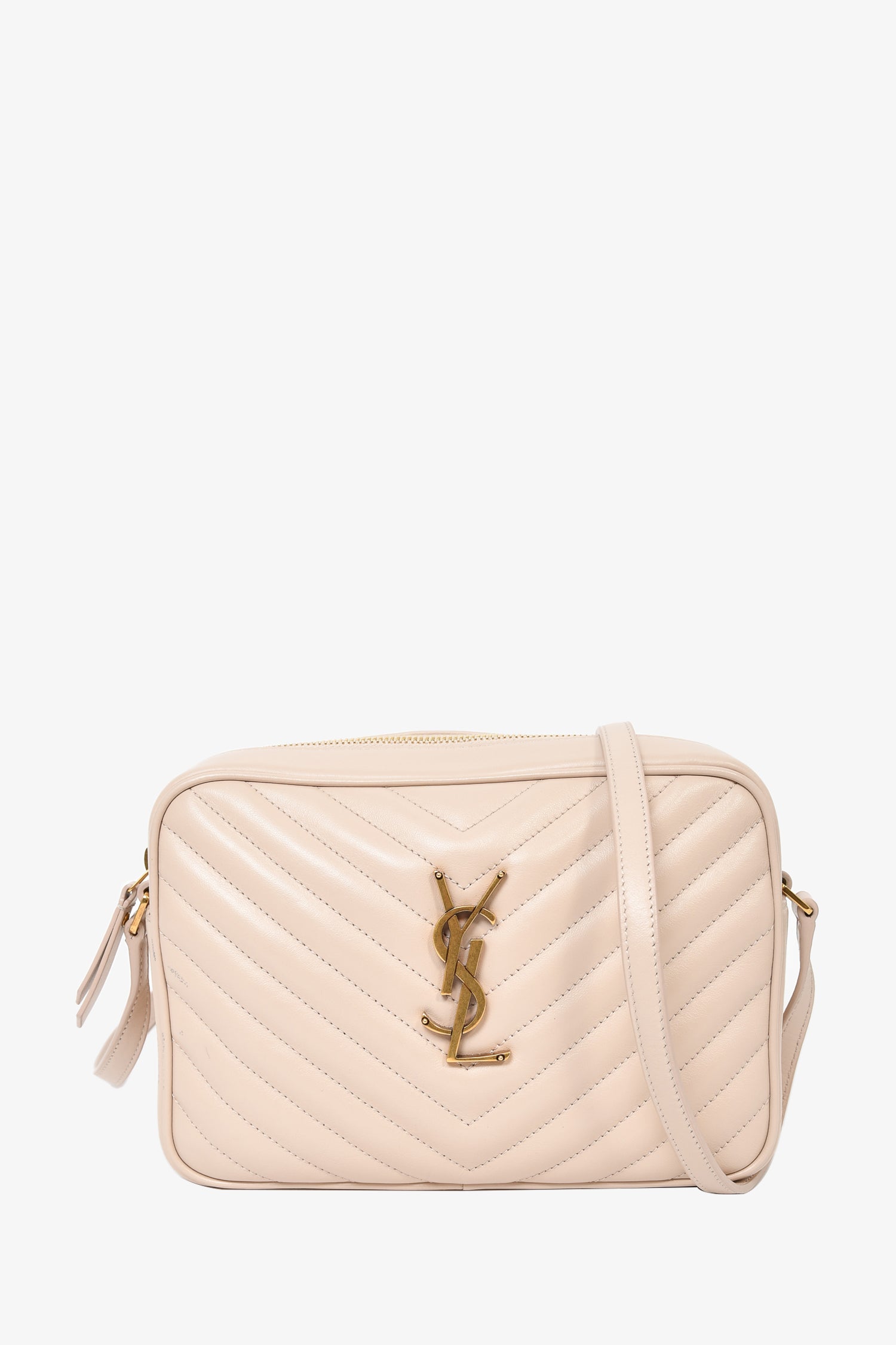 Refresh availabilitySaint Laurent Light Pink Chevron Leather 'Lou' Camera Crossbody. Top zip-closure. Adjustable strap. One interior slip pocket. Fringe detail on the strap. Gold-toned hardware. Tonal stitching.