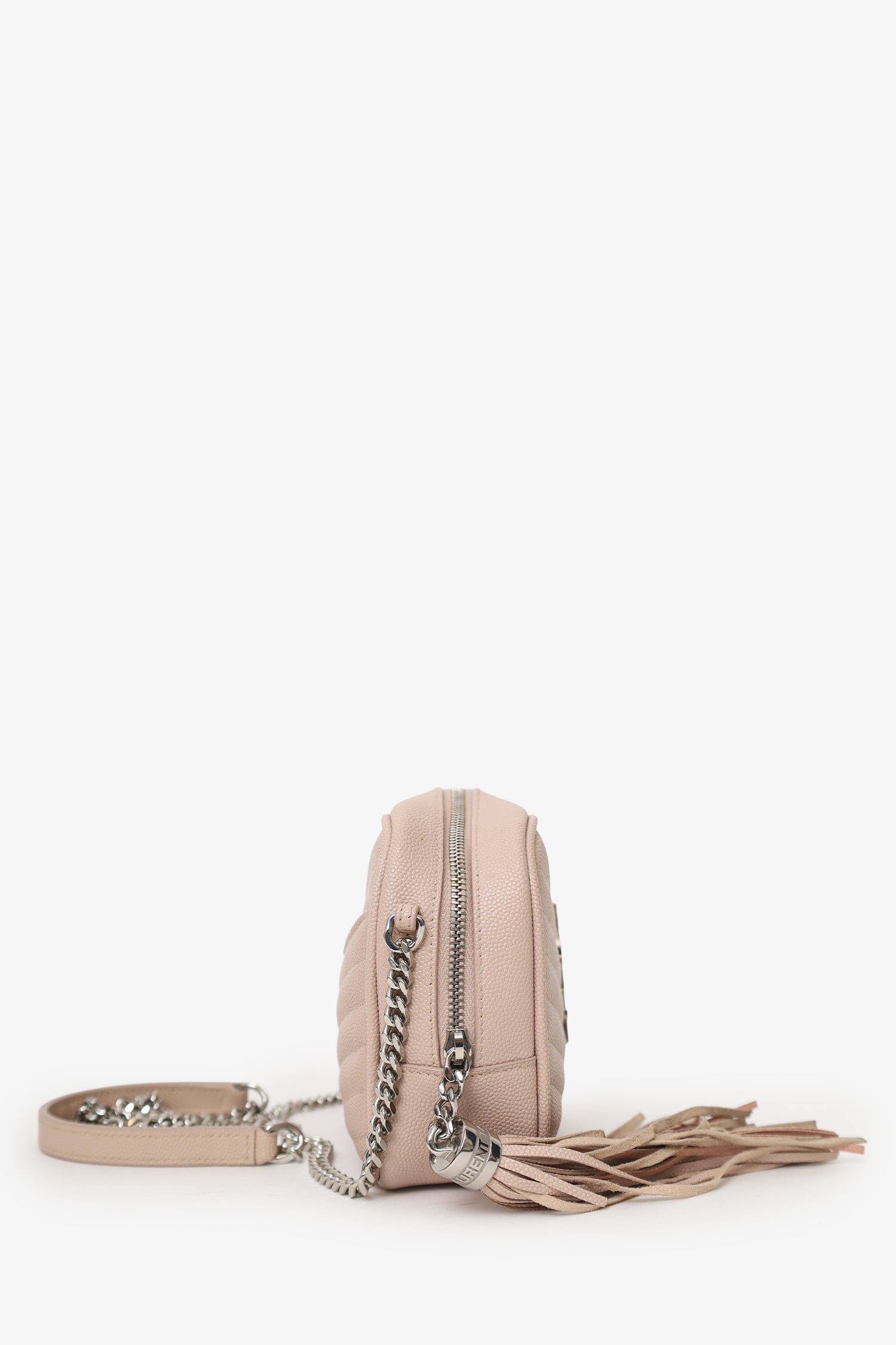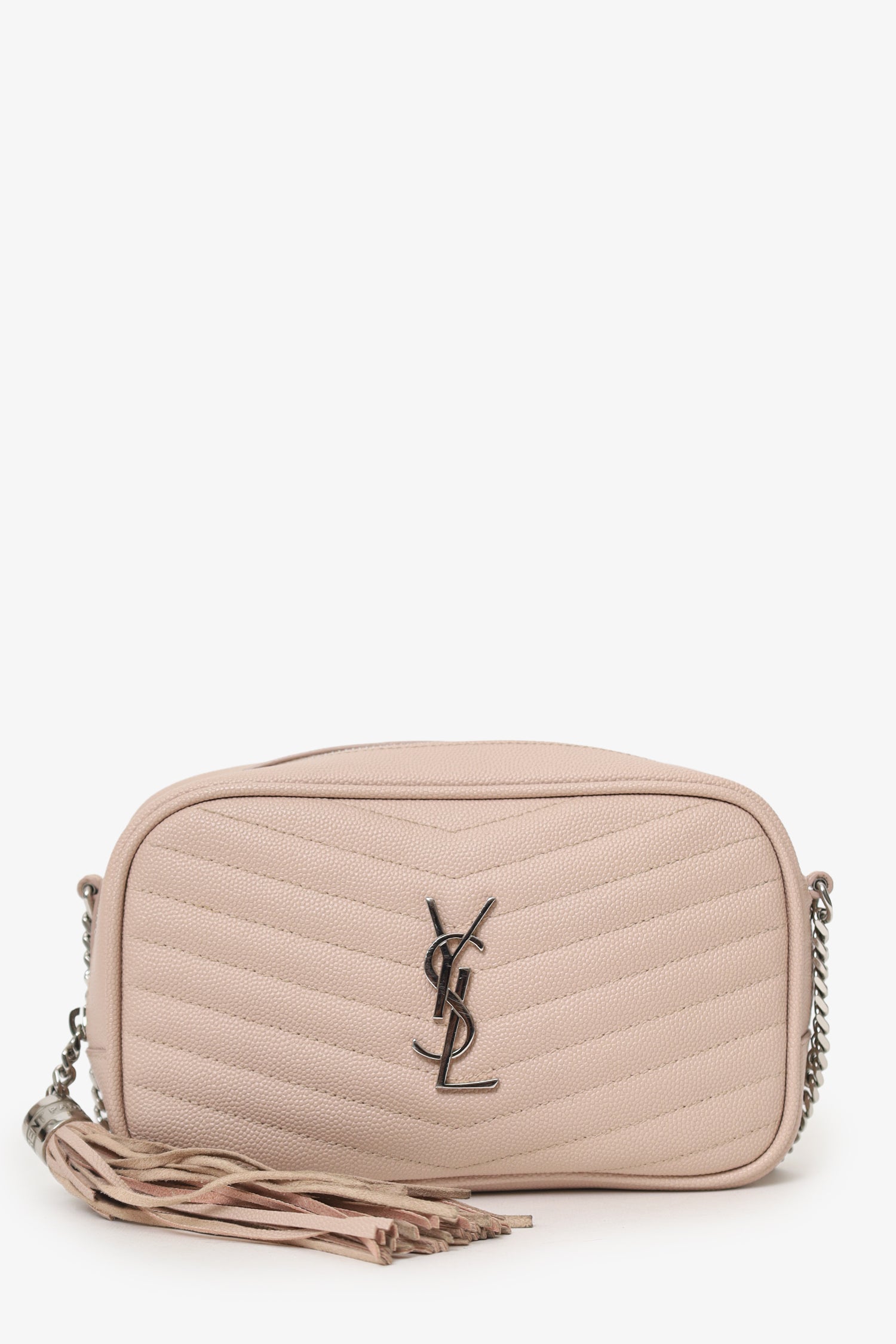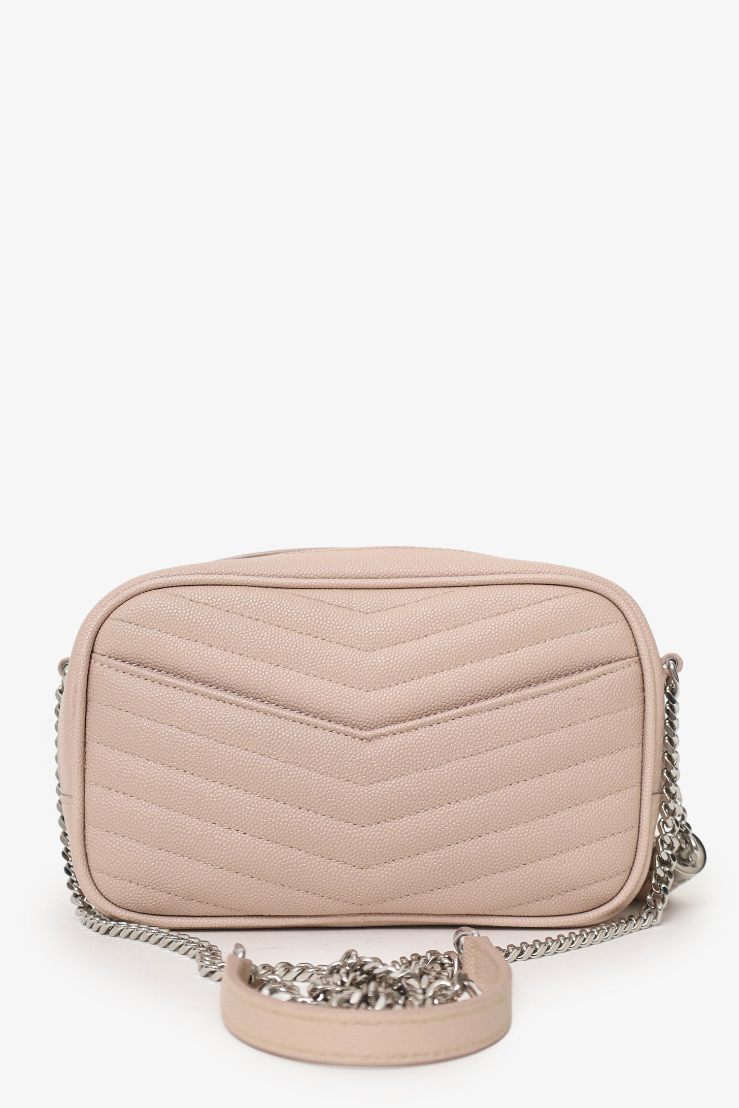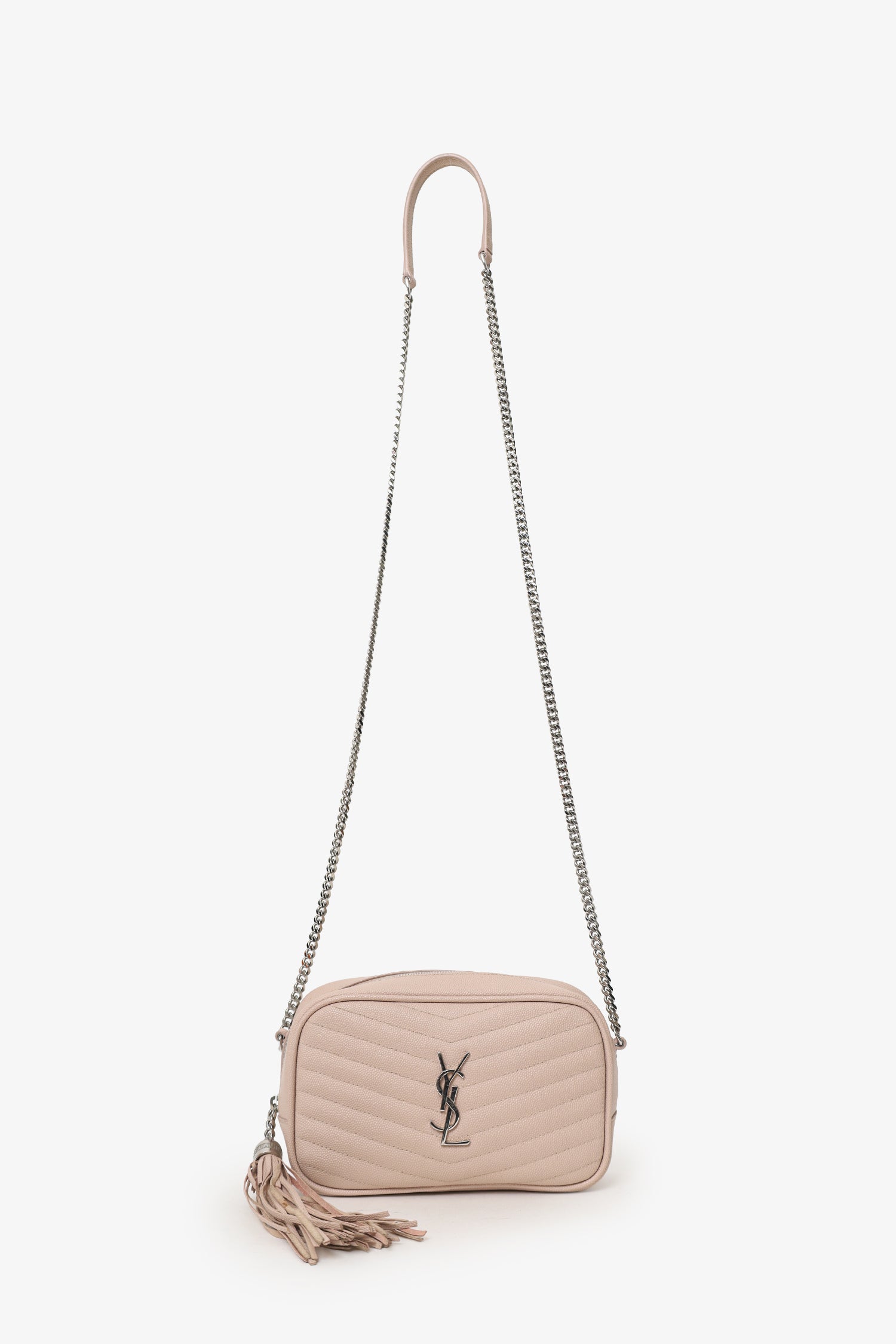 Refresh availabilitySaint Laurent Light Pink Grained Leather Mini Lou Camera Bag. Top zip closure. Chain link crossbody strap. Back exterior slip pocket. Leather-lined interior. 3 interior wall slip compartments. Silver-tone hardware. Tonal stitching.