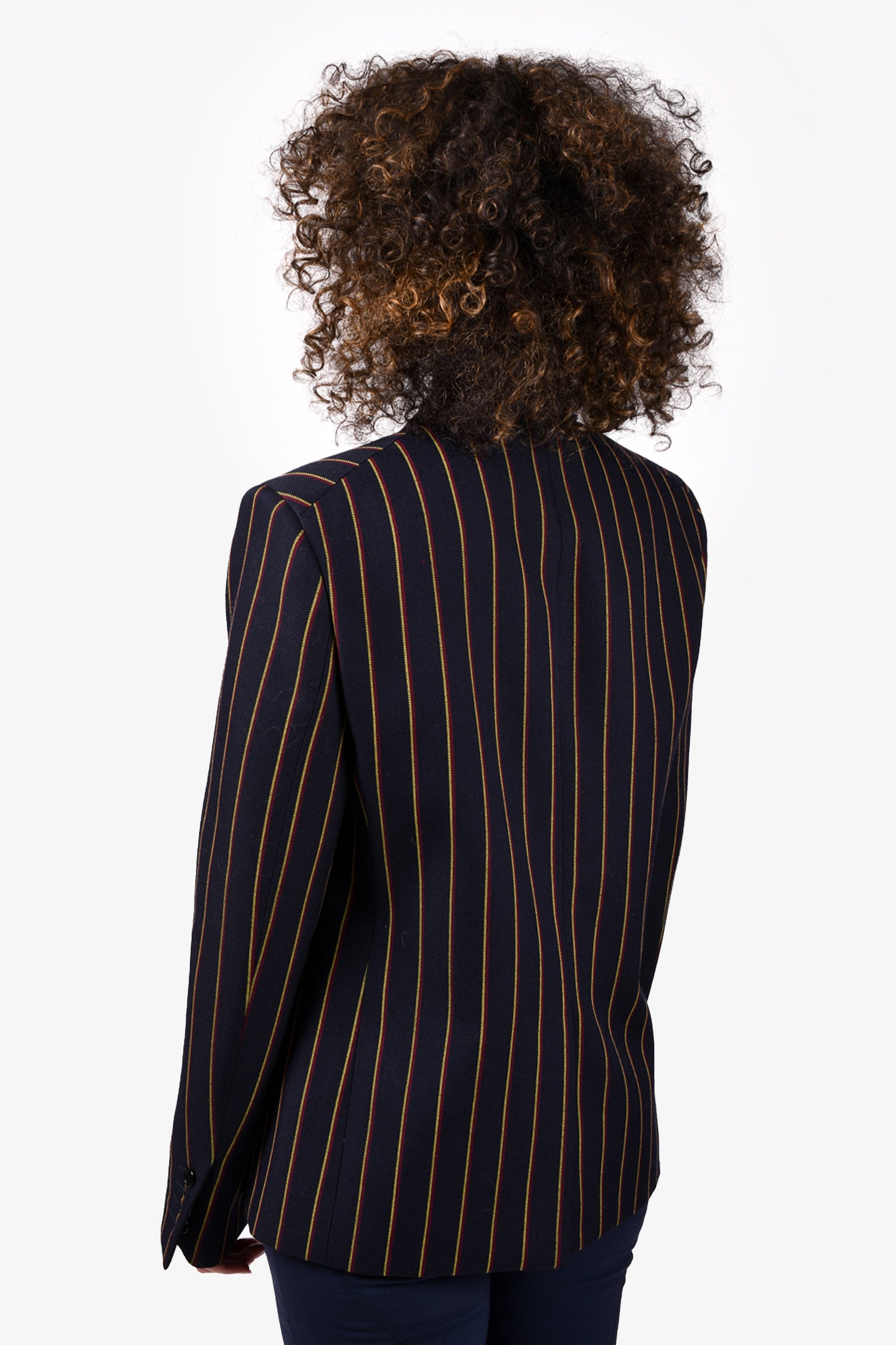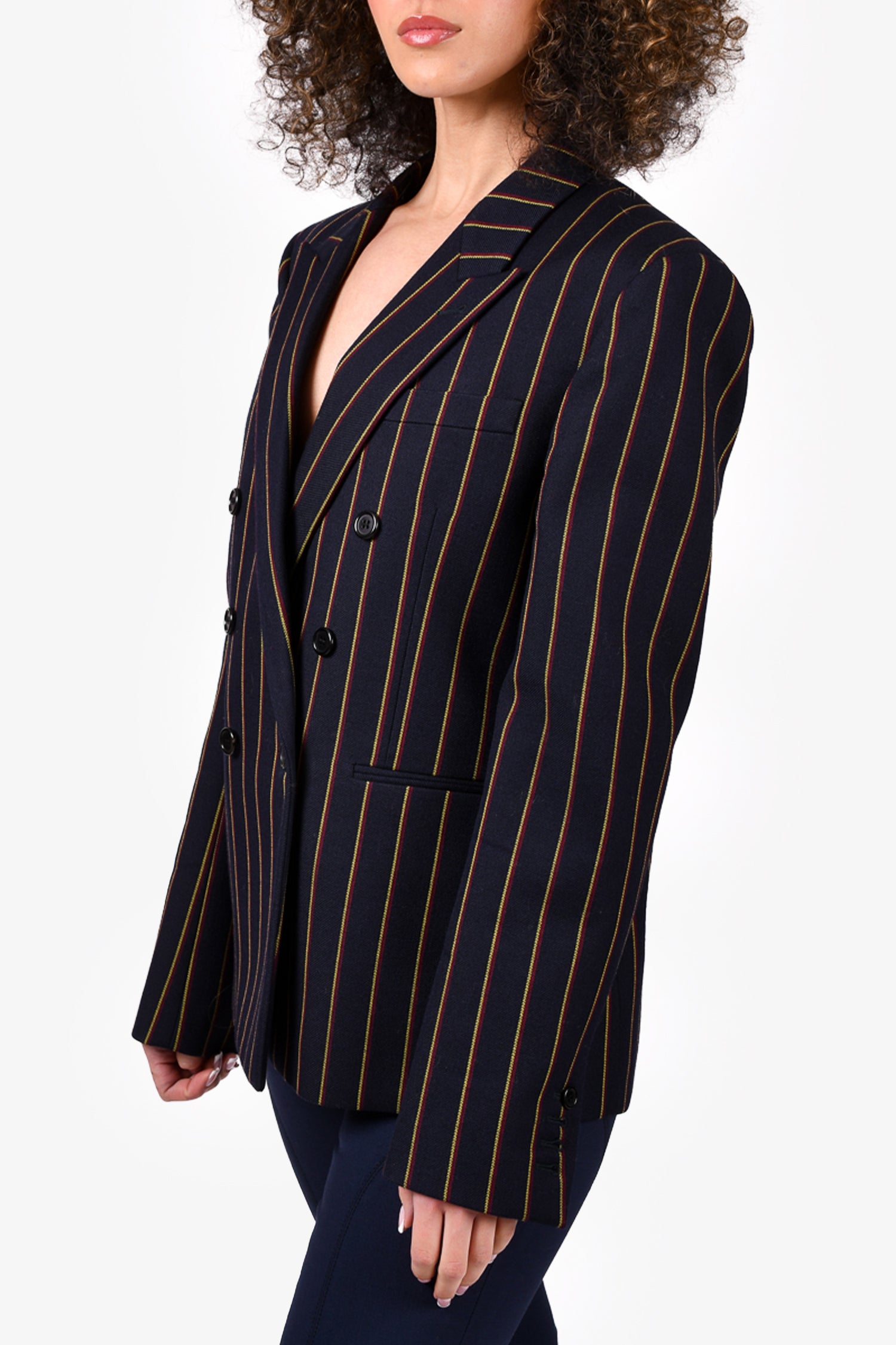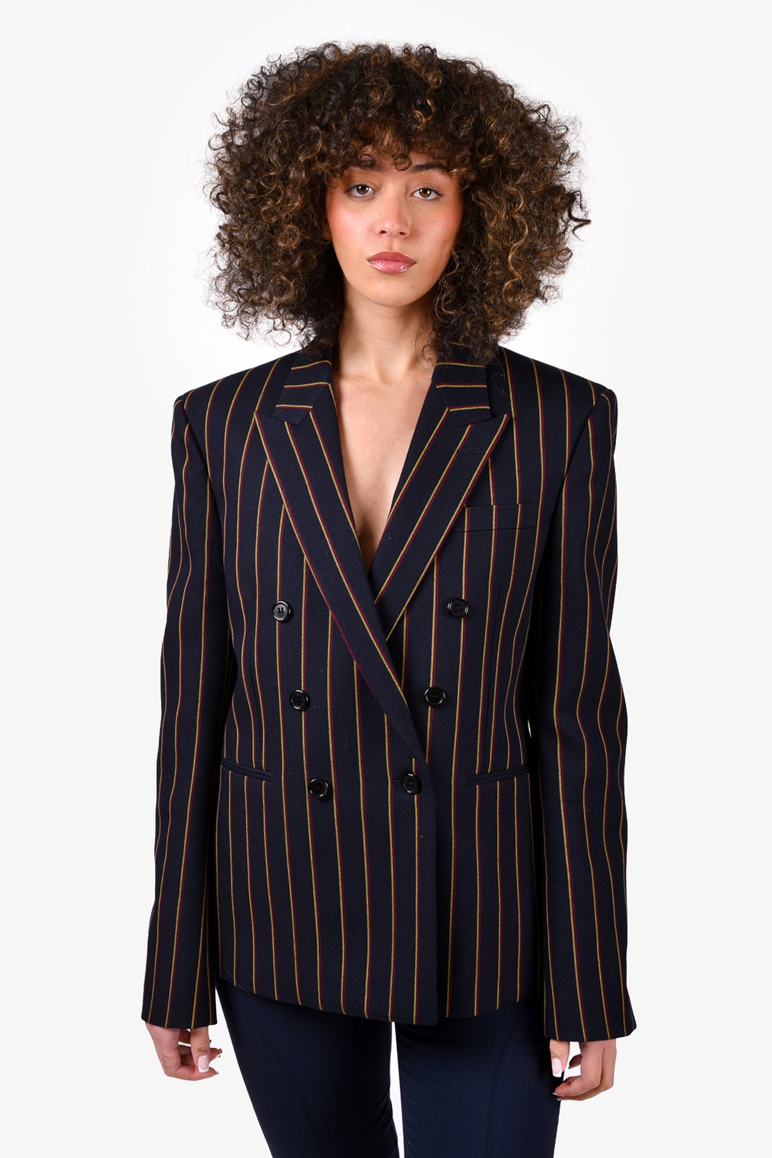 Refresh availabilitySaint Laurent Navy Striped Double Breasted Blazer. Front button-up closure. Front pockets. Lined. Padded shoulders. Tonal stitching.