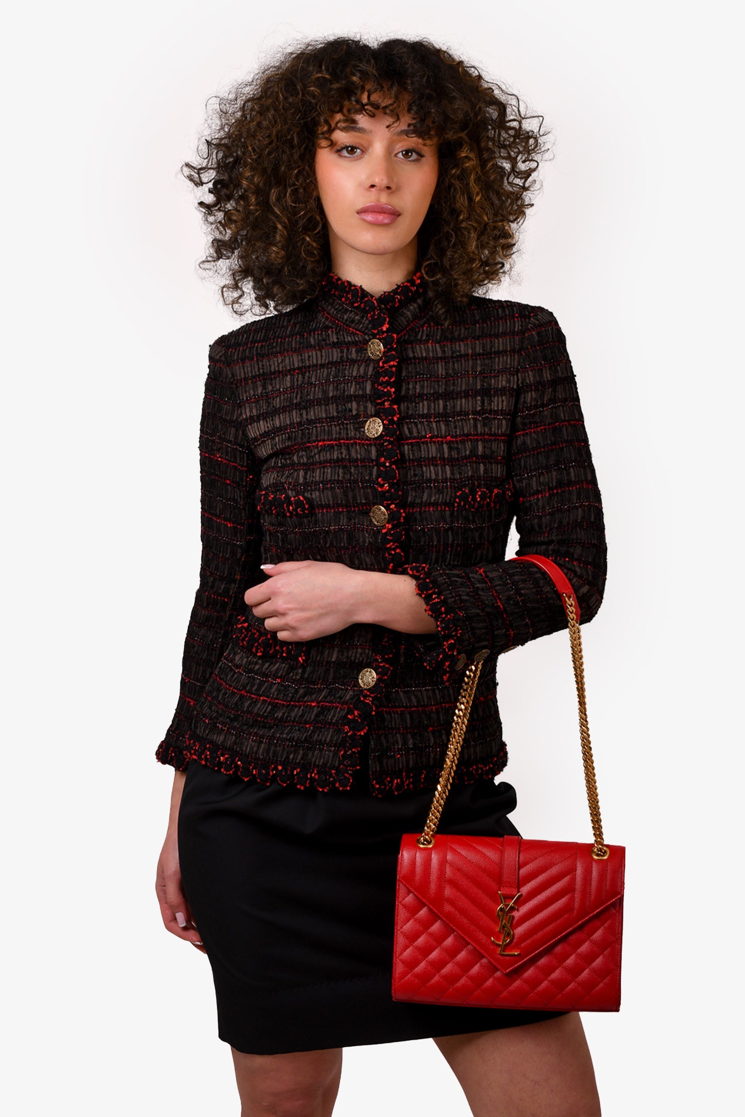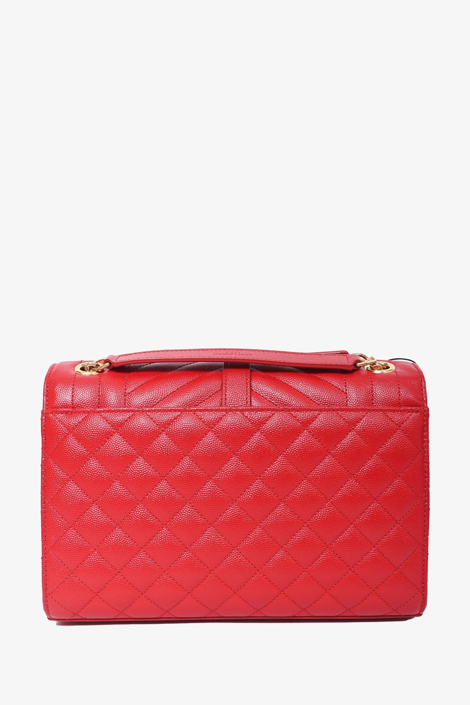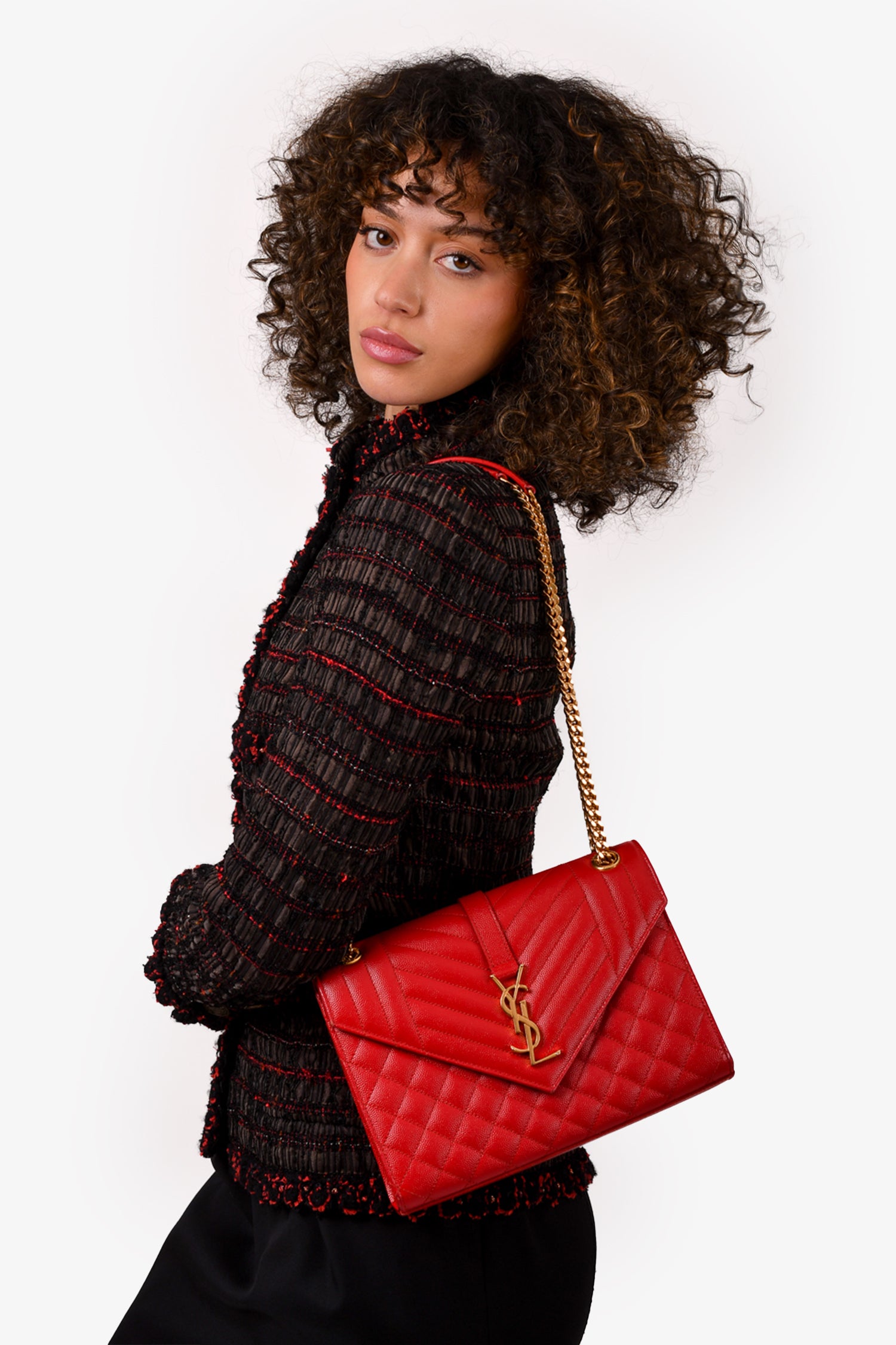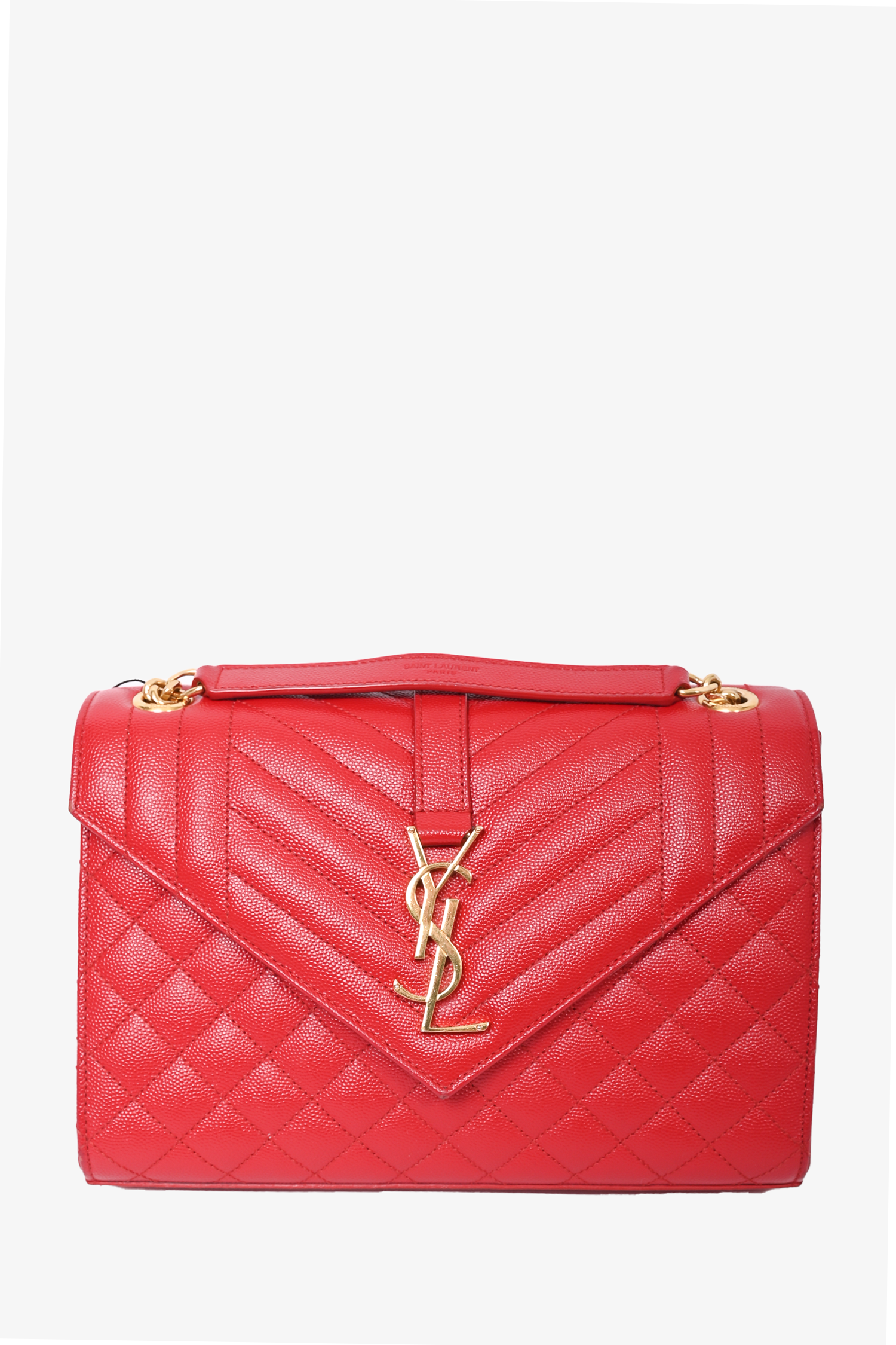 Refresh availabilitySaint Laurent Red Grained Leather Medium Quilted Envelope Bag. Front fold-over flap with magnetic button closure. Black textile interior lining. Single interior wall slip pocket. Slide-around chain top handle. Gold-tone hardware. Tonal stitching.