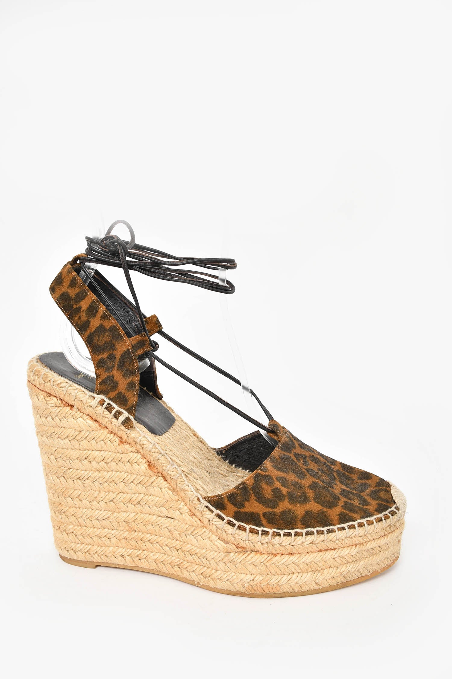Refresh availabilitySaint Laurent Suede Cheetah Print Espadrille Wedge Heel. Slip-on. Ankle strap closure. Tonal stitching.