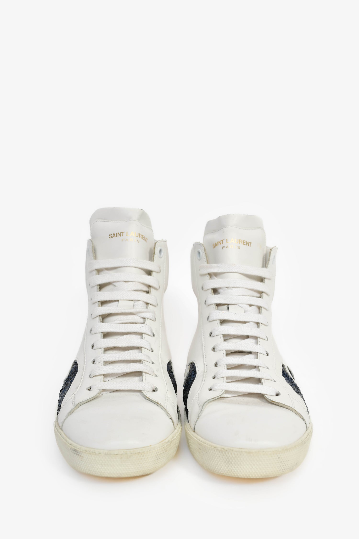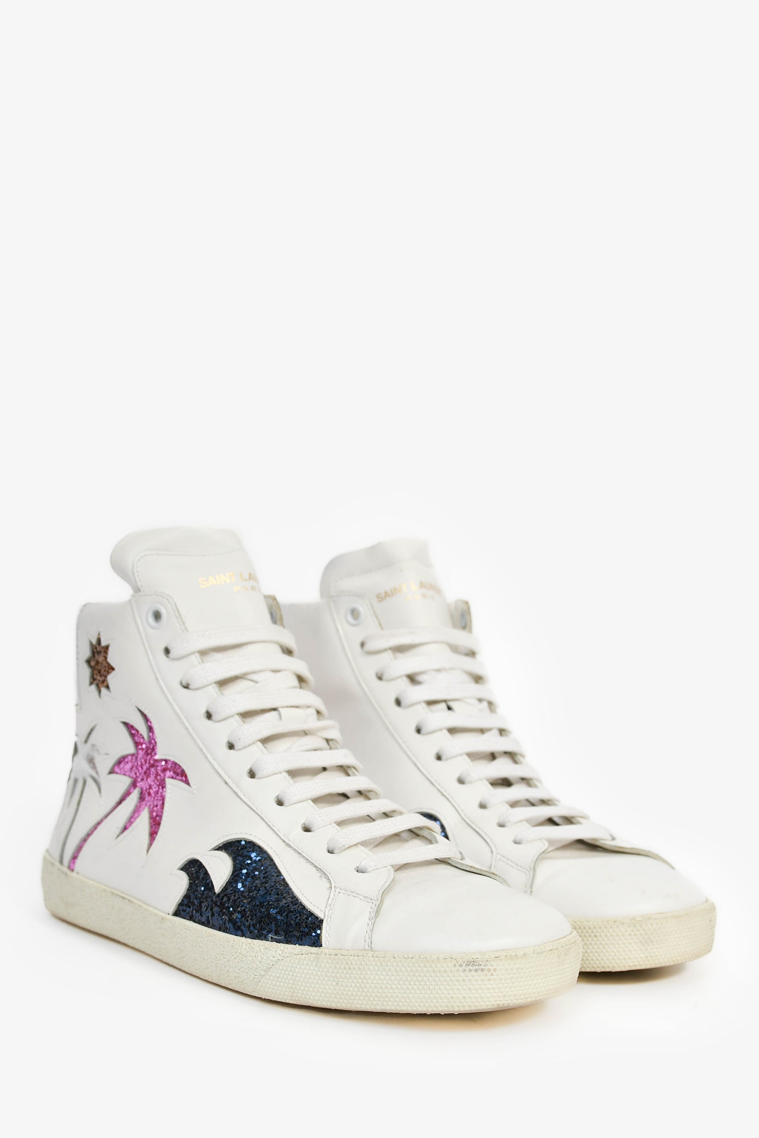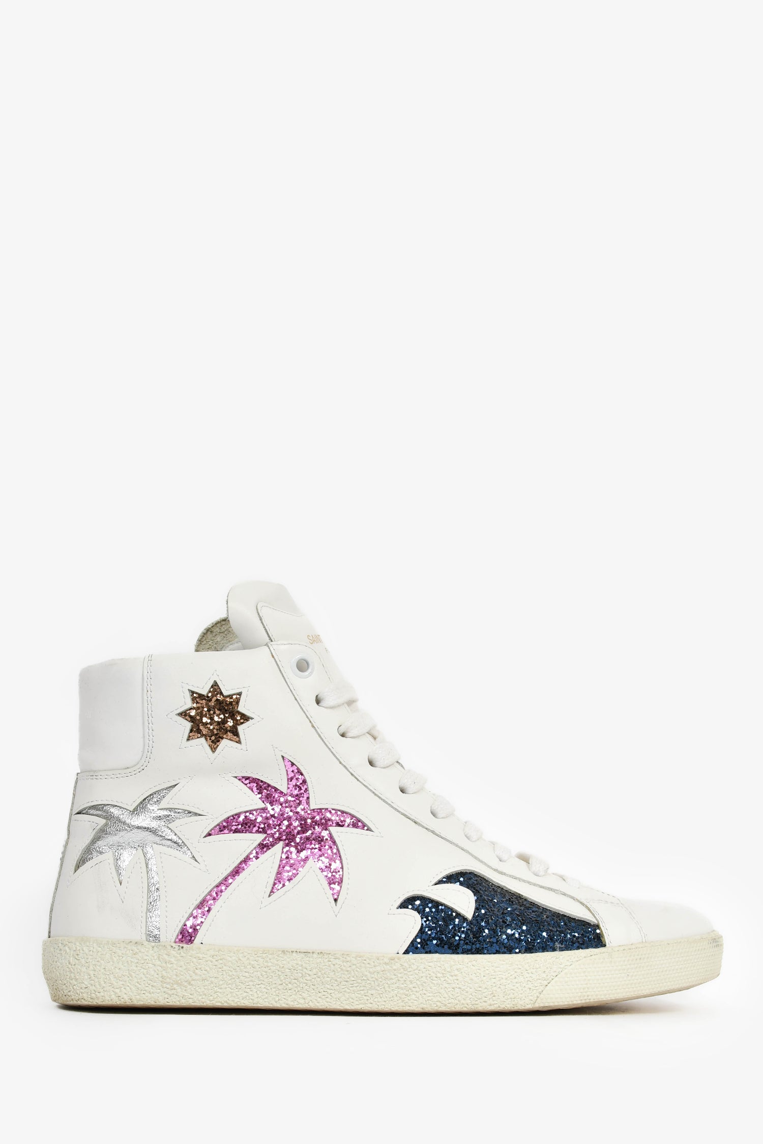 Refresh availabilitySaint Laurent White Leather 'Signature Palm Glitter' Sneakers. Round toe. Front lace-up closure. Tonal stitching.