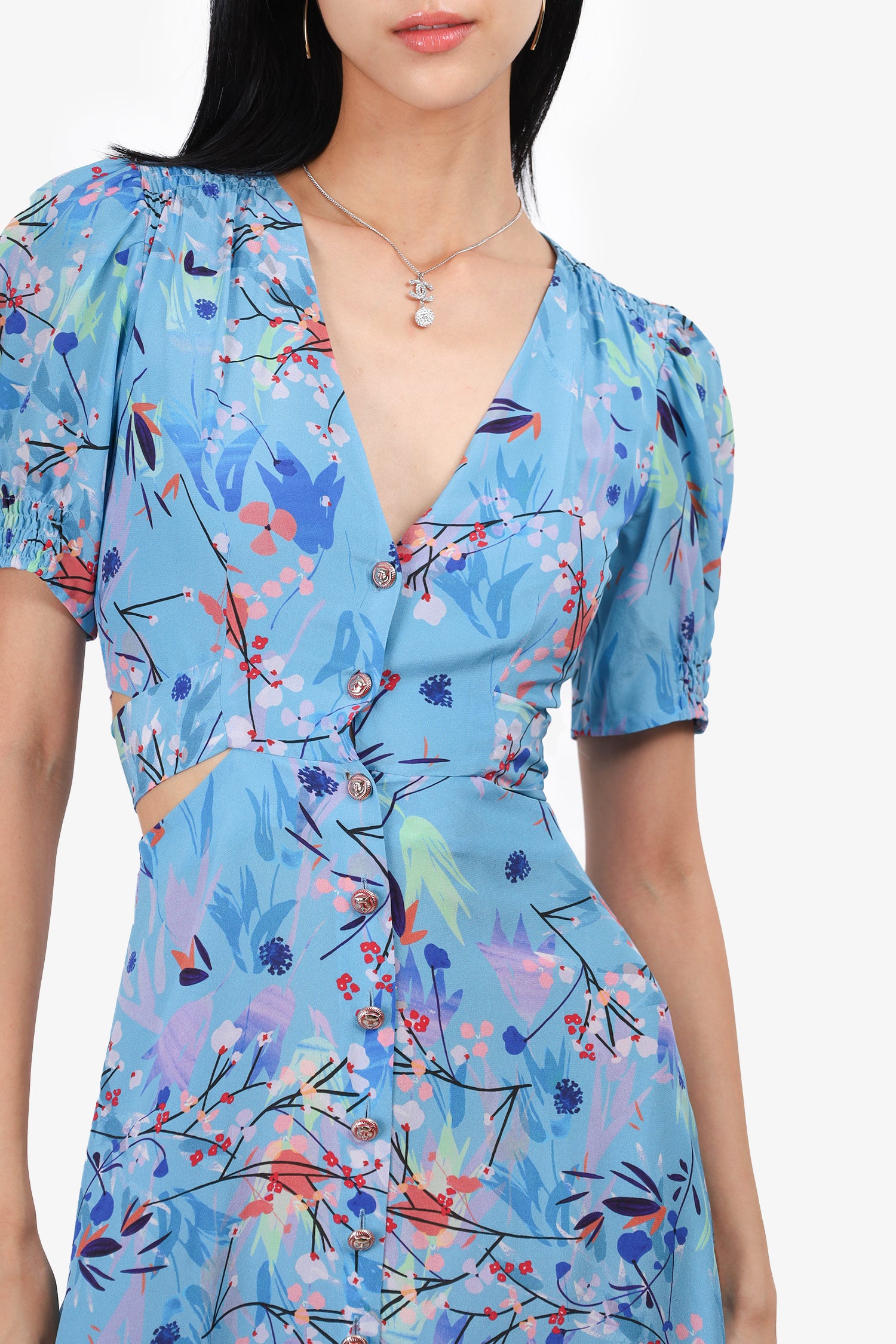 Refresh availabilitySaloni Blue Floral Cutout Dress. V-neckline. Front button-up closure. Wrap around tie-up closure. Side cutouts. Elasticated/cinched sleeve cuffs with button detail. Partially lined. Tonal stitching. Silver-tone hardware.