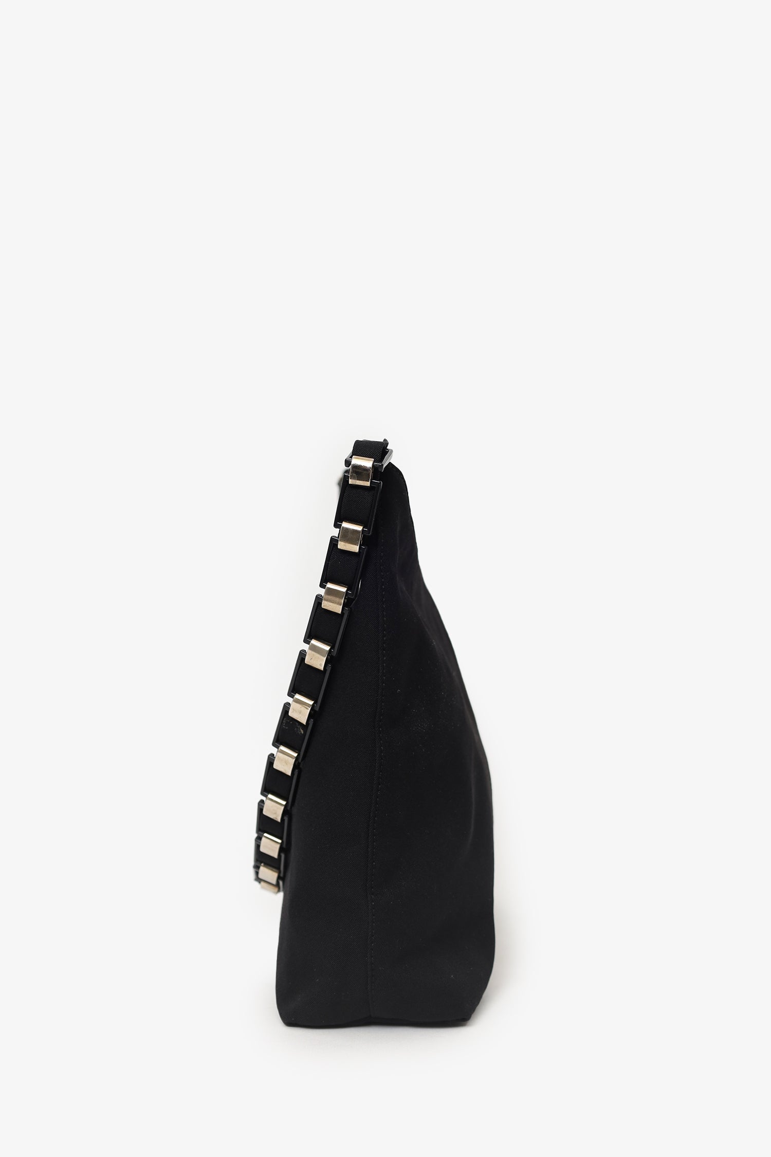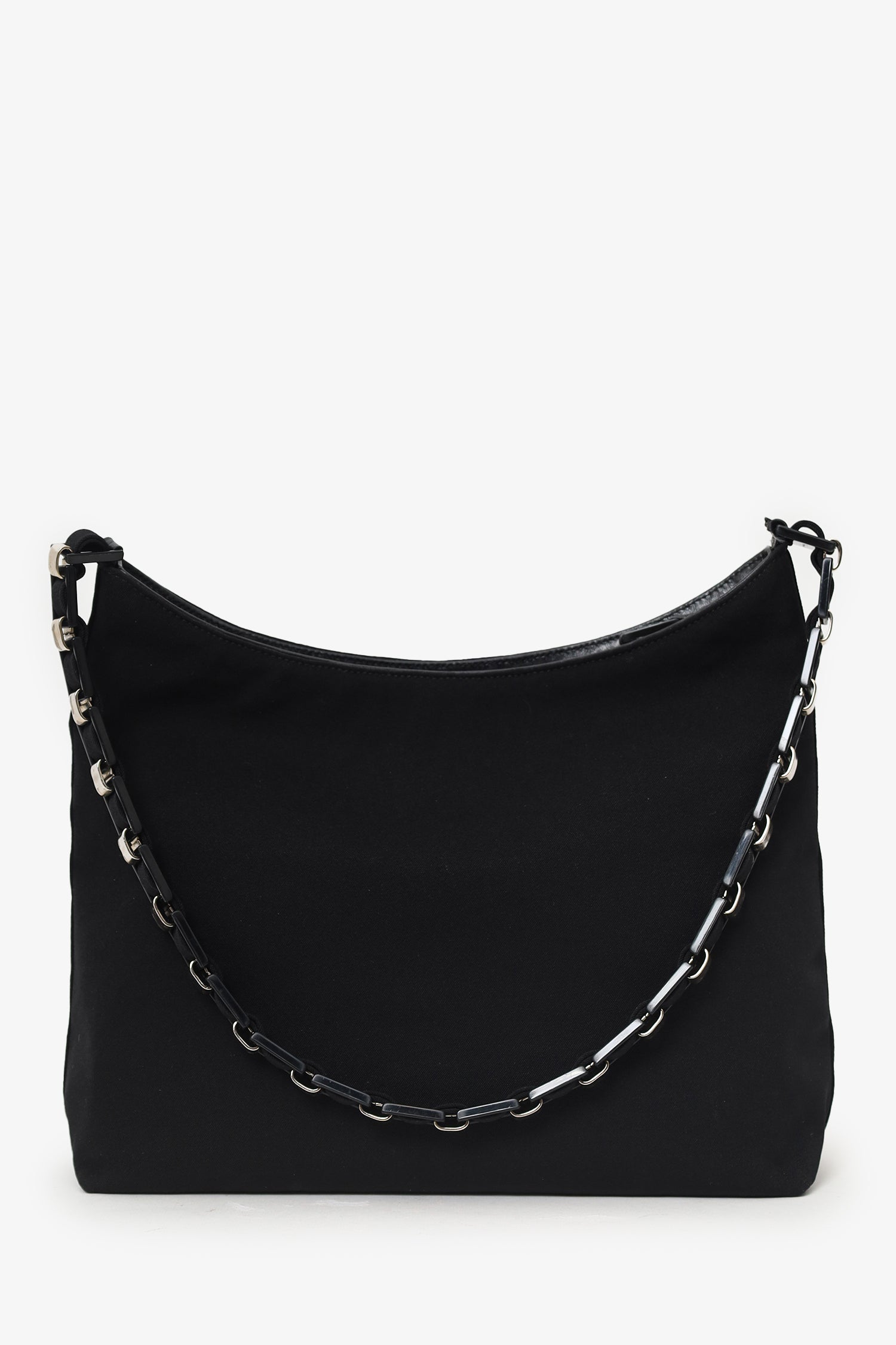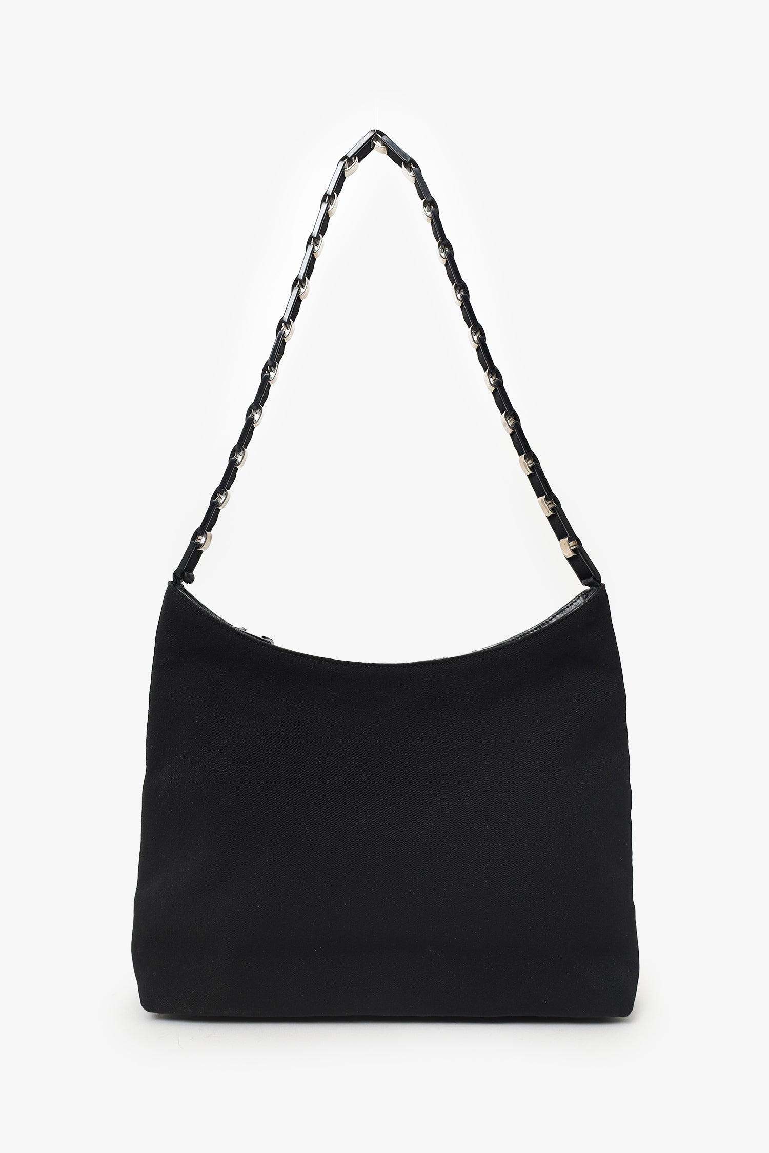Refresh availabilitySalvatore Ferragamo Black Canvas Chain Link Shoulder Bag. Top zip closure. Top shoulder strap. Lined interior. Single interior zip pocket. Silver-tone hardware. Tonal stitching.