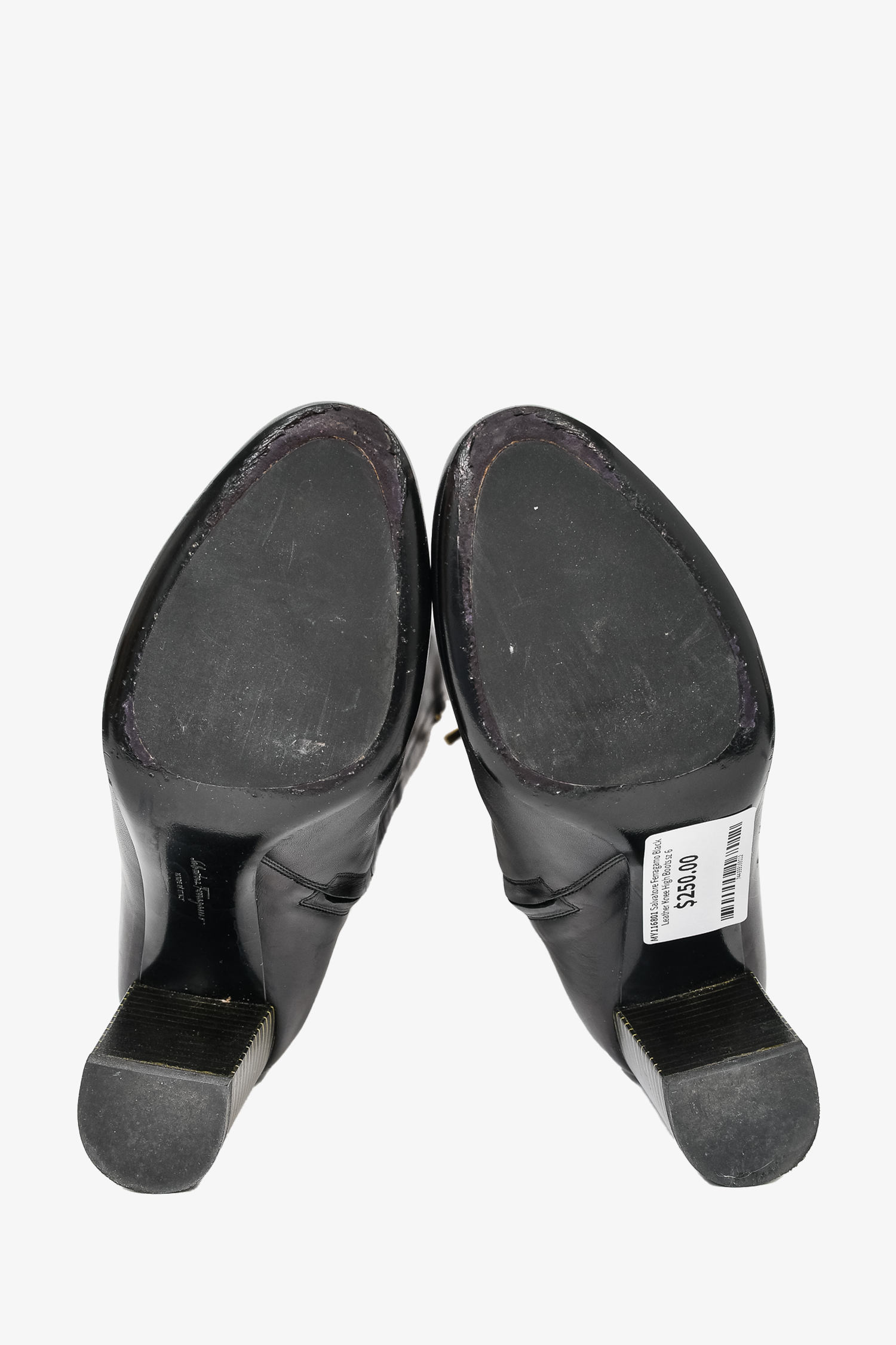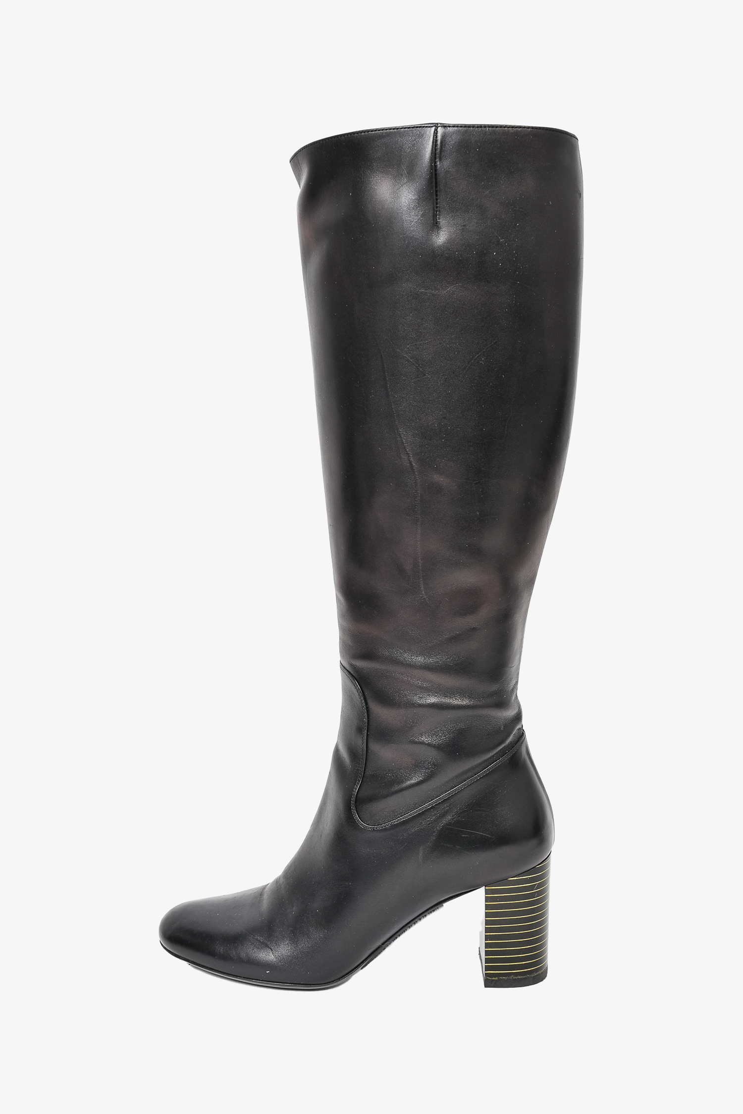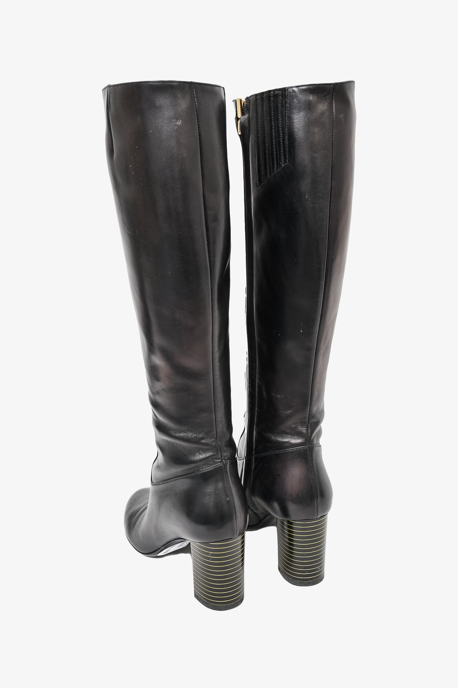 Refresh availabilitySalvatore Ferragamo Black Leather Knee High Boots. Side zipper closure. Rounded toe. Gold tone hardware. Tonal stitching.