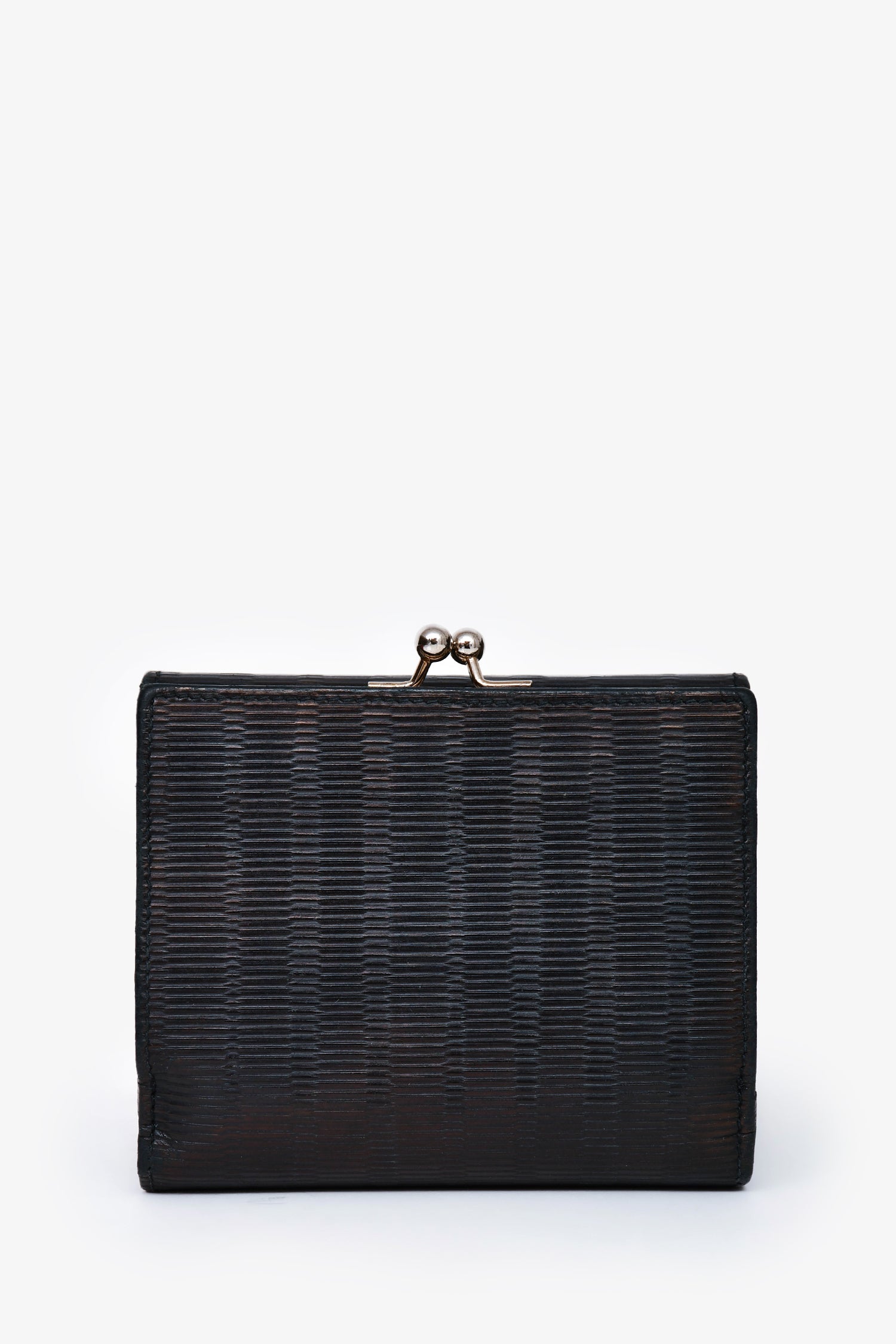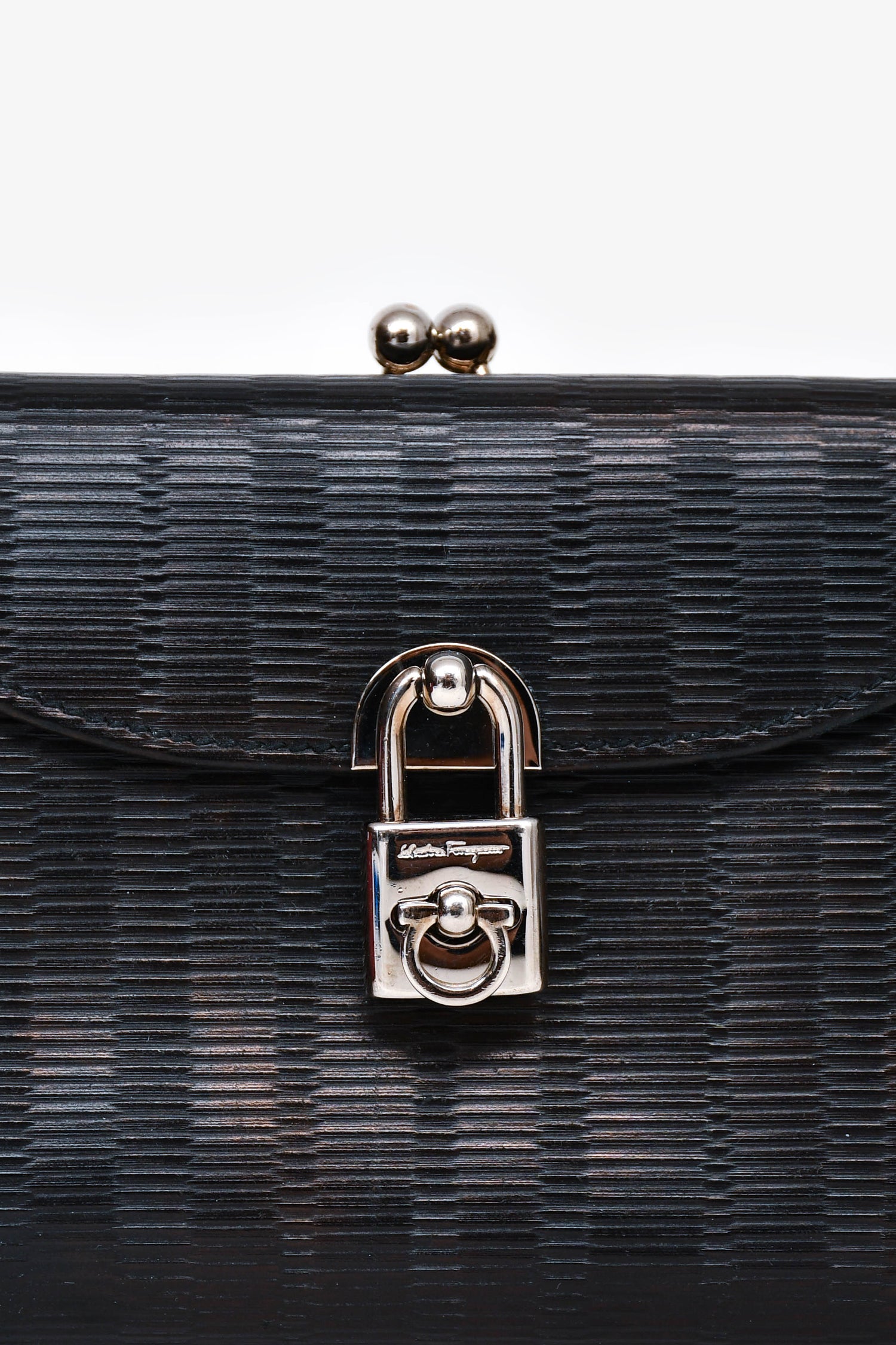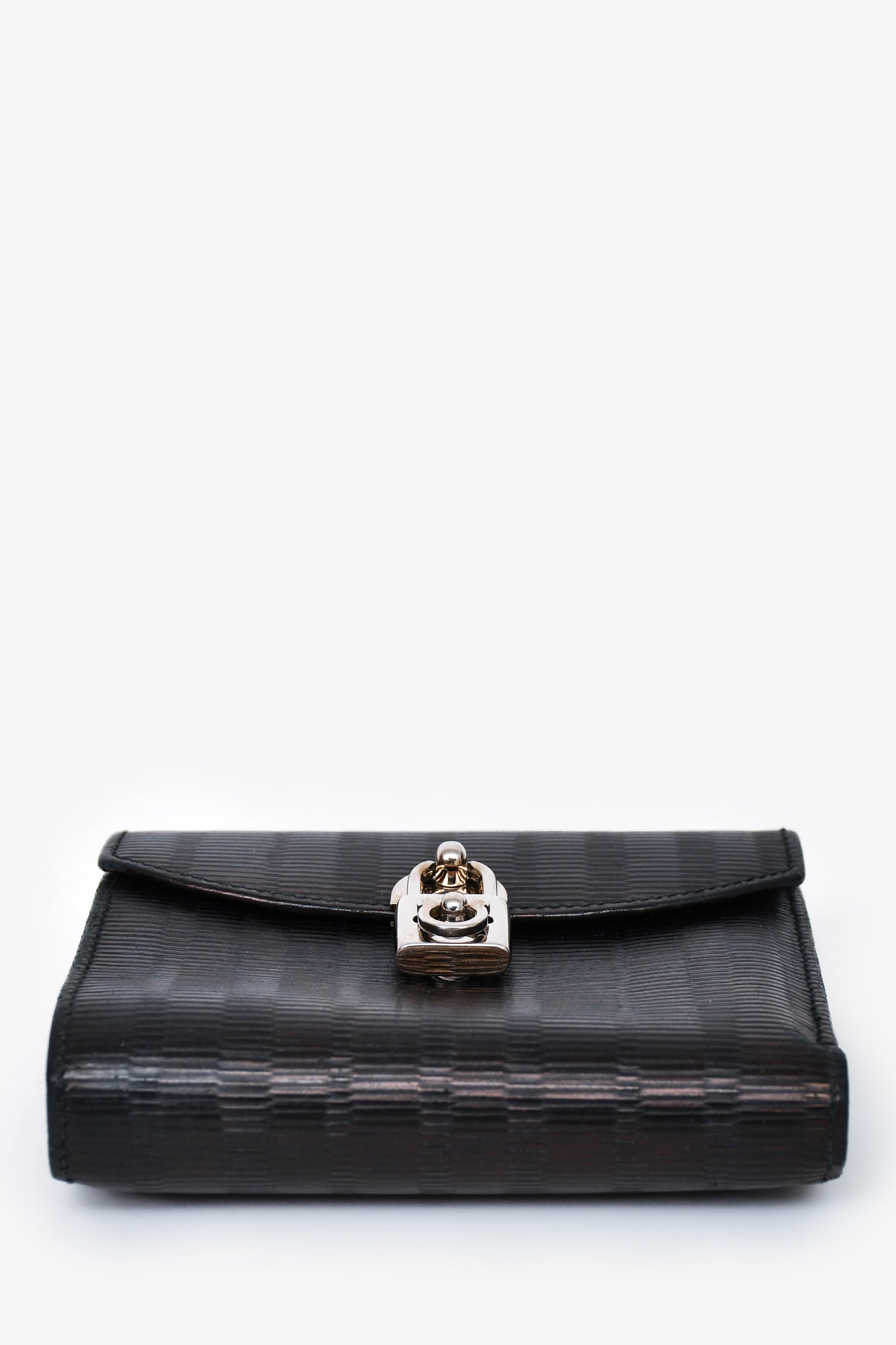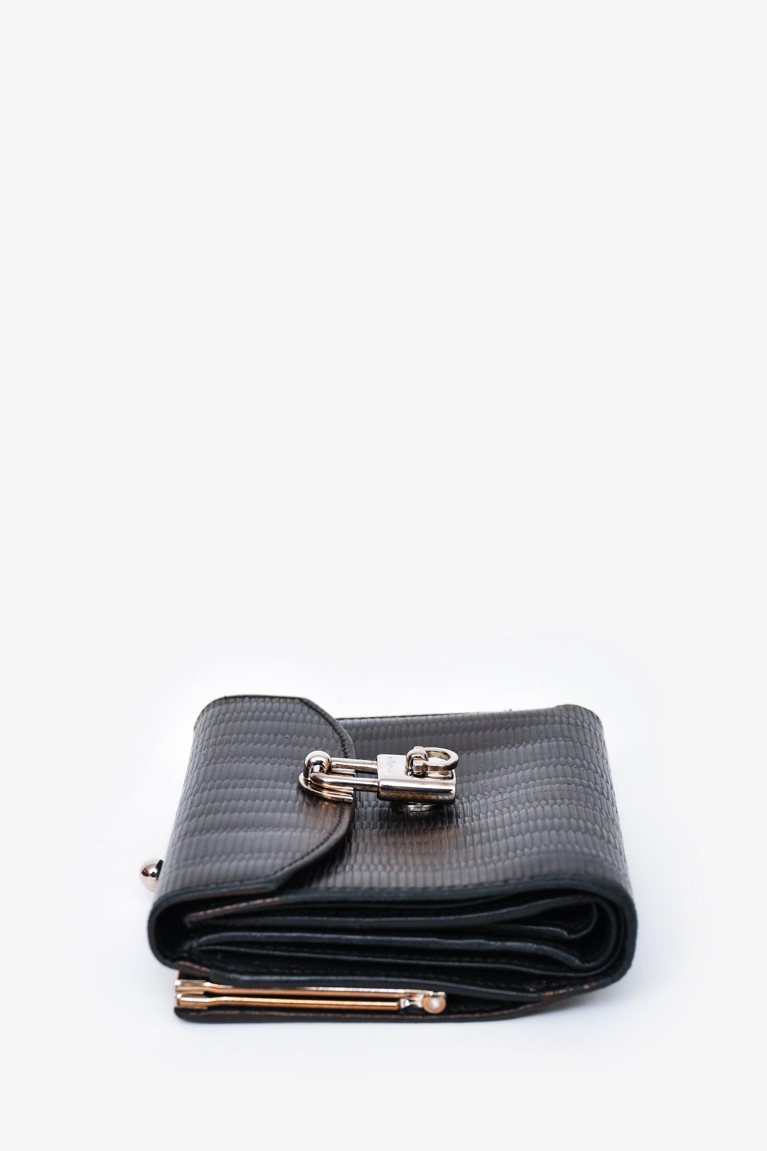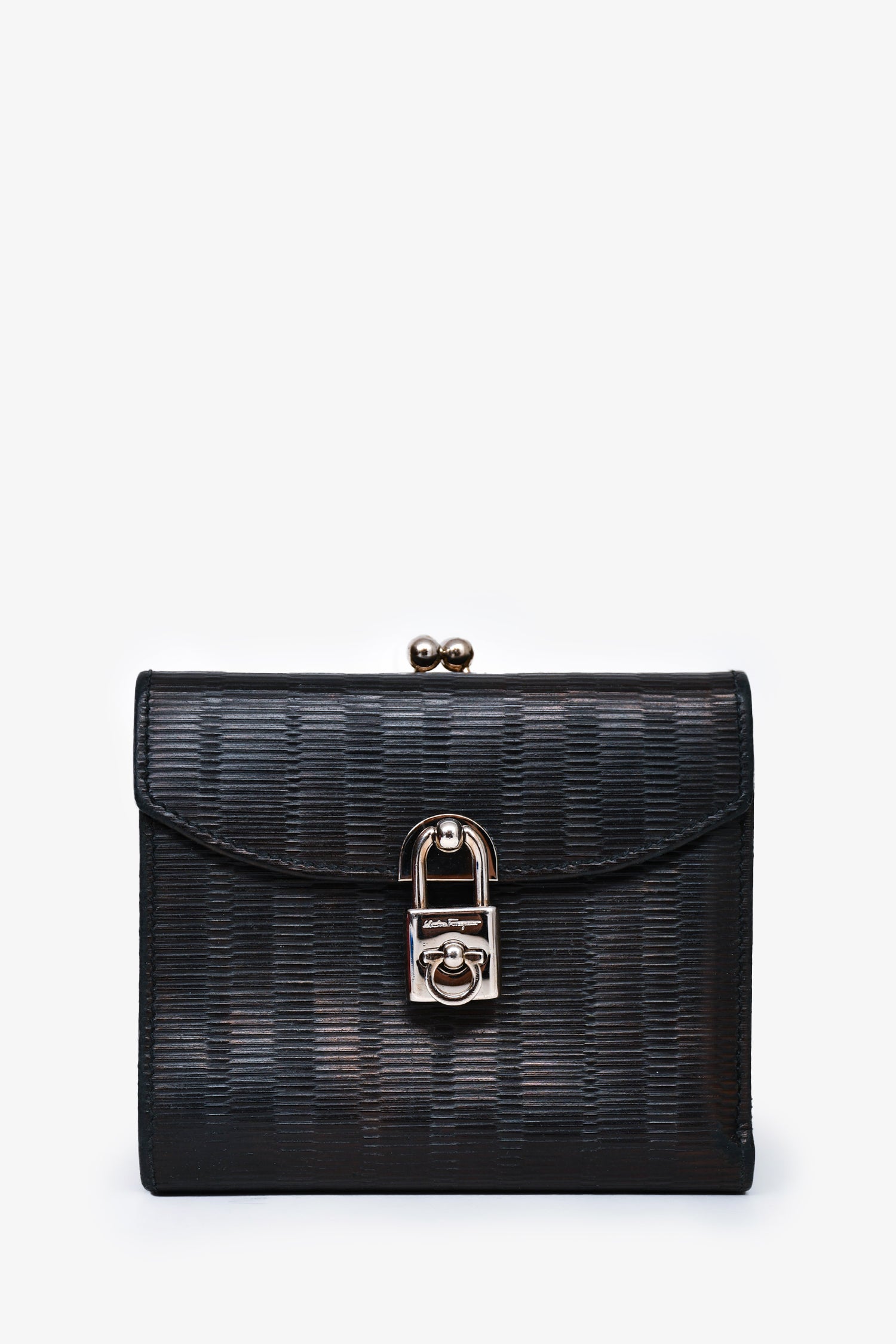 Refresh availabilitySalvatore Ferragamo Black Leather Lock Compact Wallet. Exterior twist lock pocket with two compartments. Turn-lock closure. Tri-fold with Twelve card holders and Two interior pockets. Silver-tone hardware. Tonal stitching.