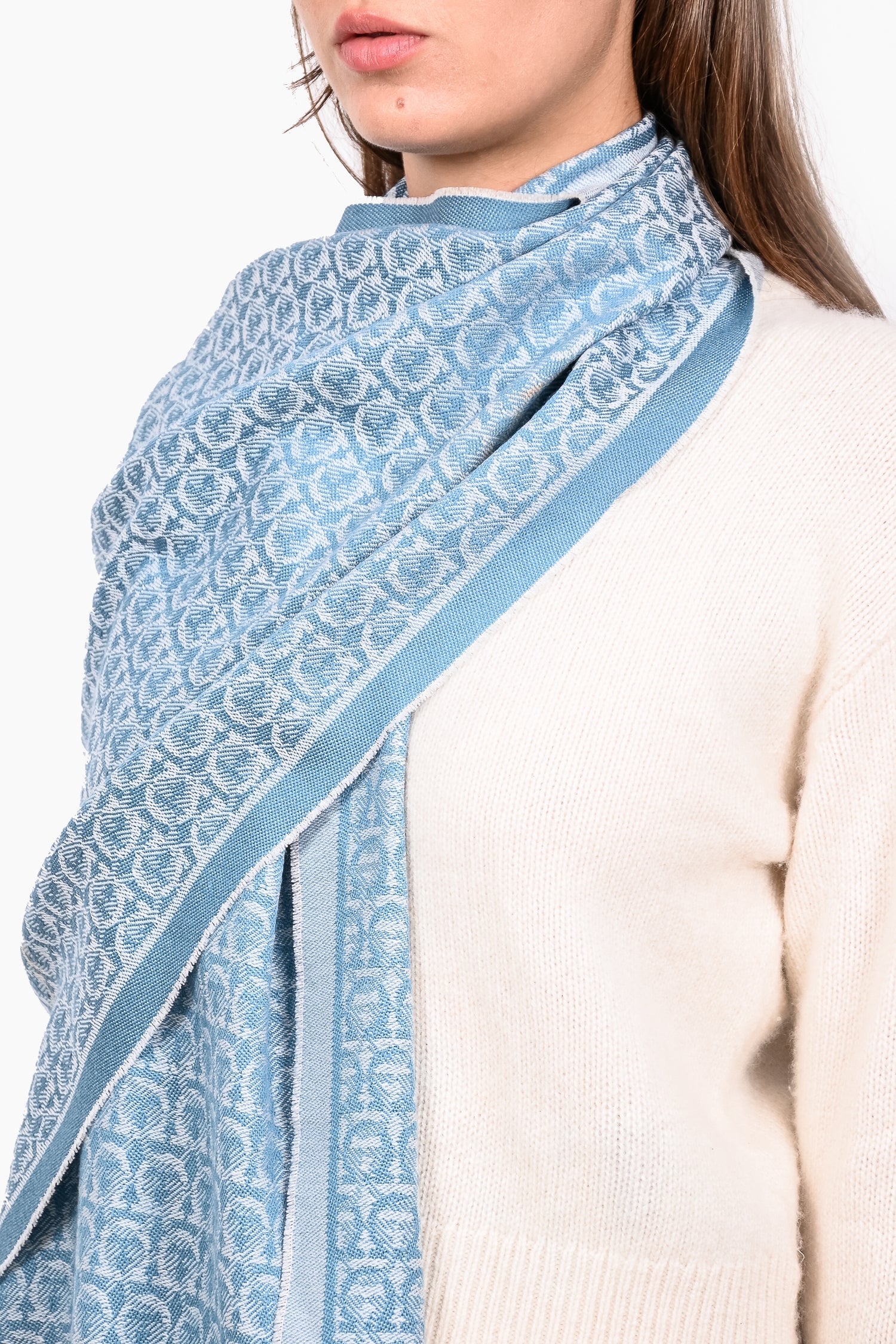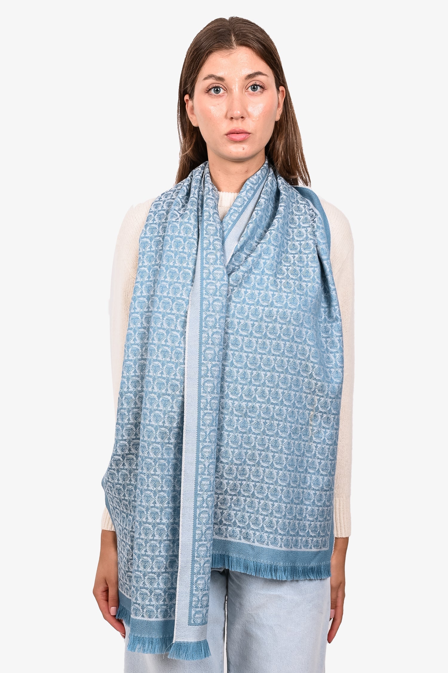 Salvatore Ferragamo Blue/White Gancini Printed Wool Scarf