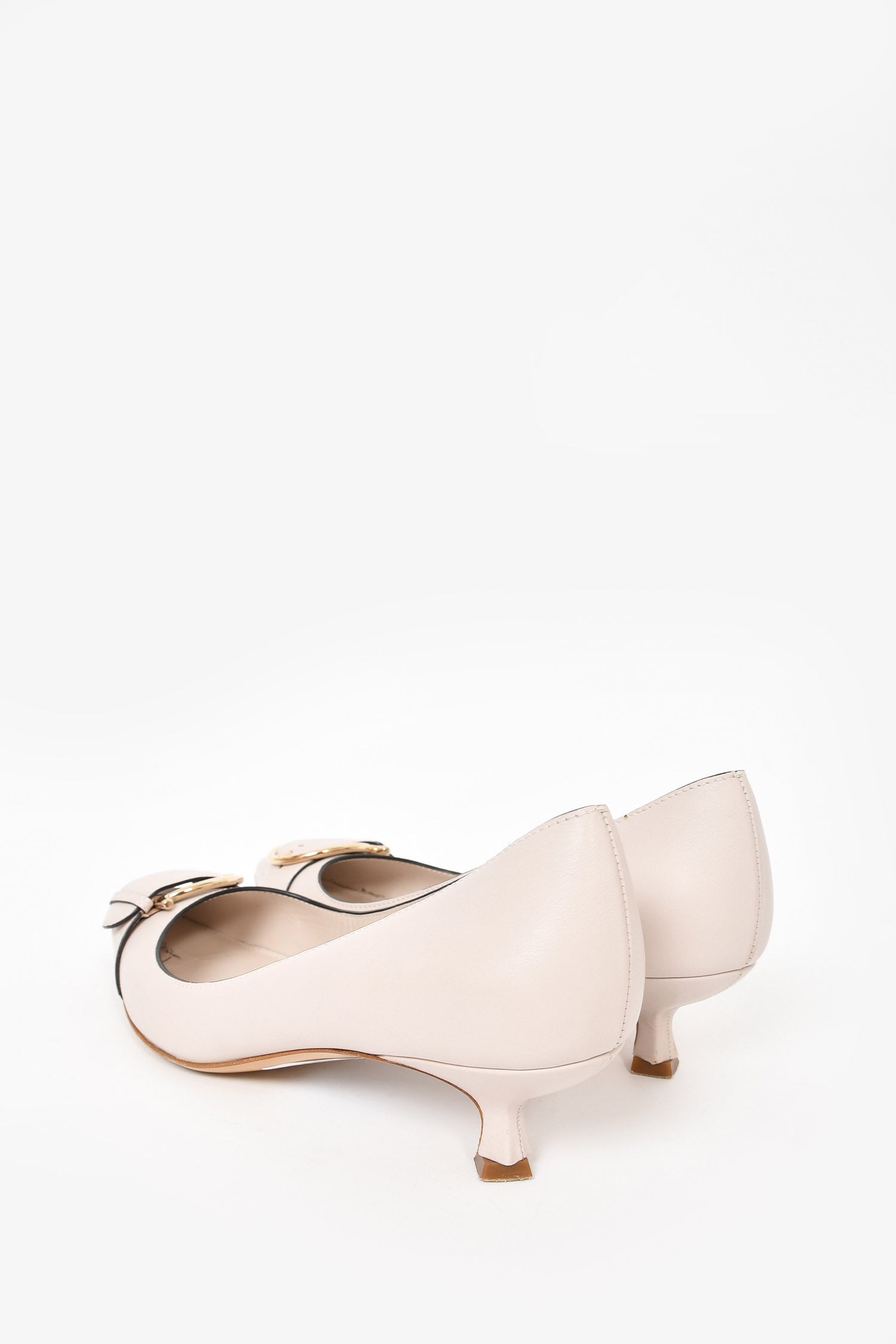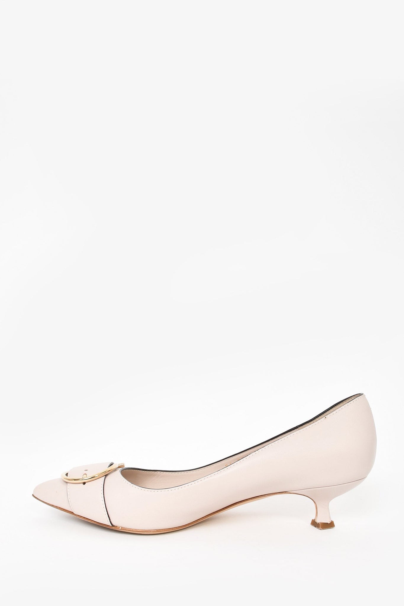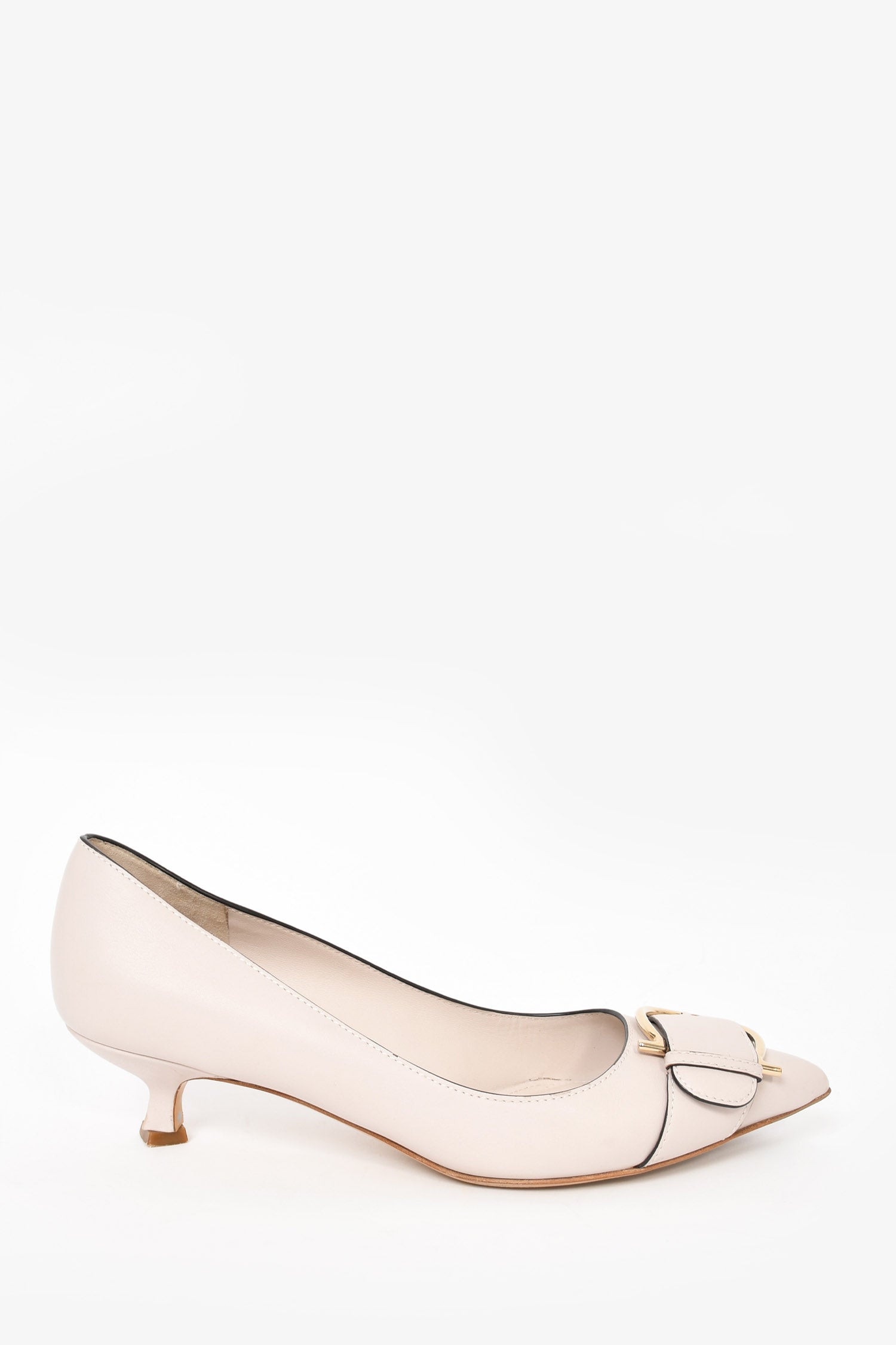 Refresh availabilitySalvatore Ferragamo Blush Leather Buckle Kitten Heels. Slip-on. Pointed toe. Tonal stitching.