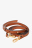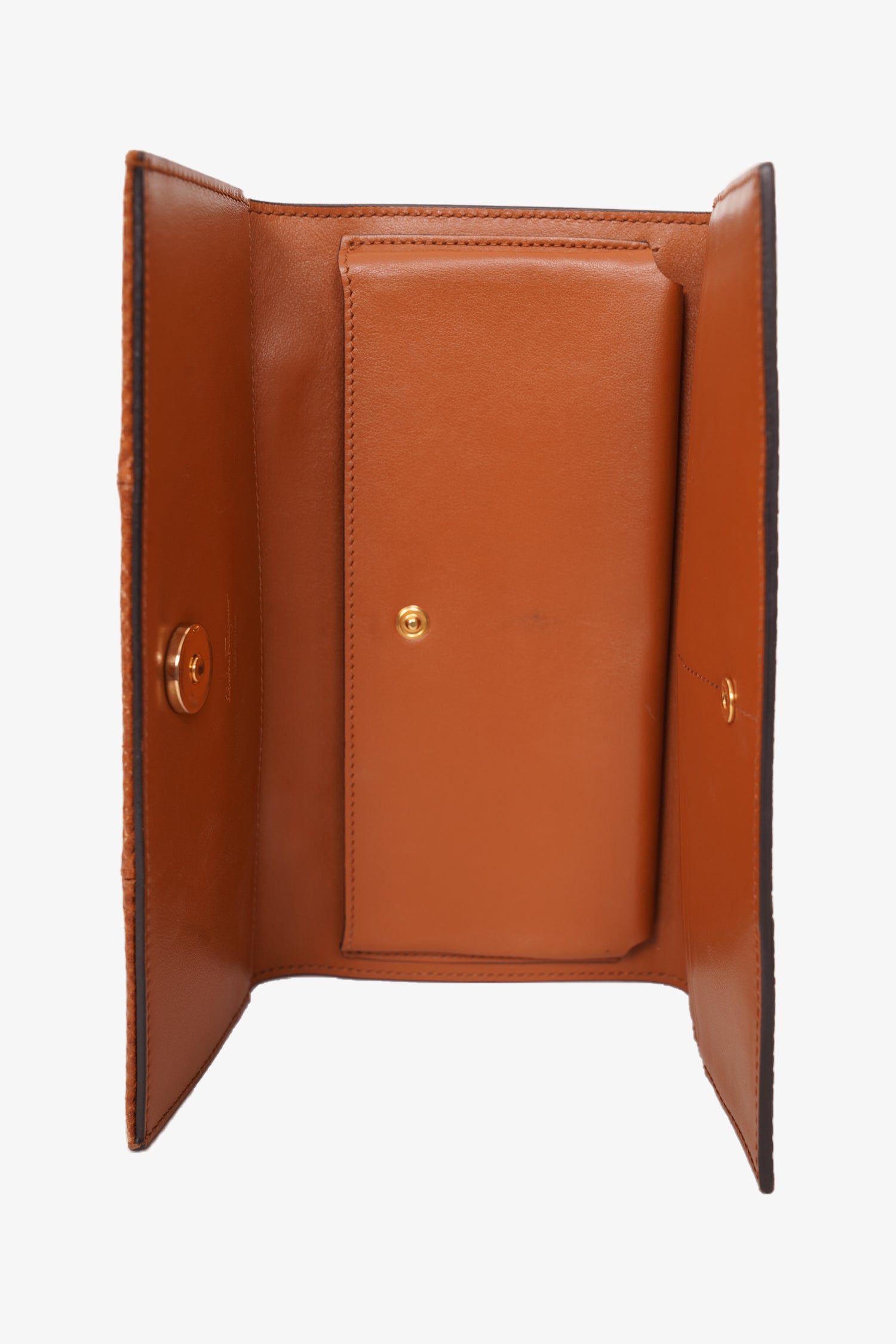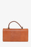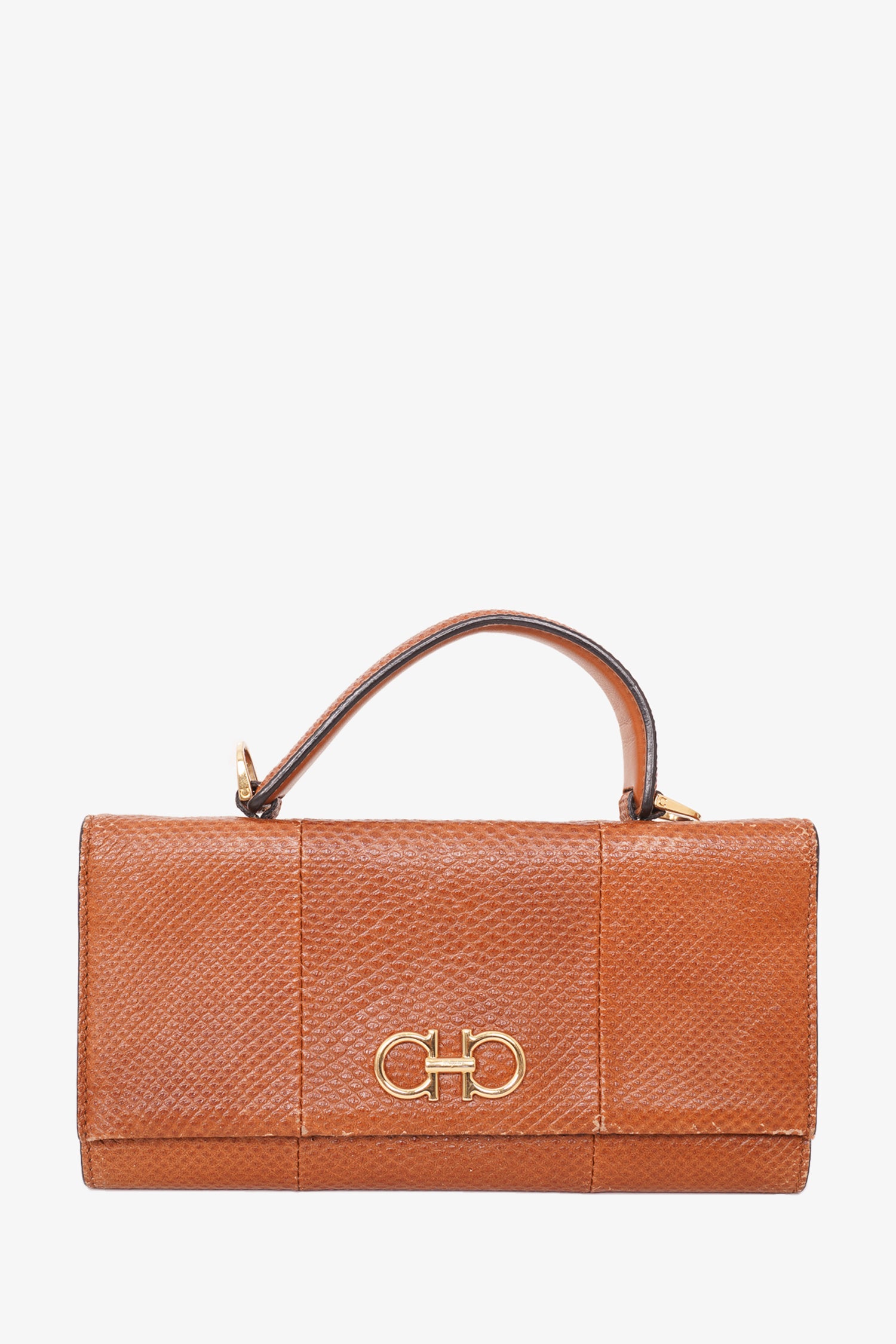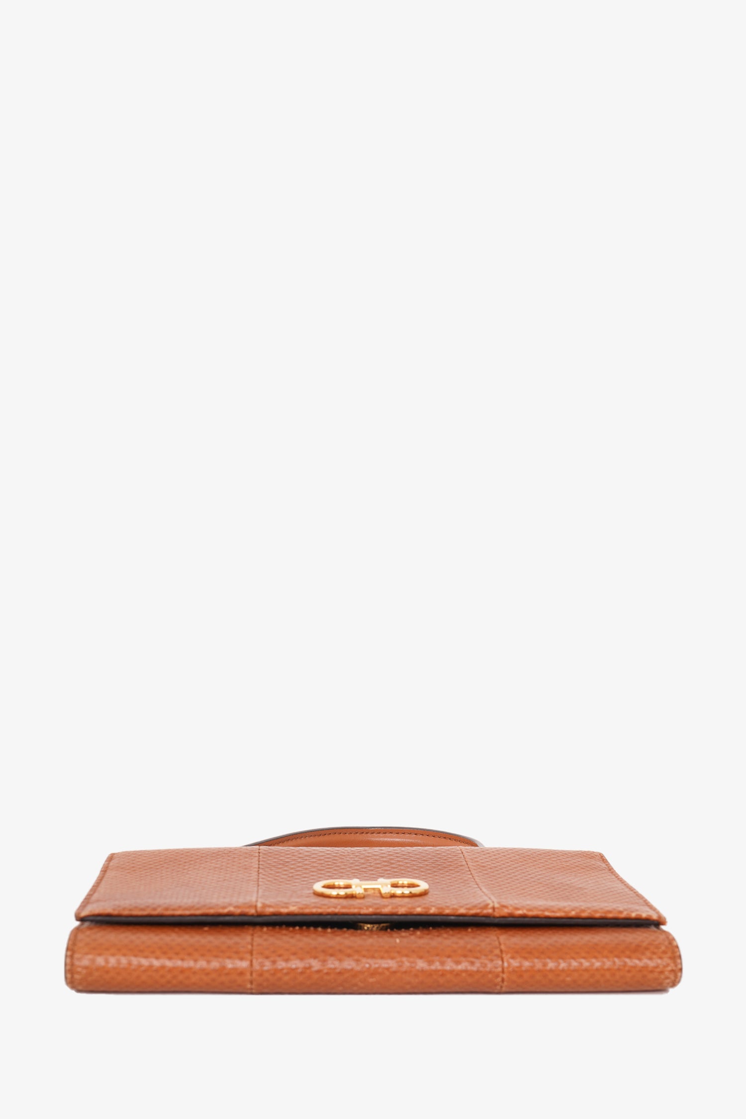 Salvatore Ferragamo Caramel Leather 'Gancini' Bag. Front flap with magetic closure. 6 card slots. 3 bill compartments. Removable cross body strap. Top handle. Gold-toned hardware. Tonal stitching.