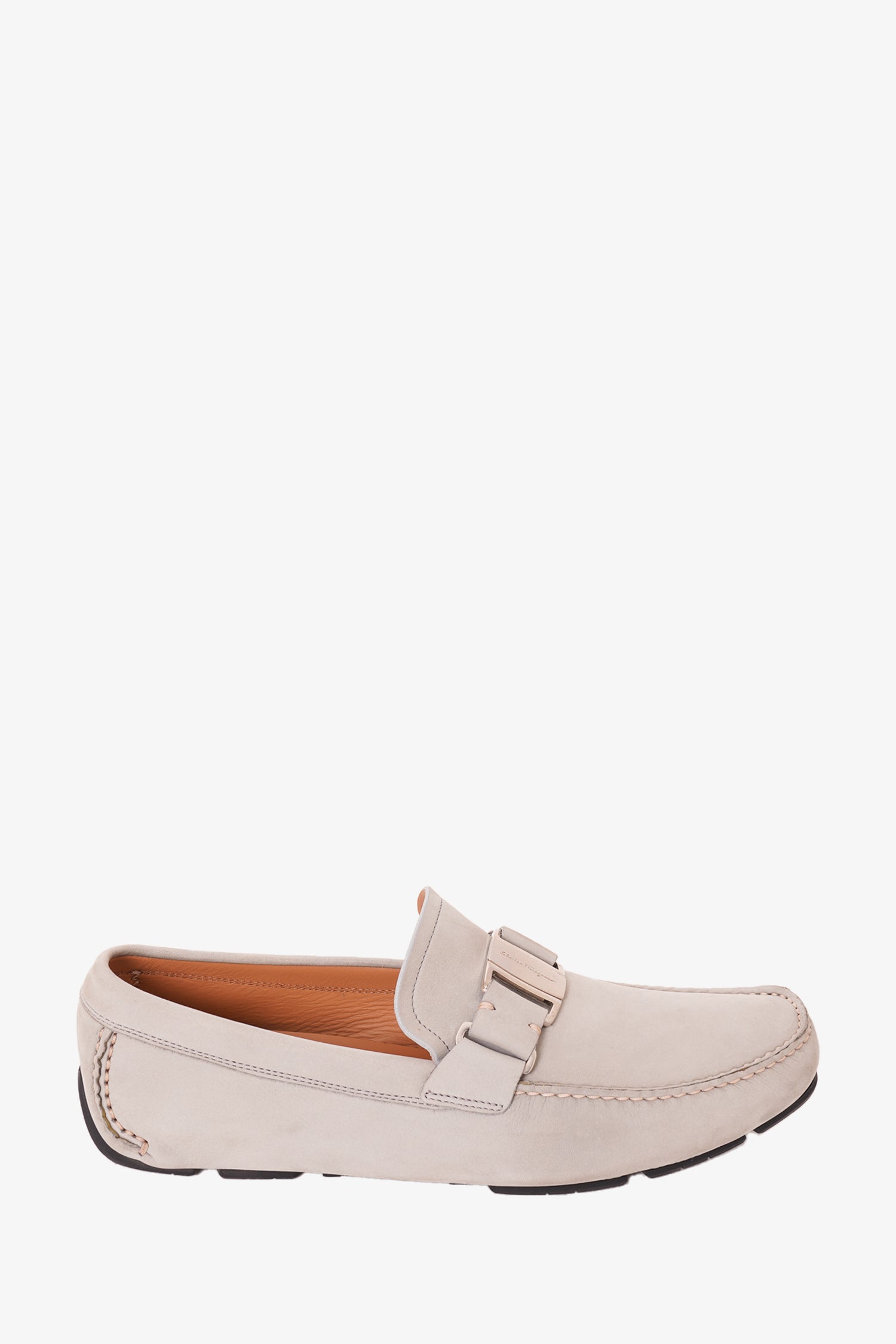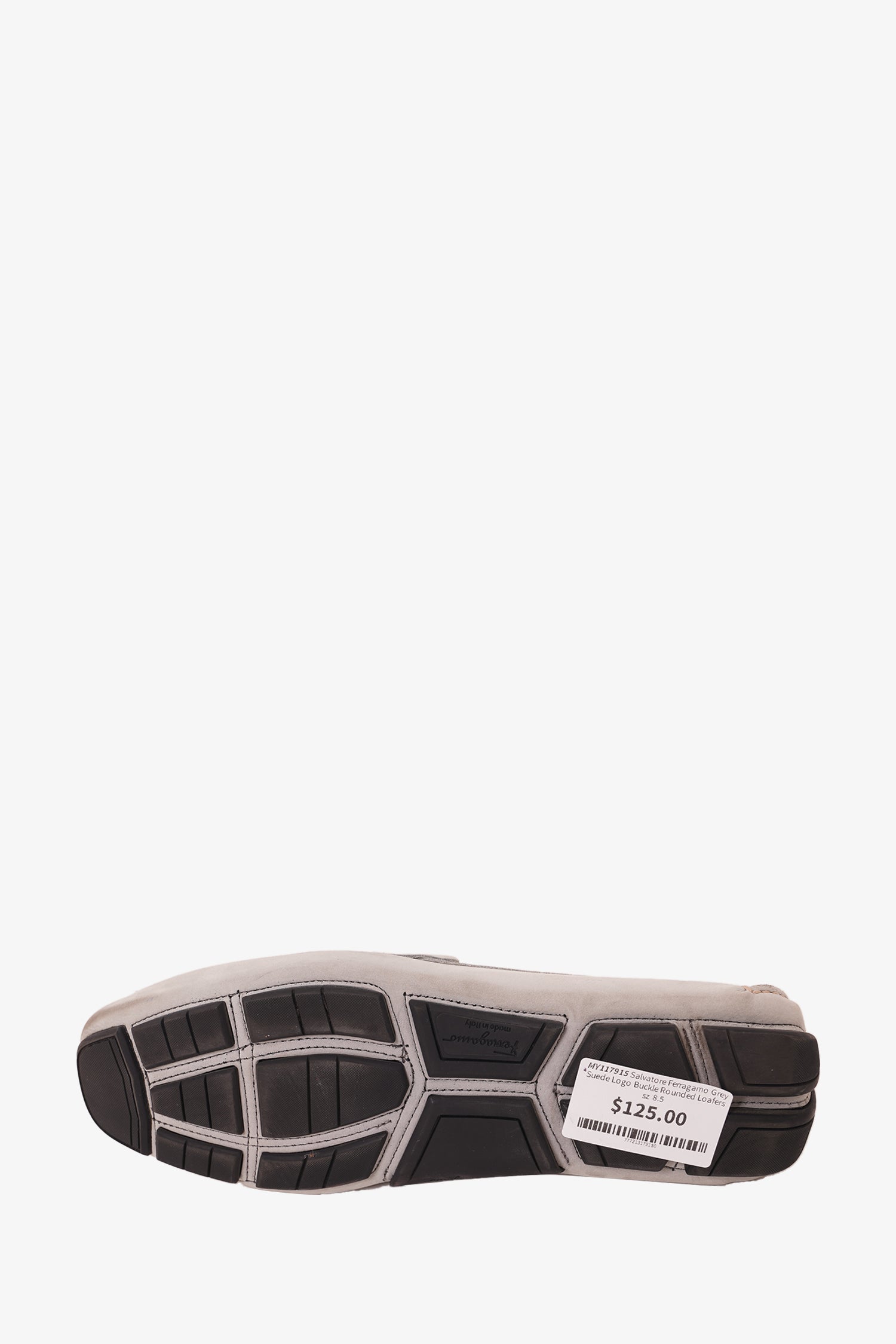 Refresh availabilitySalvatore Ferragamo Grey Suede Logo Buckle Rounded Loafers. Square toe. Tonal stitching.