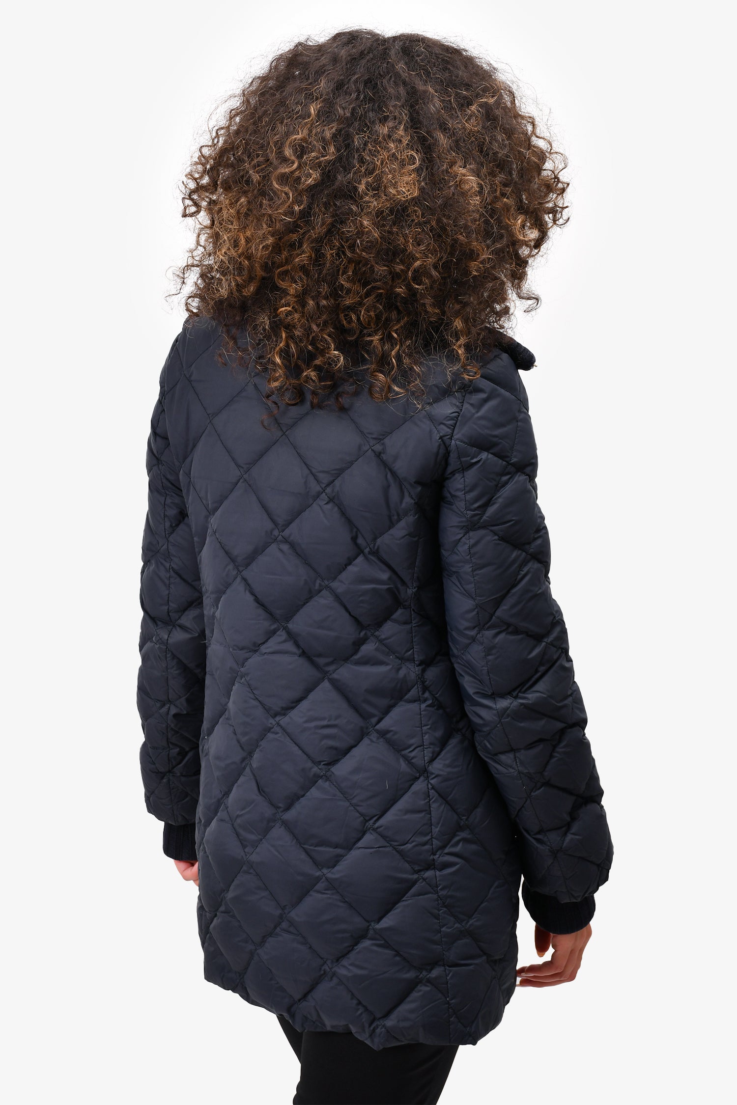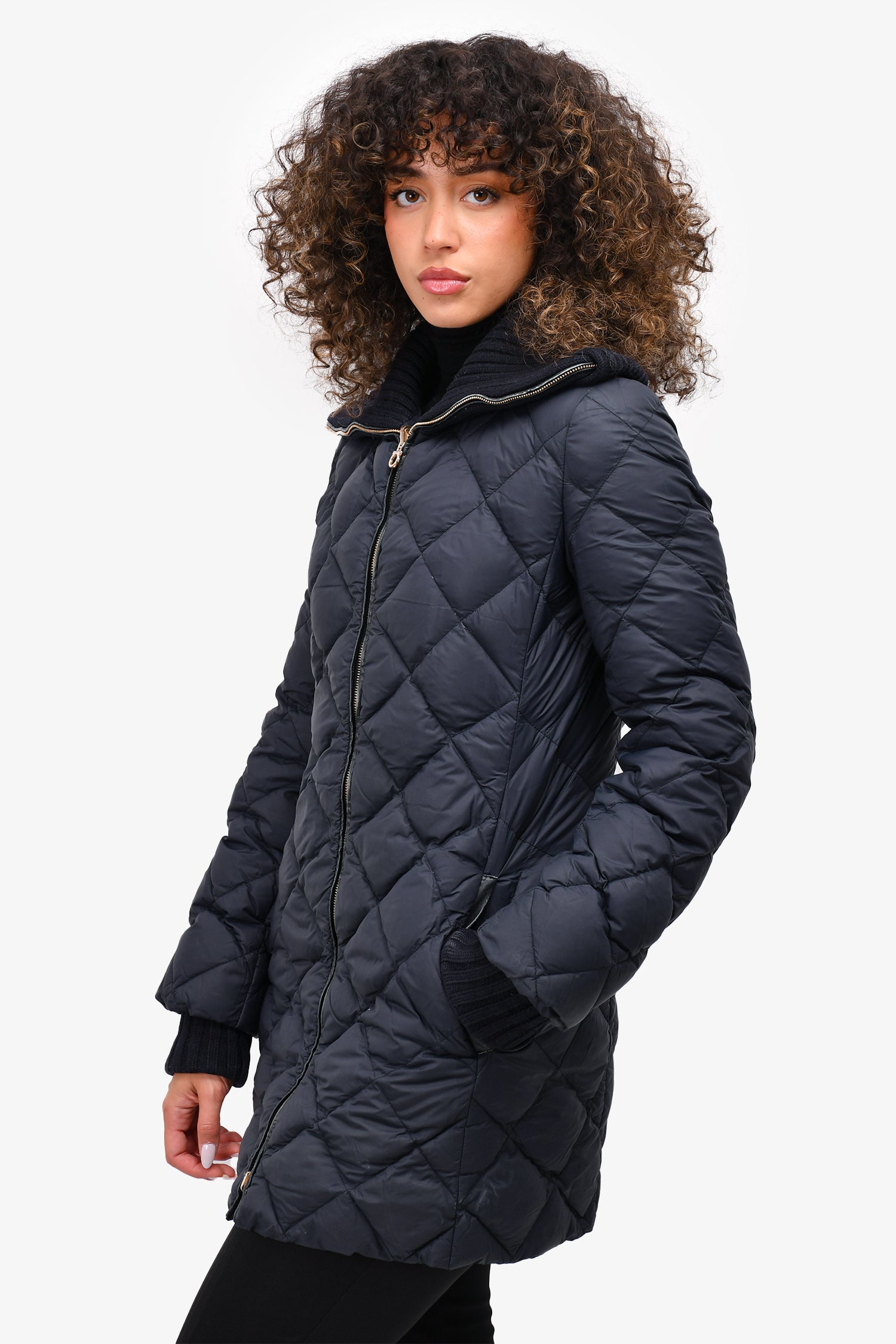 Refresh availabilitySalvatore Ferragamo Navy Nylon Quilted Puffer Jacket. Knit collar. Front zip closure. Two front slip pockets. Unlined. Tonal stitching.