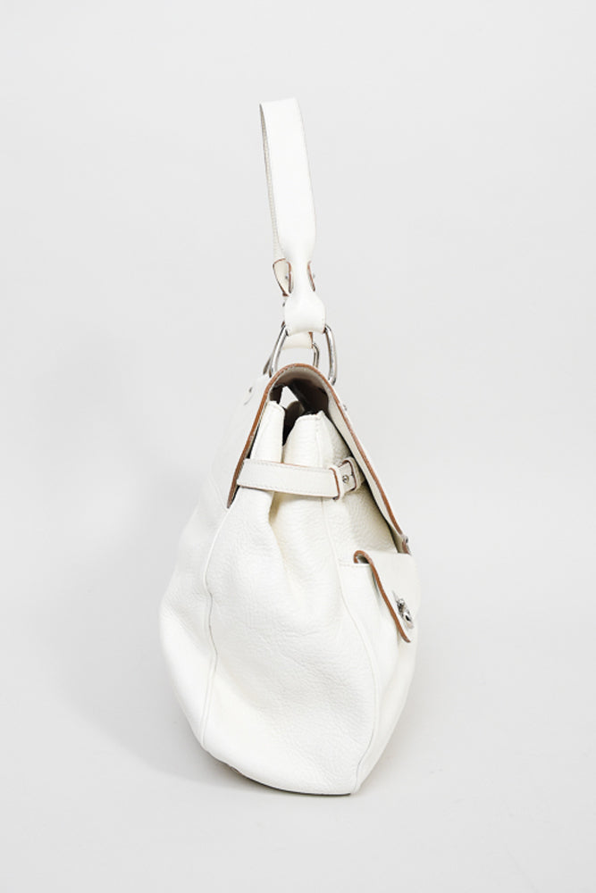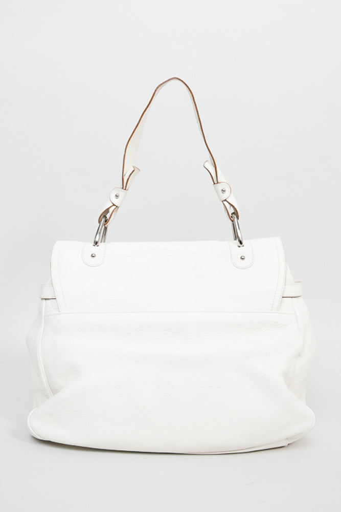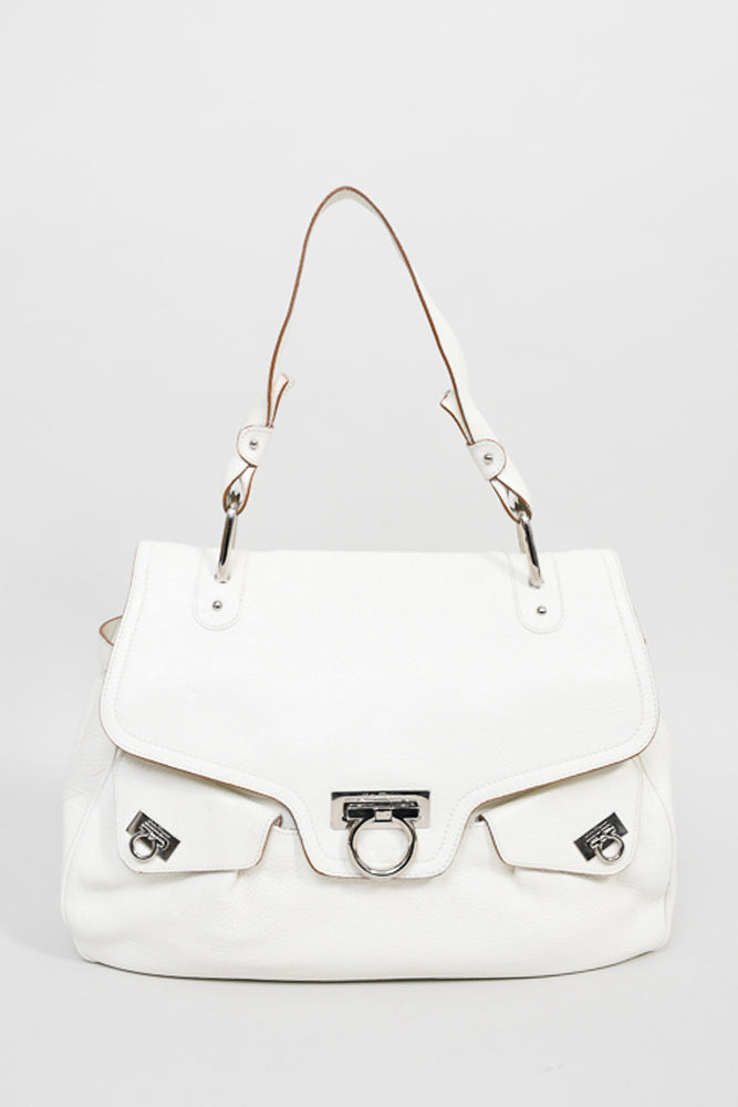Refresh availabilitySalvatore Ferragamo White Leather Large Top Handle Bag. Foldover flap with turn-lock closure. 3 interior wall pockets; 2 open and 1 with zip closure. Silver hardware. Tonal stitching.