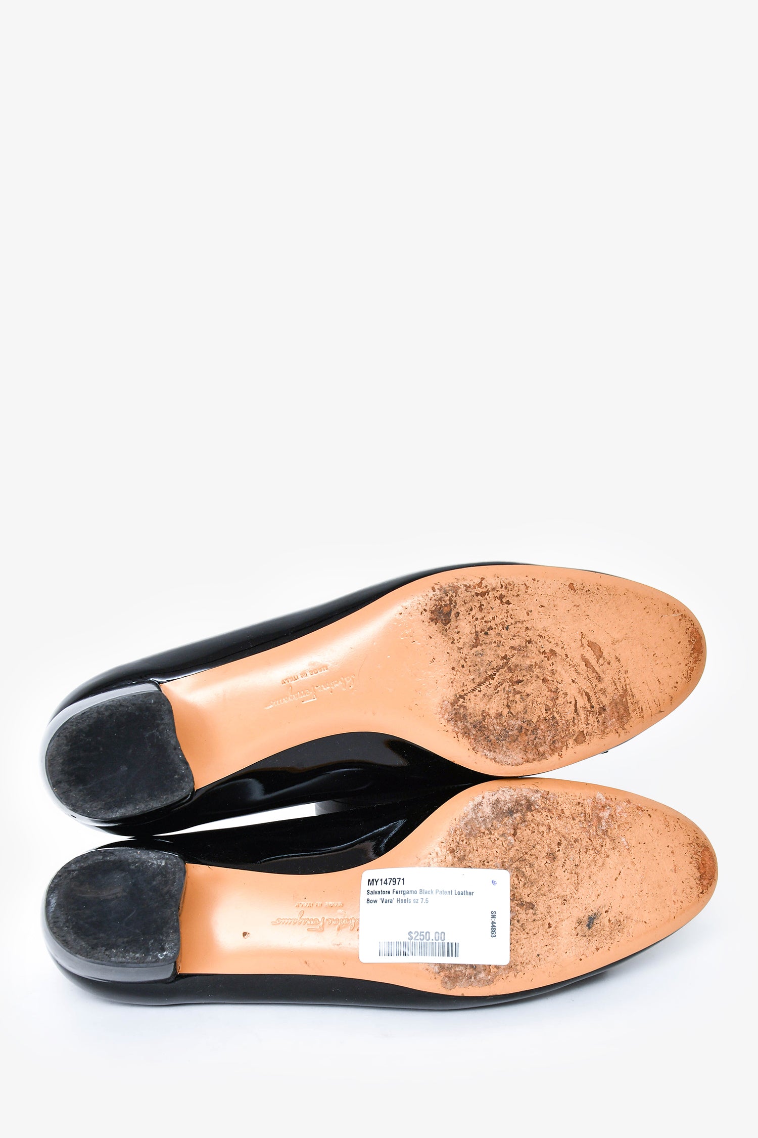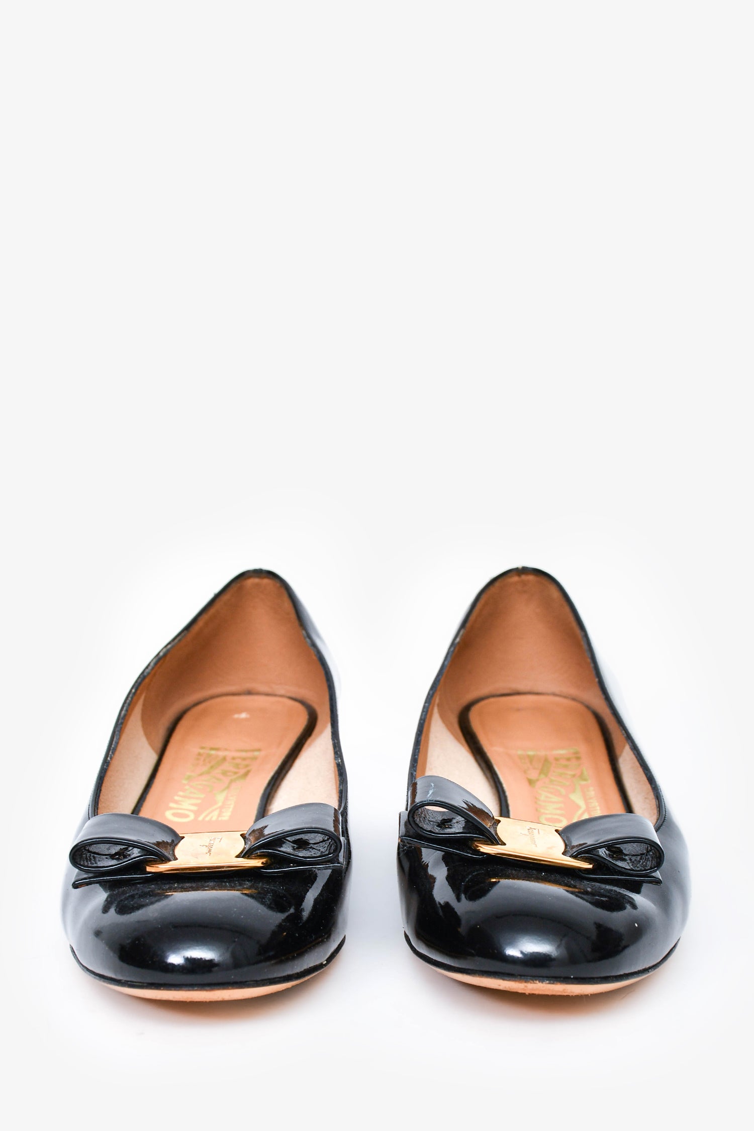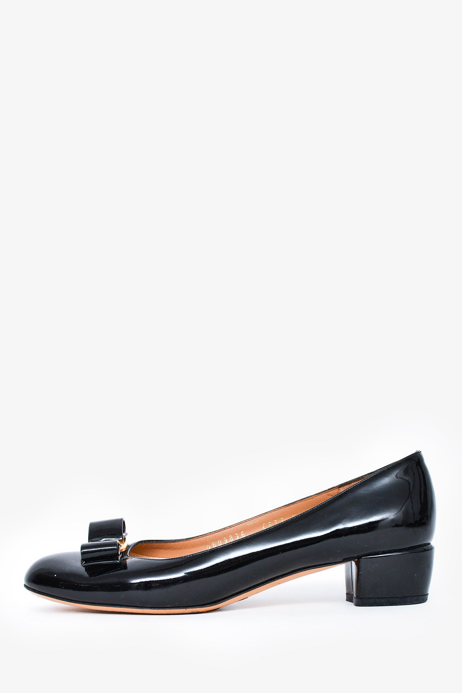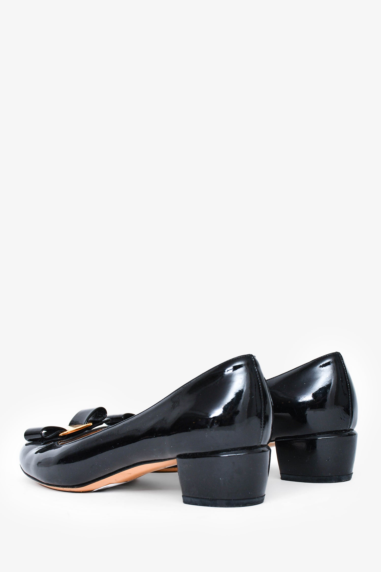 Refresh availabilitySalvatore Ferragamo Black Patent Leather Bow 'Vara' Heels. Gold-tone hardware. Round toe. Tonal stitching.