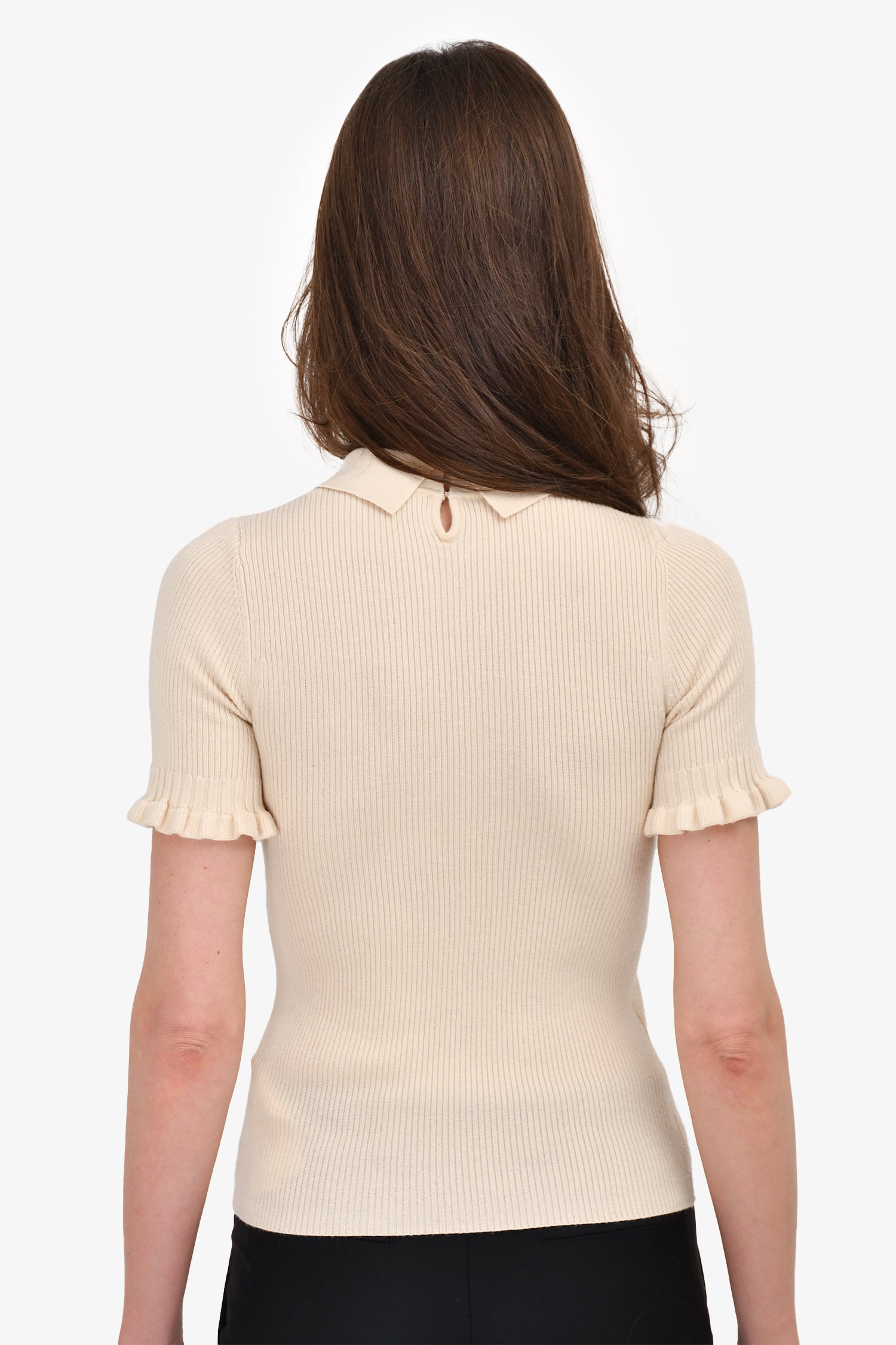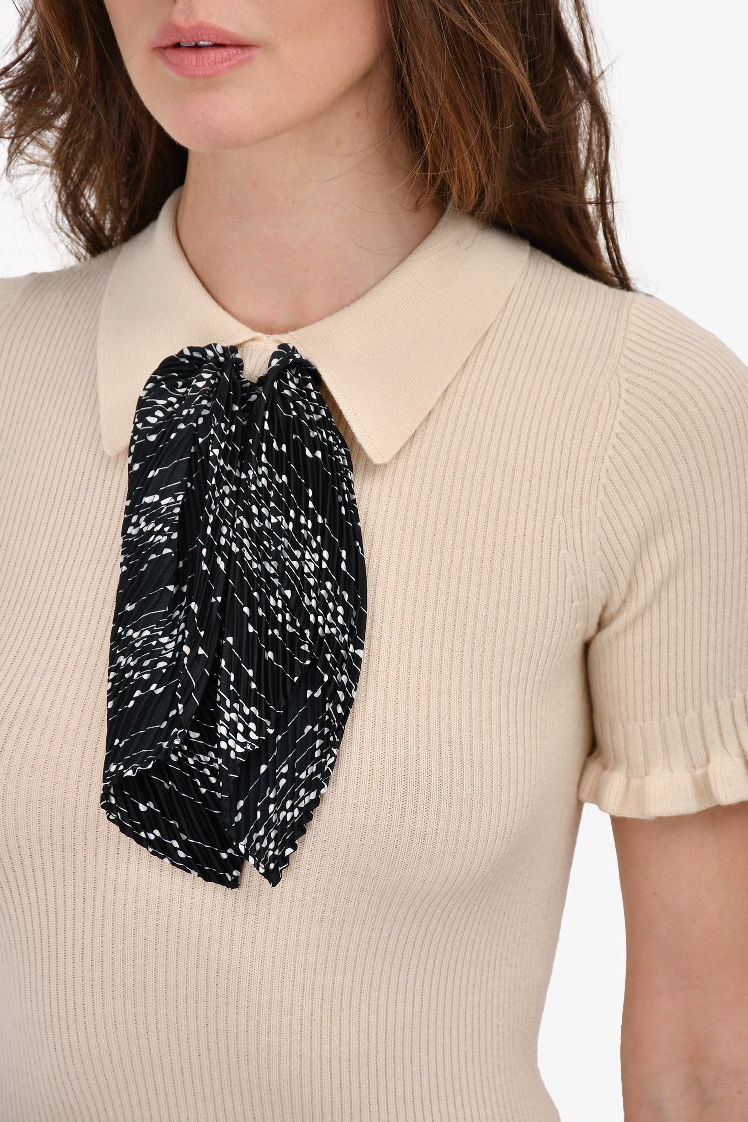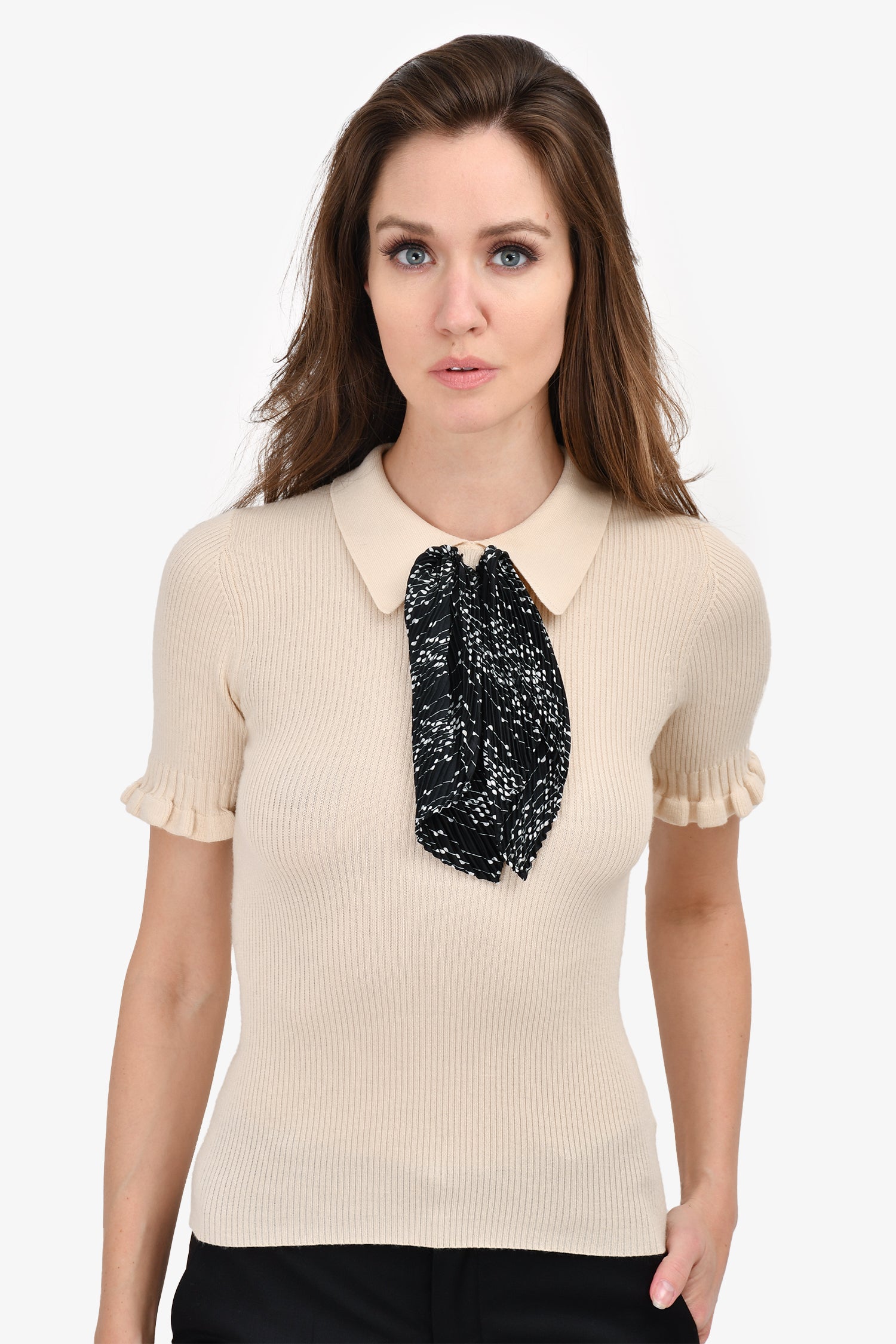 Refresh availabilitySandro Beige/Black Ribbed Knit Short Sleeve Neck Tie Collared Top. Rear hook-up closure. Pull-on.