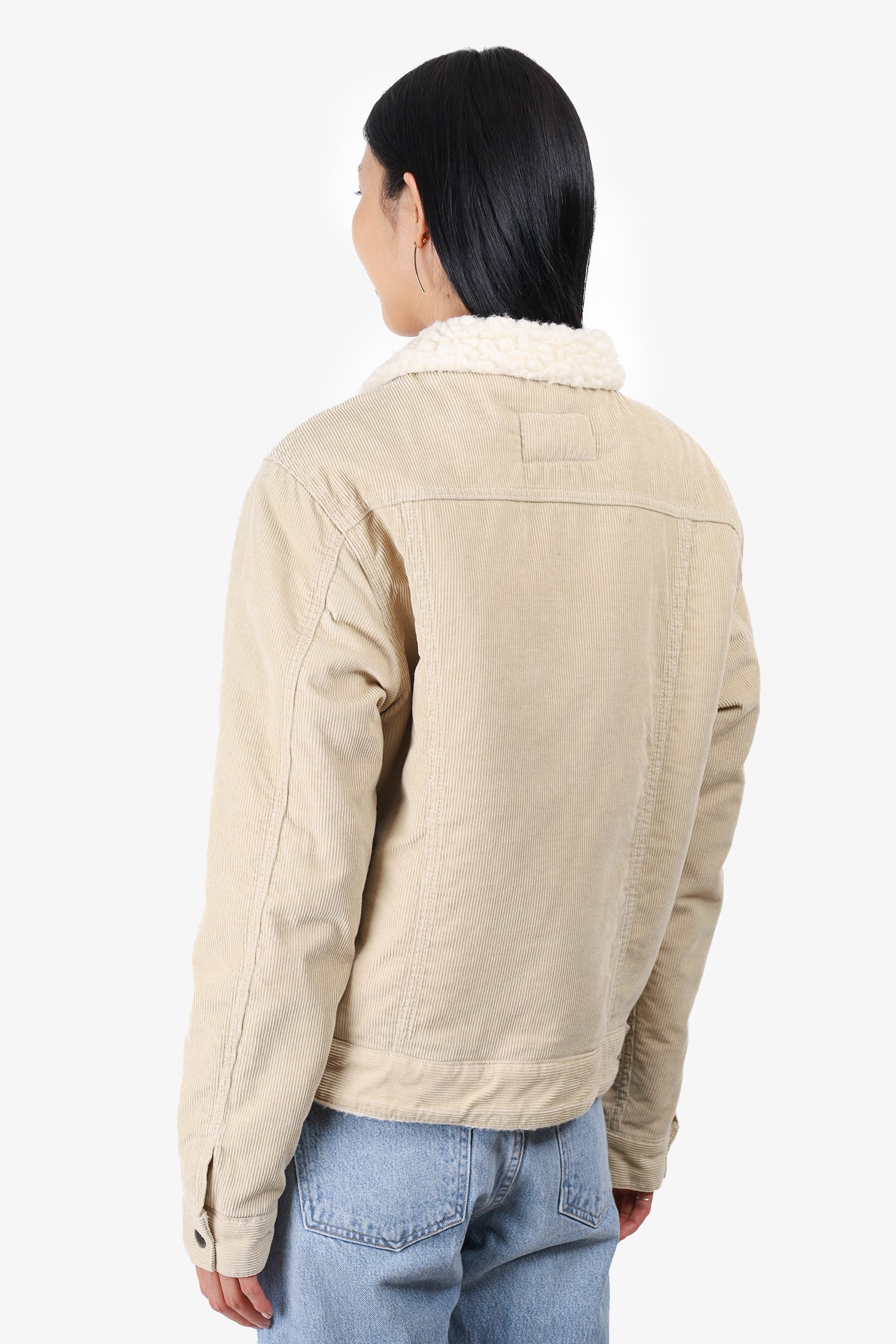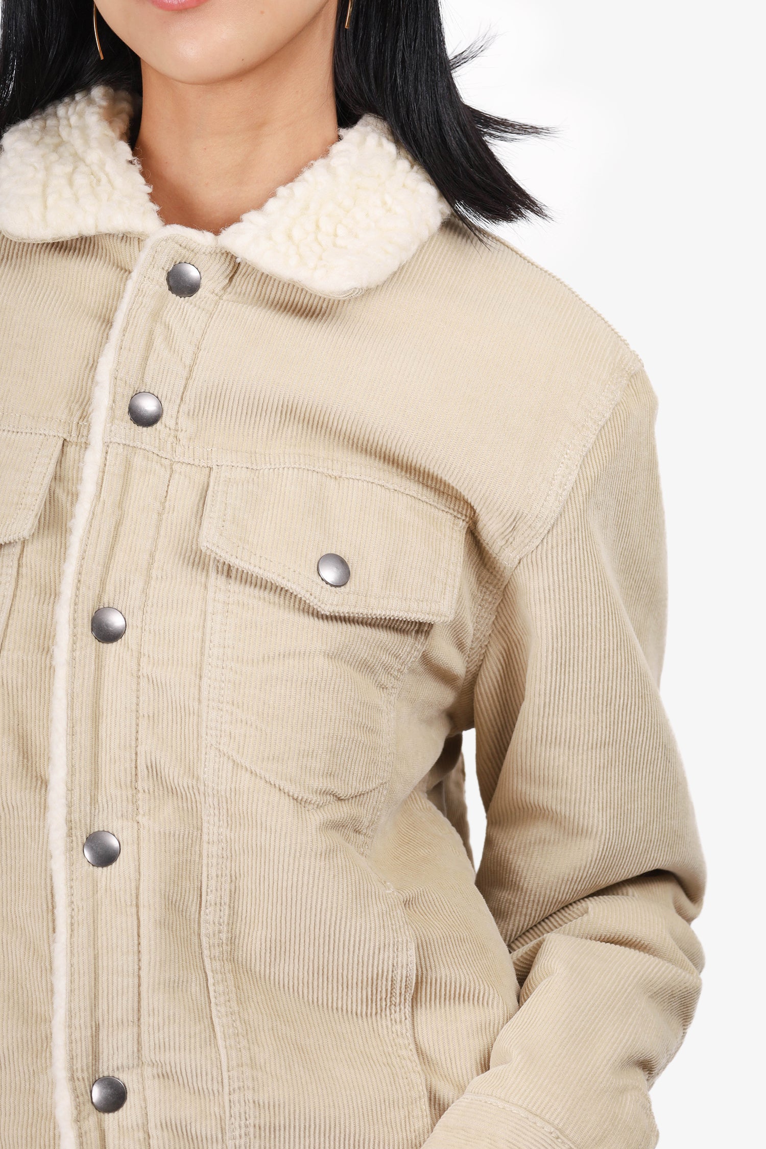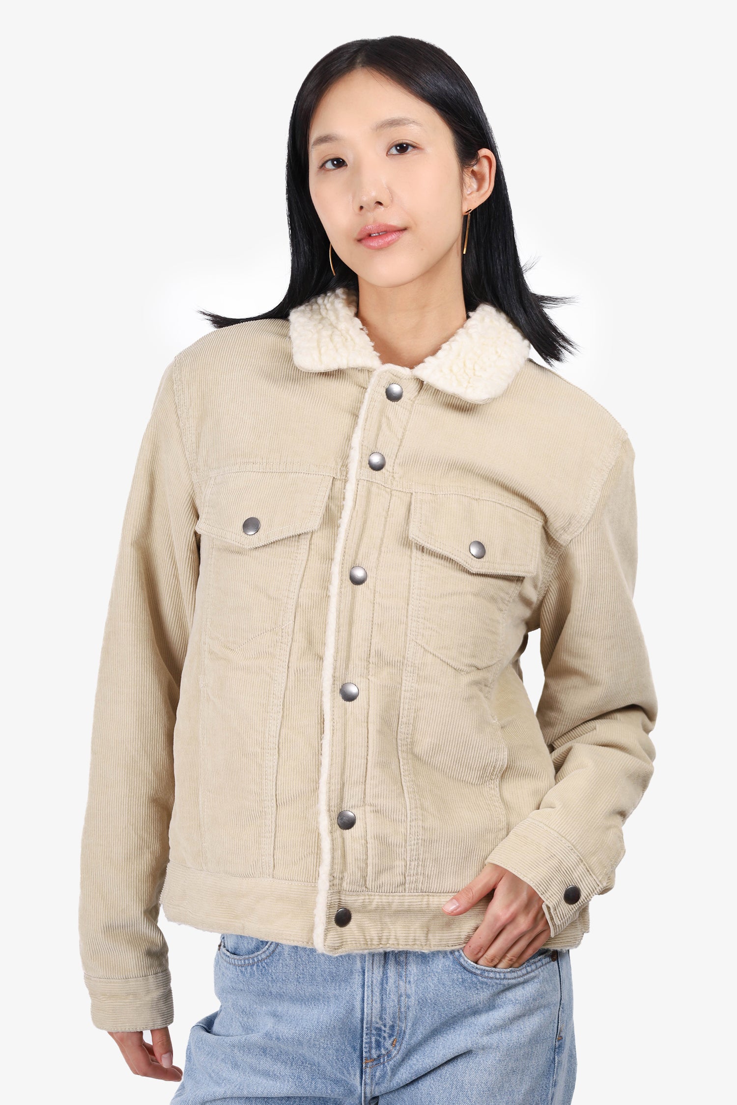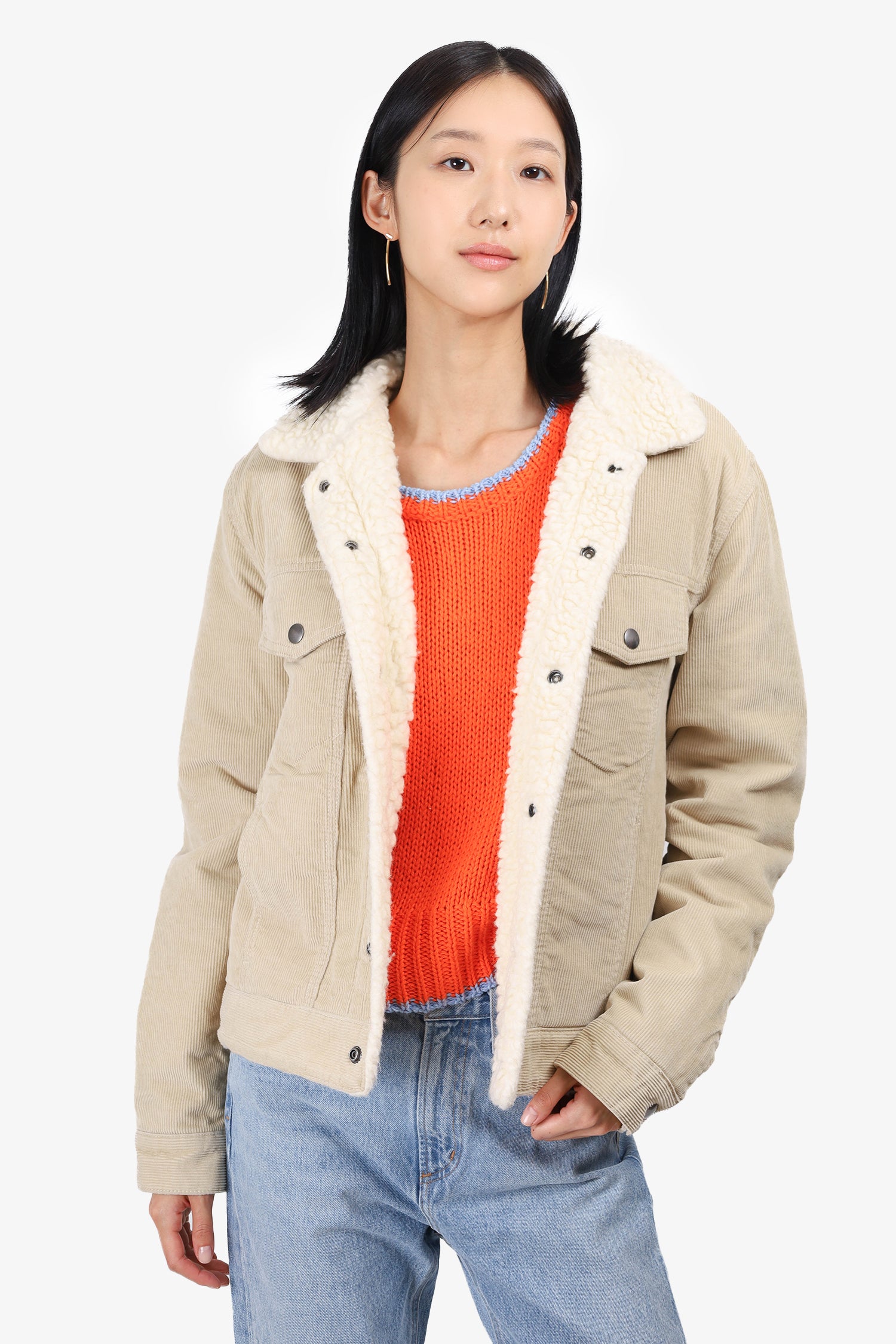 Refresh availabilitySandro Beige Corduroy Faux Fur Lined Jacket. Front snap button closure. Silver-tone hardware. Unlined. Tonal stitching.