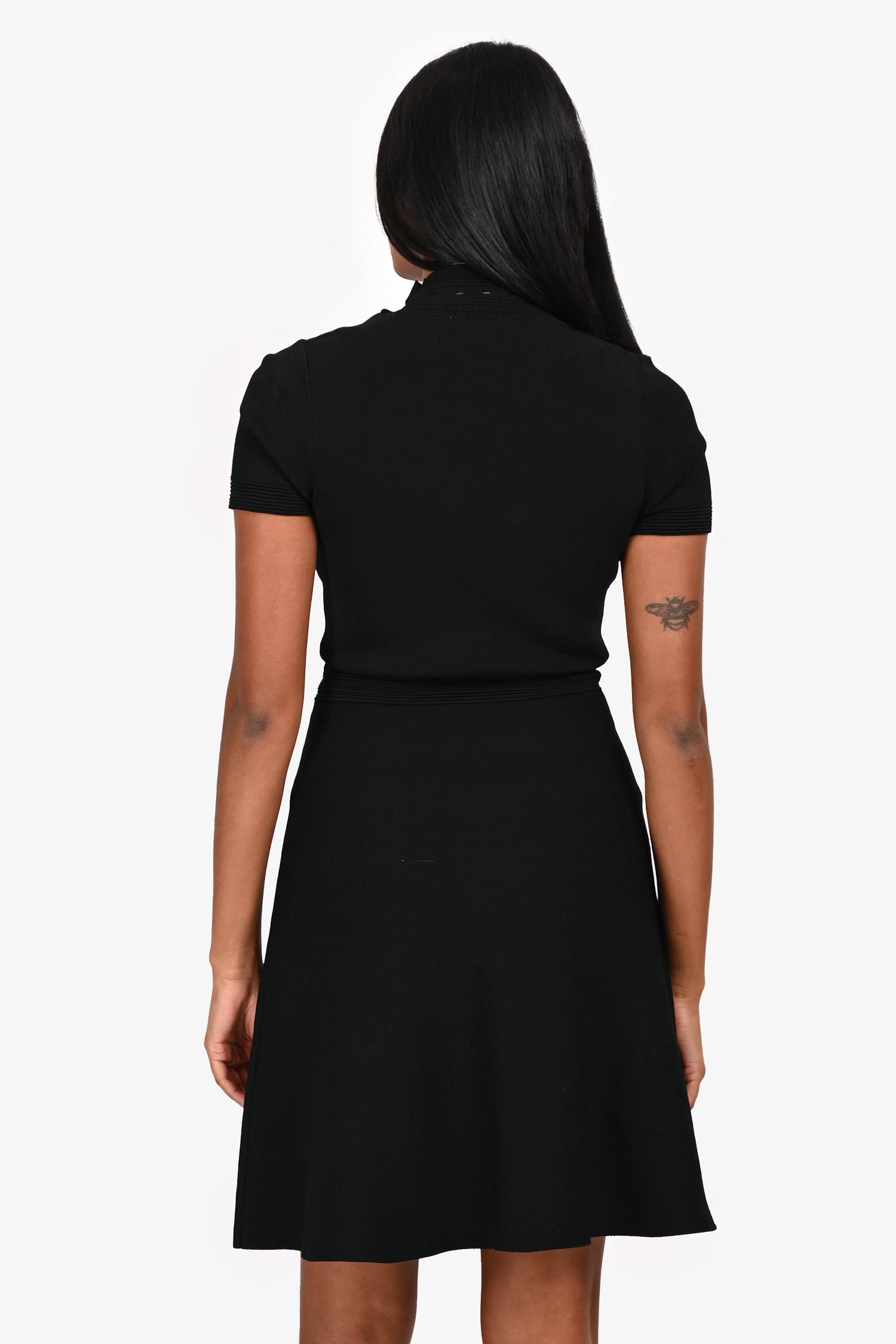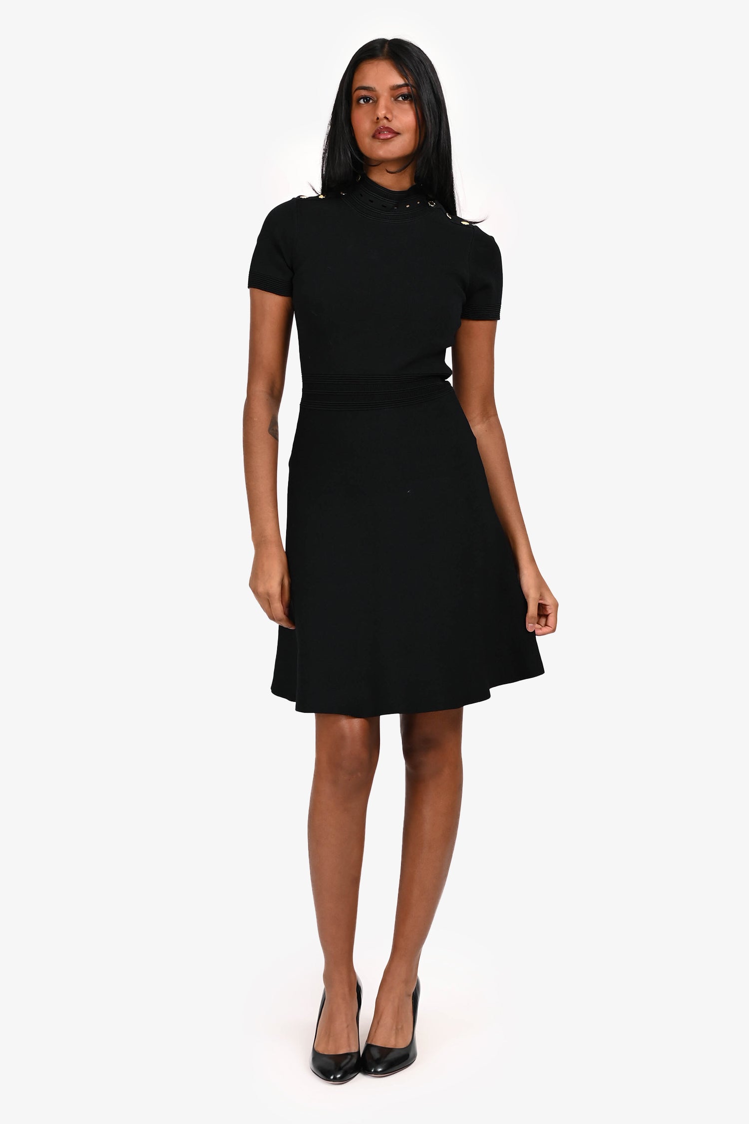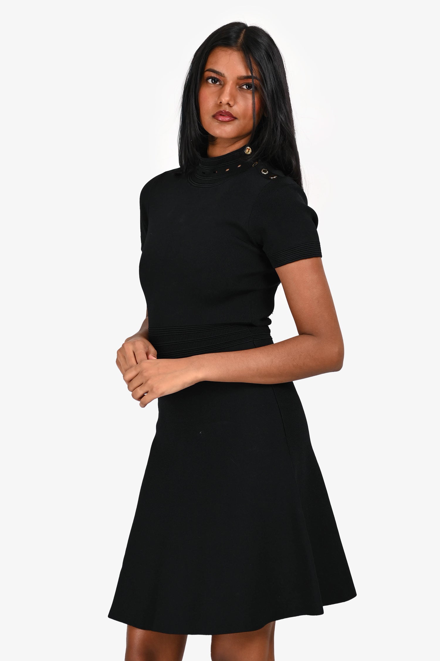 Refresh availabilitySandro Black Button Detail Mini Dress. Pull-on. Mock neckline. Snap-button closure on the neckline. Unlined. Gold-tone hardware. Tonal stitching.