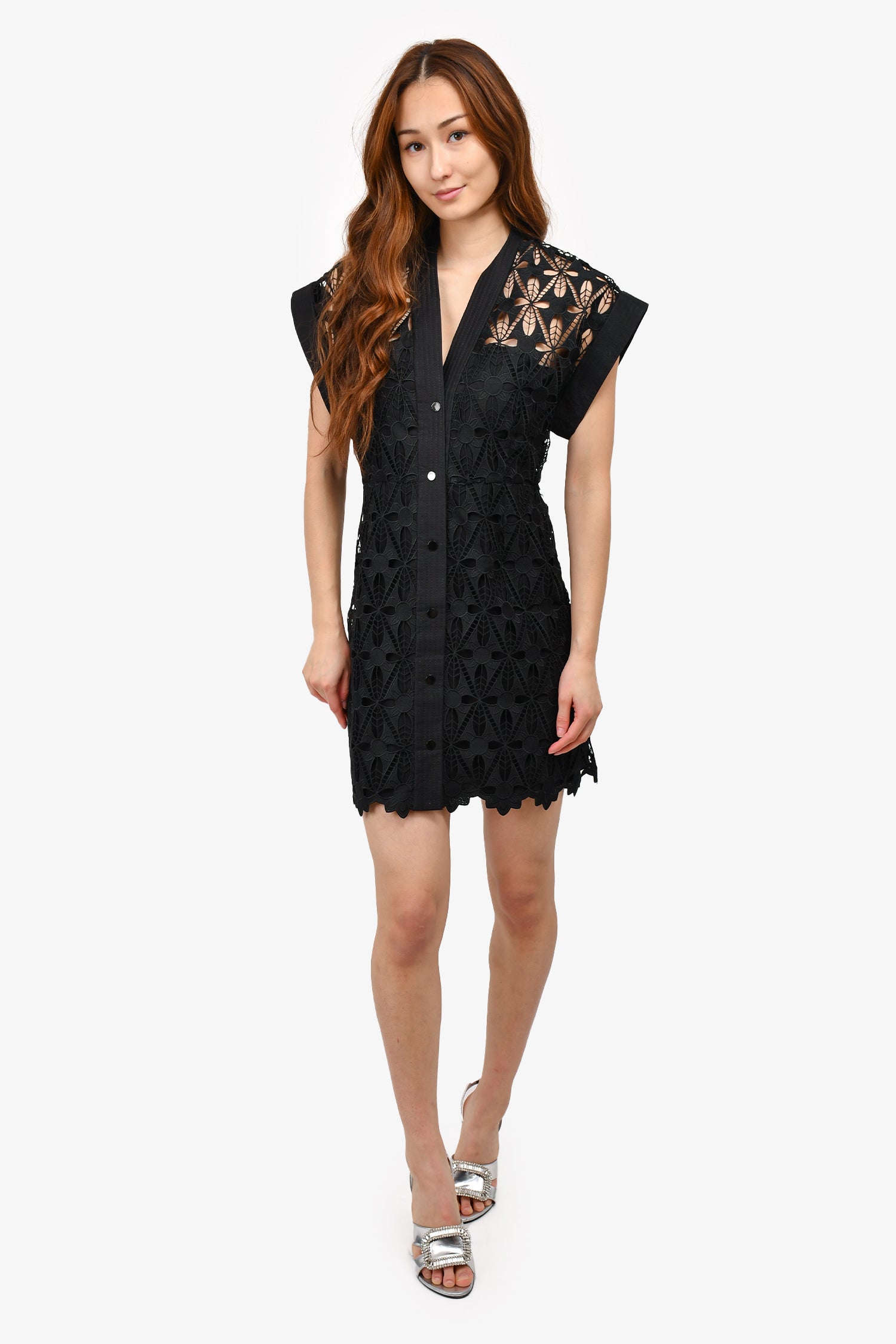 Refresh availabilitySandro Black Crochet Lace Mini Dress. Front snap-on button closure. Tonal hardware. Silver-tone hardware. Lined. Tonal stitching.