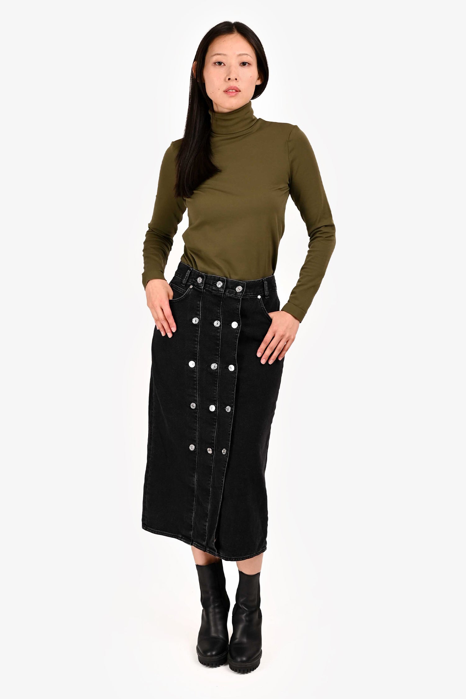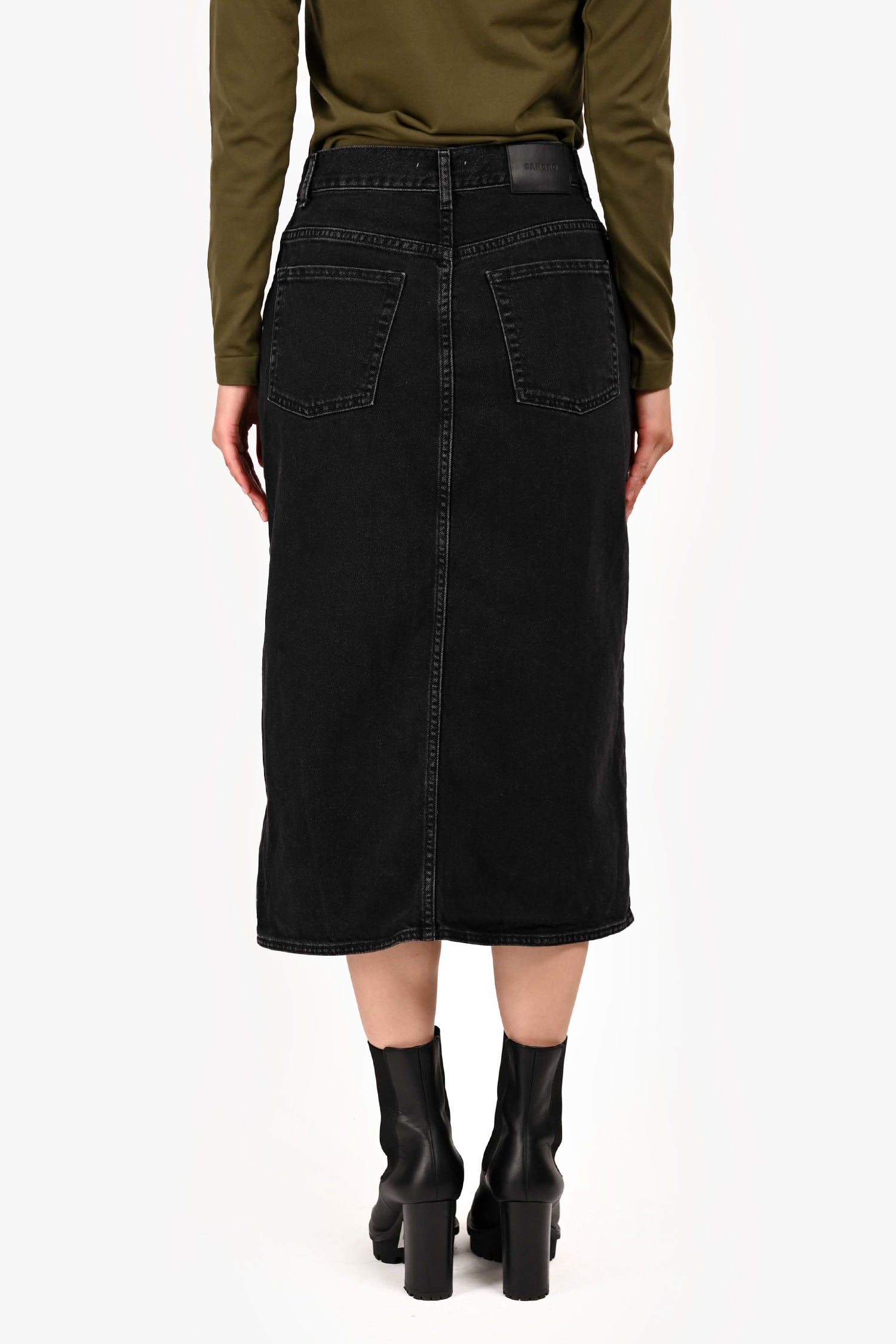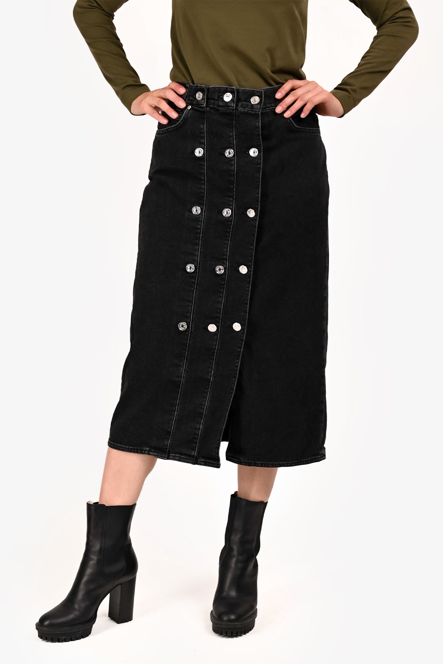 Refresh availabilitySandro Black Denim Button Front Pencil Skirt. Front button-up closures. Front and rear pockets. Waist belt loops. Unlined.