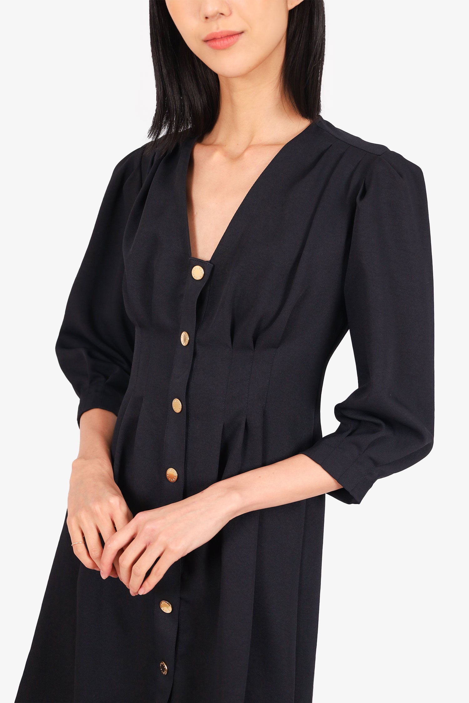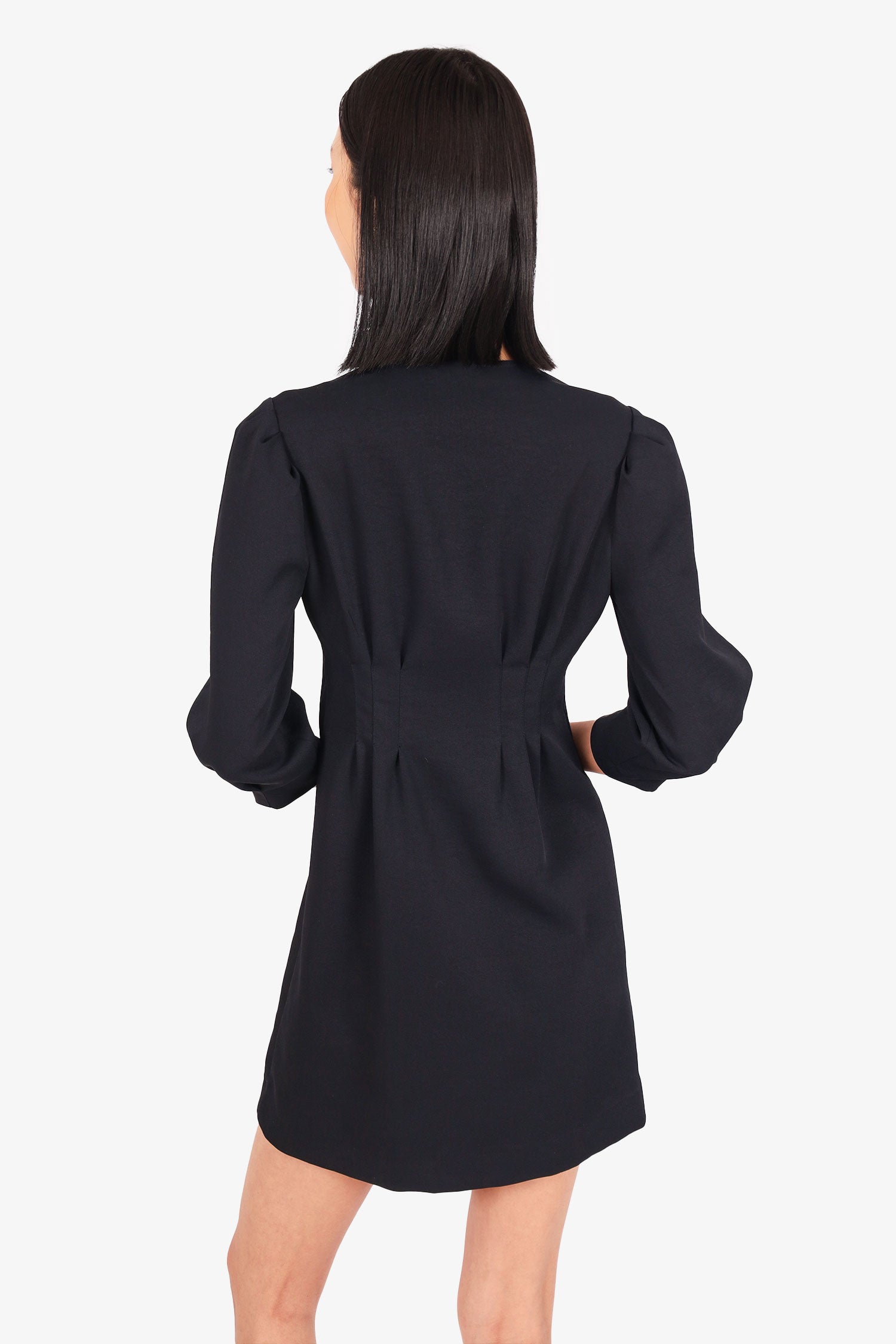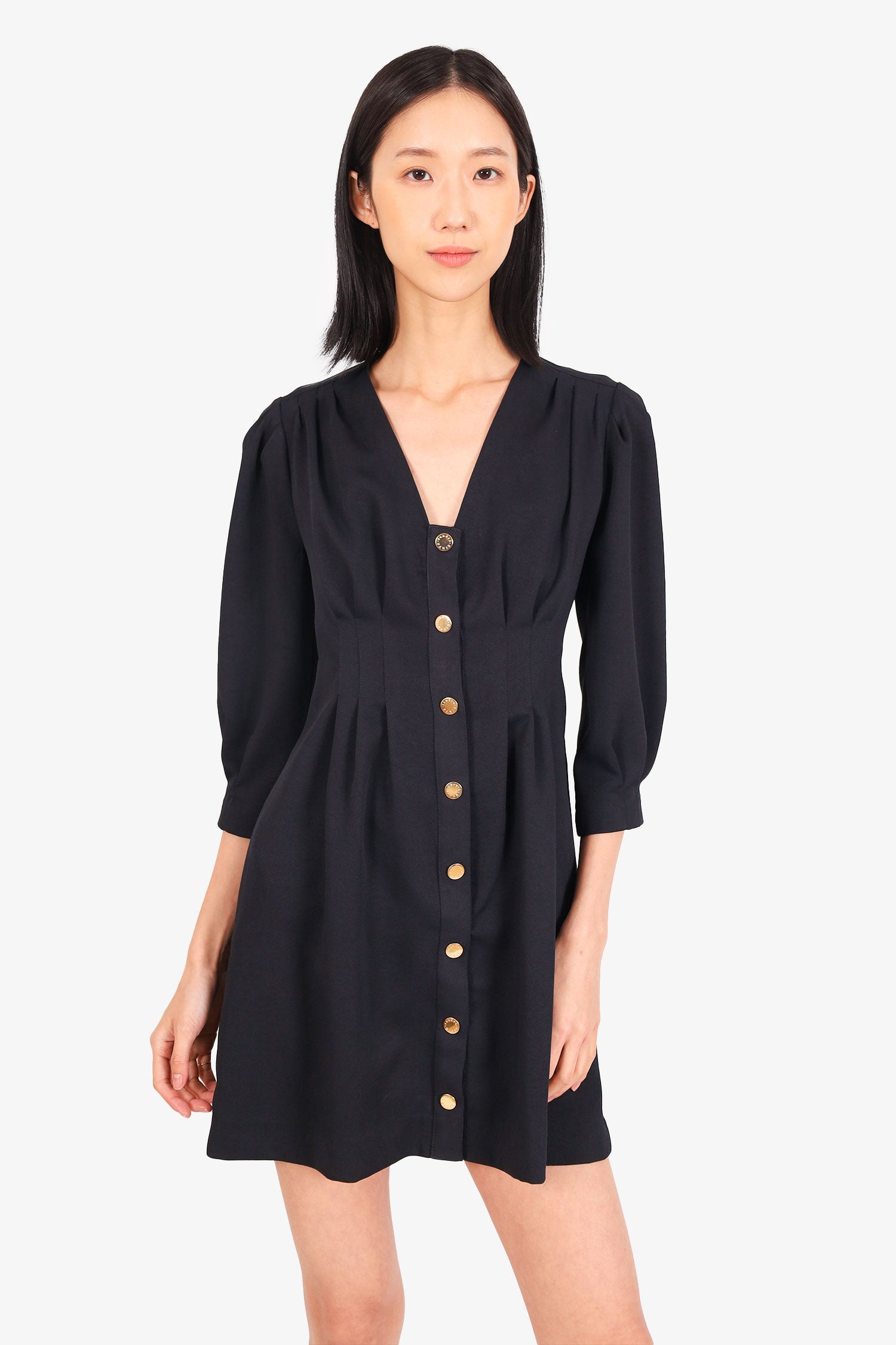 Refresh availabilitySandro Black Gold Button Button Puff Sleeve Mini Dress. V-neckline. Front button-up closure. 3/4 sleeve length. Elasticated waist detail. Gold-tone hardware. Unlined. Tonal stitching.