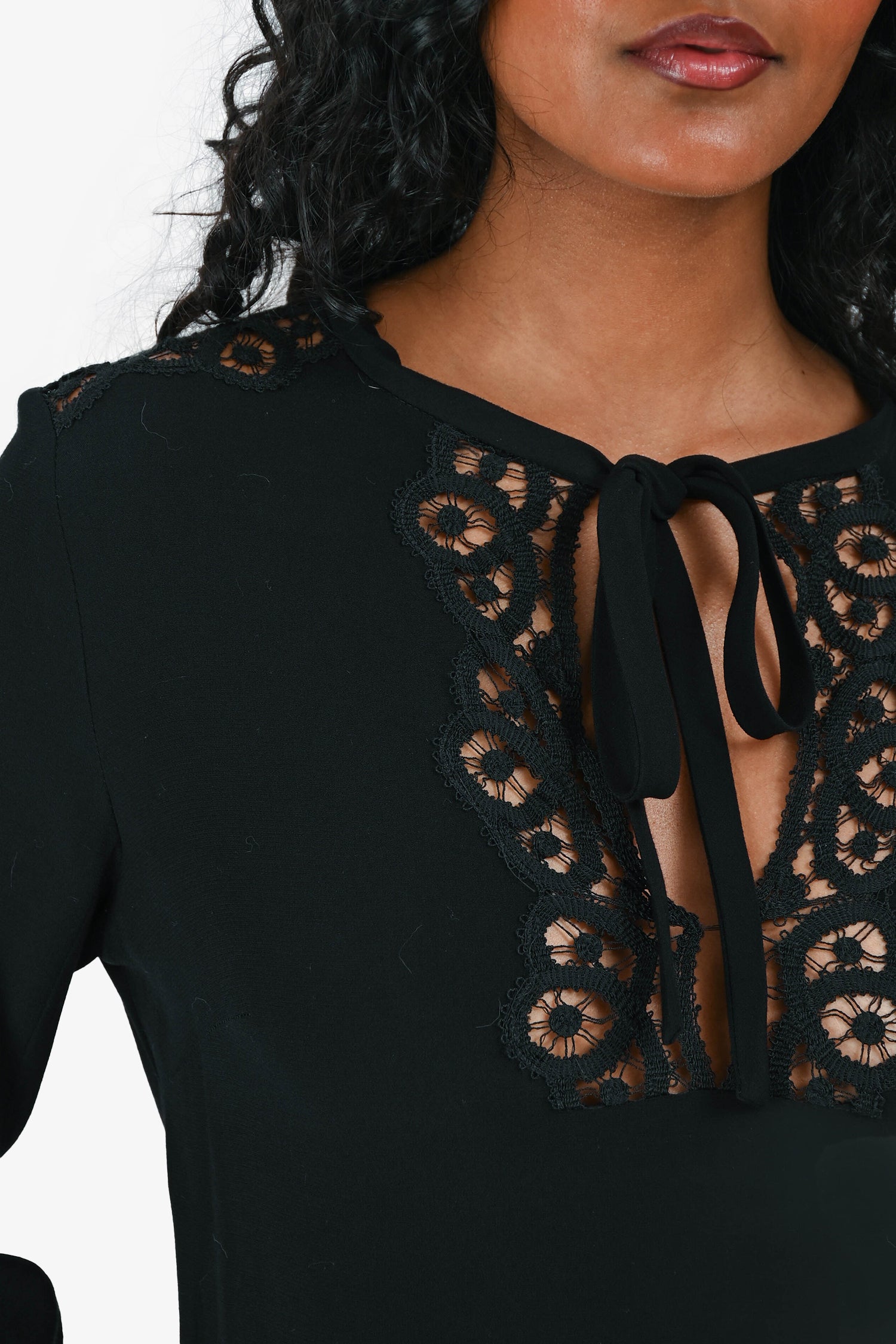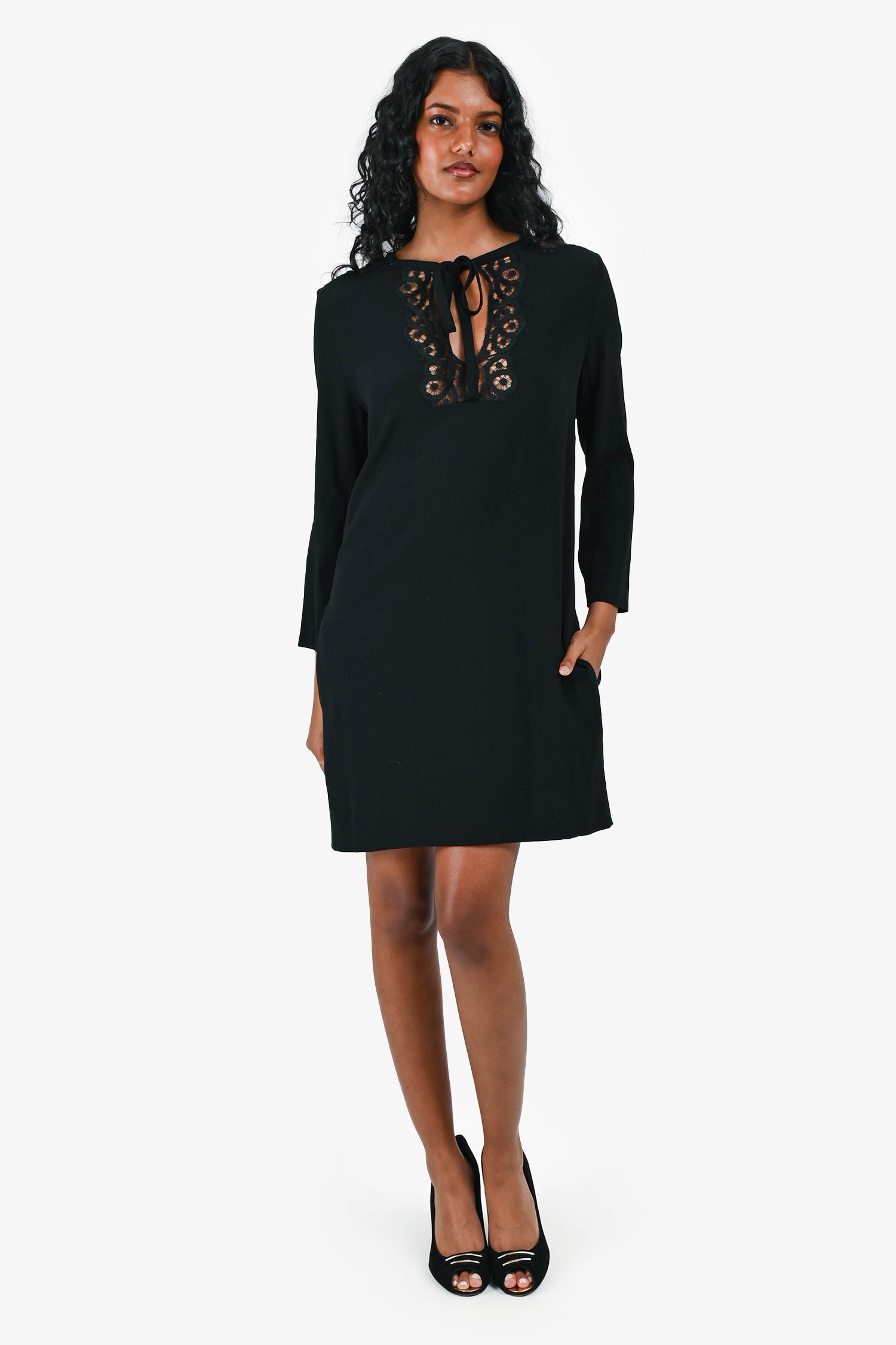 Refresh availabilitySandro Black Lace Detail Shift Dress. V-neckline with tie detail. Long sleeves. Side pockets. Back zip closure. Tonal stitching.
