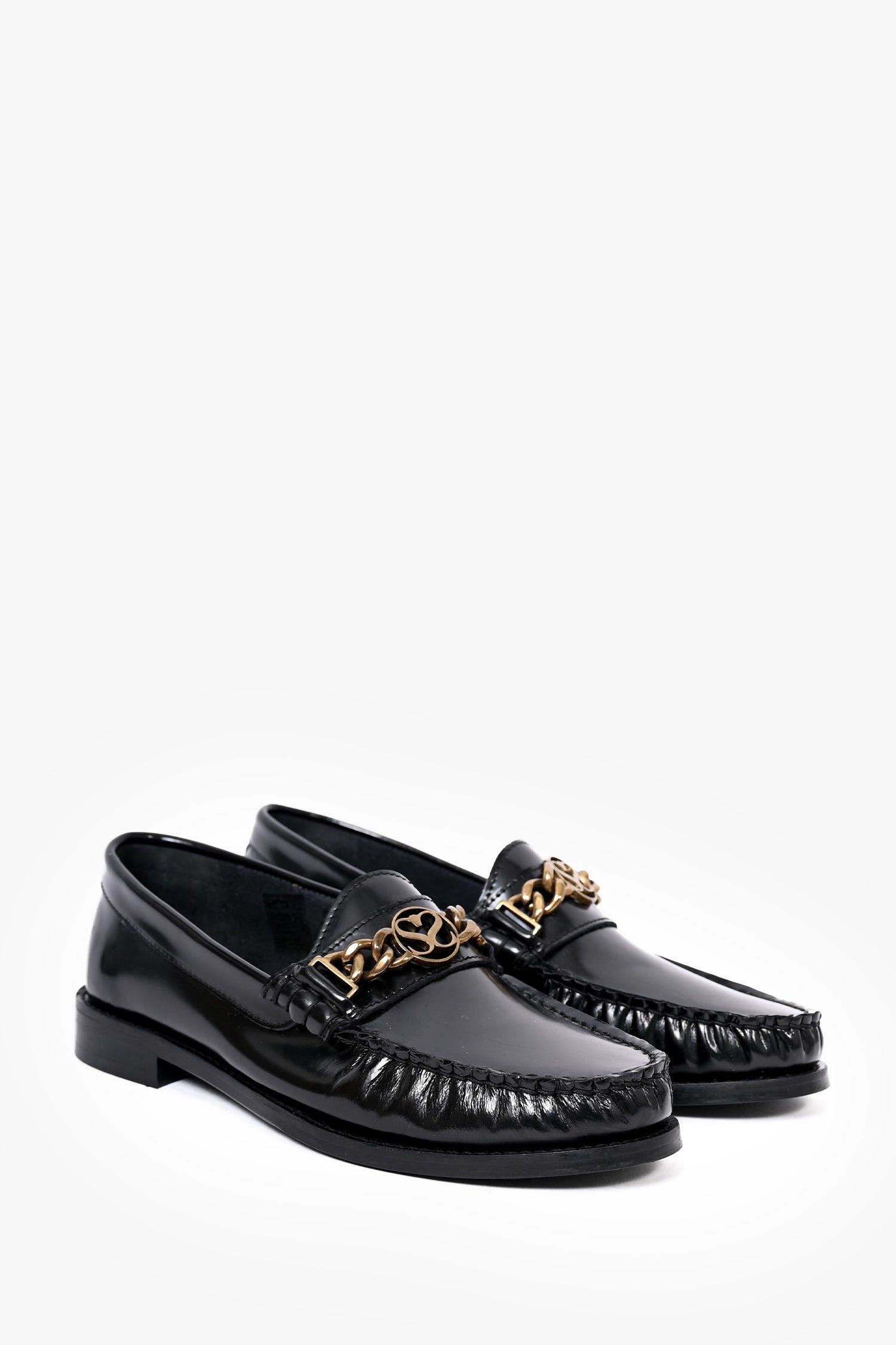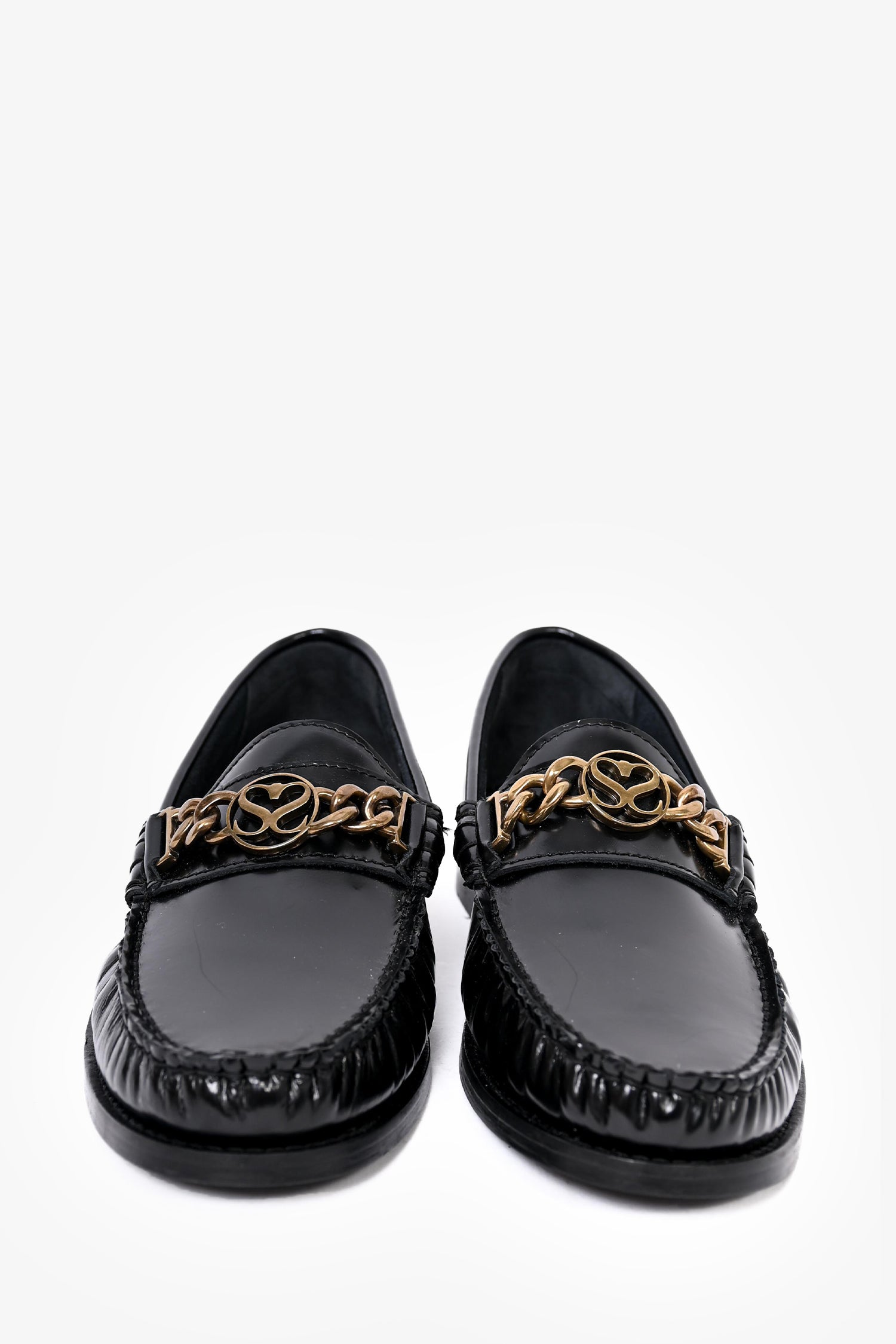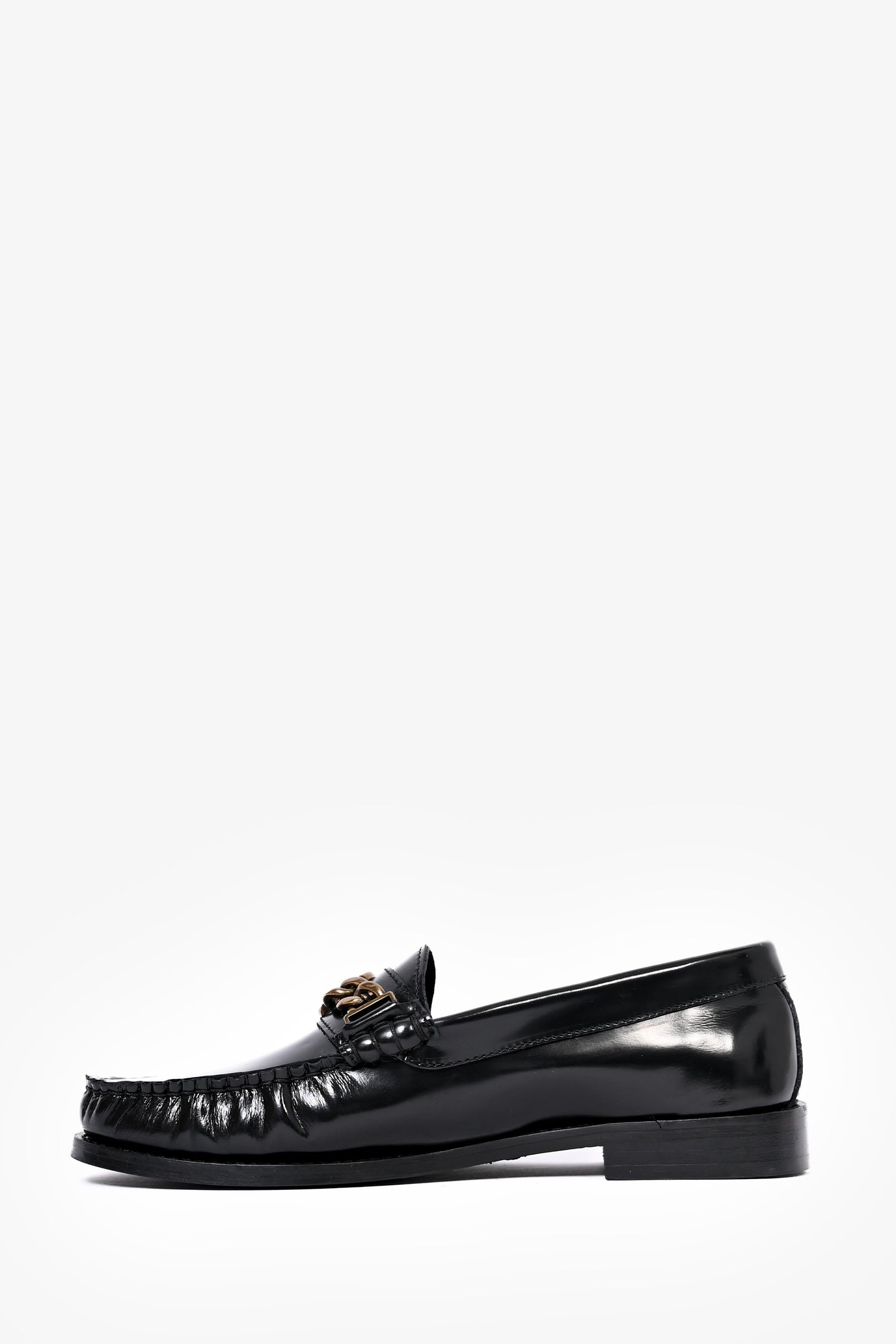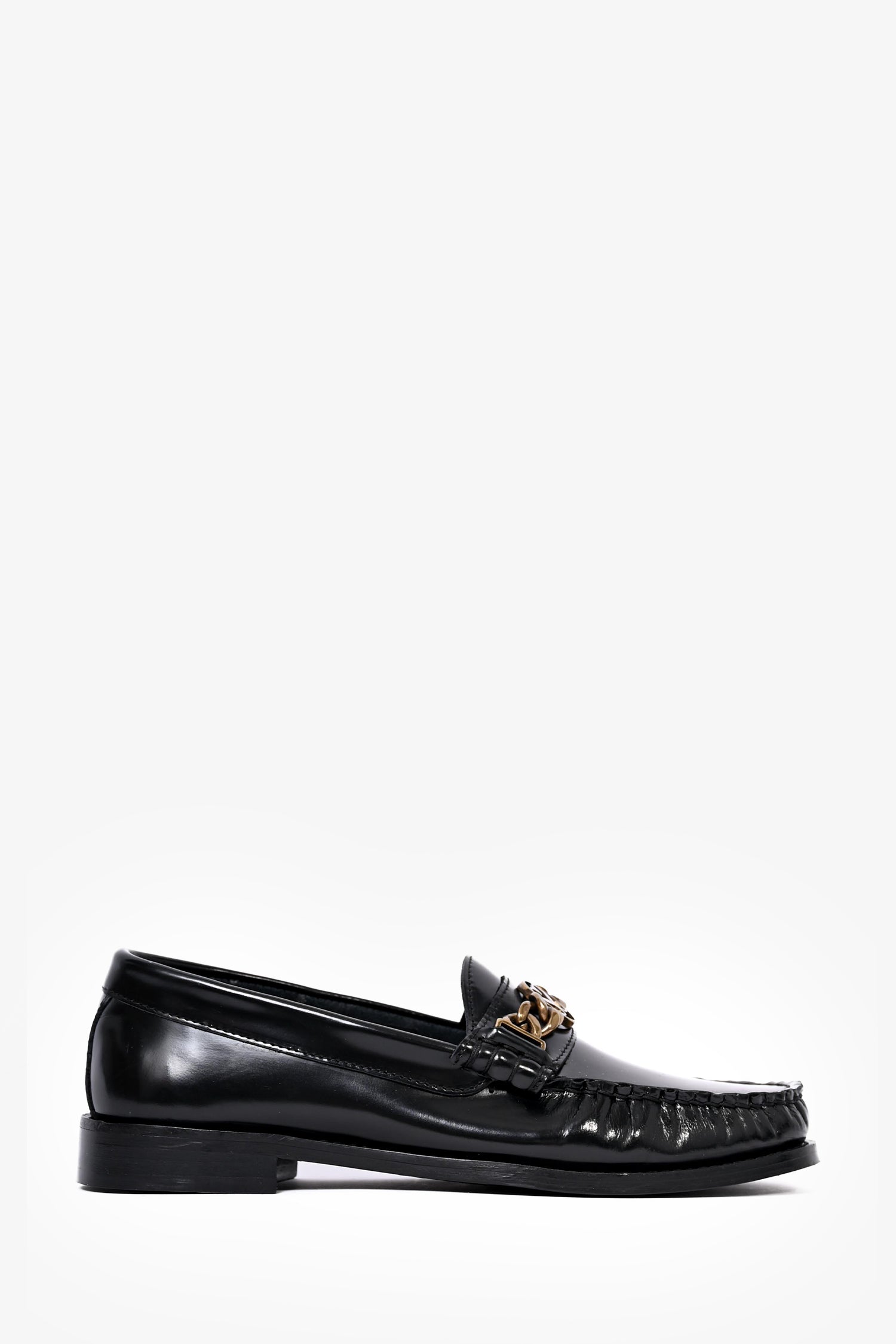Refresh availabilitySandro Black Leather Chain Detail Loafers. Rounded toe. Gold-tone hardware. Tonal stitching.