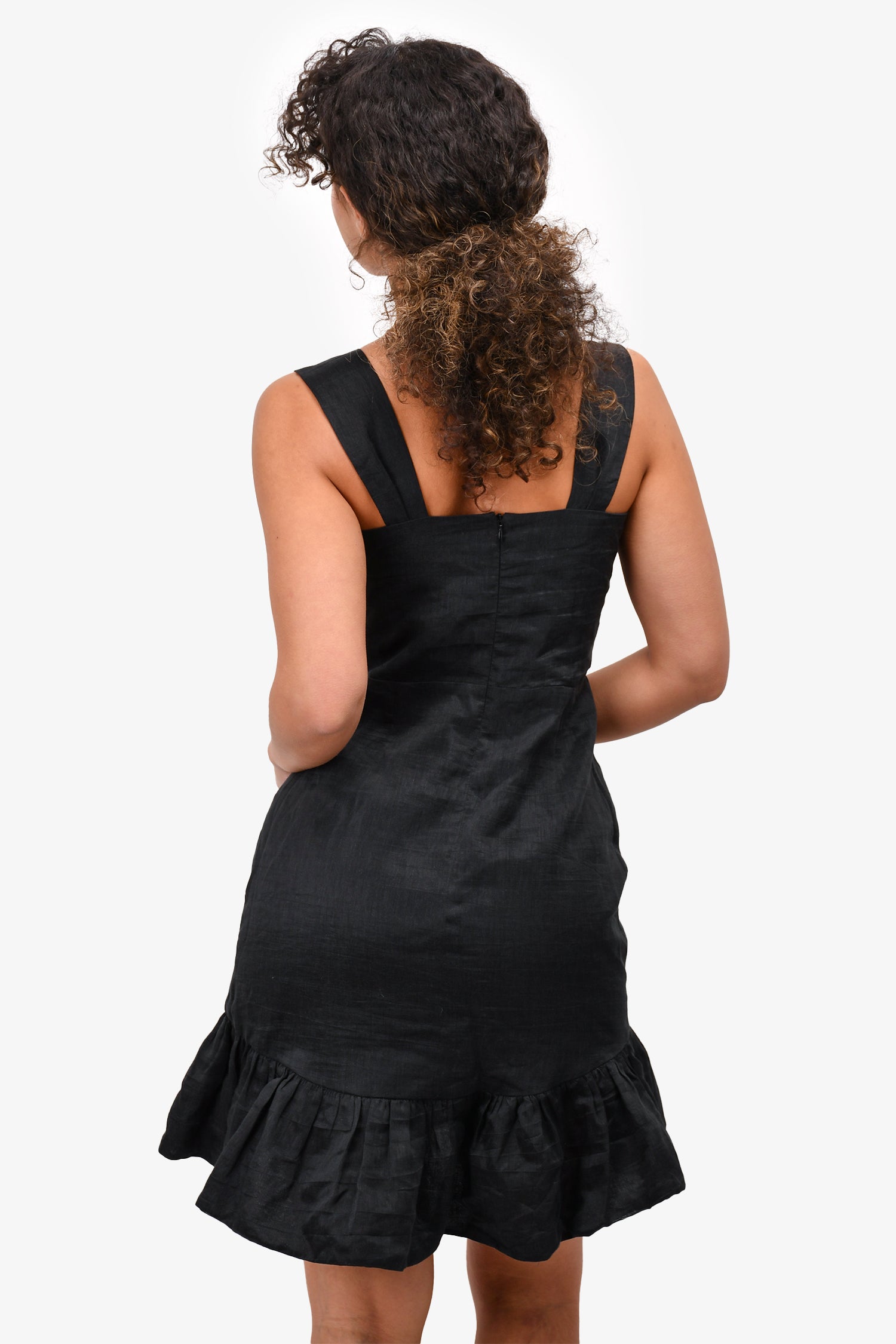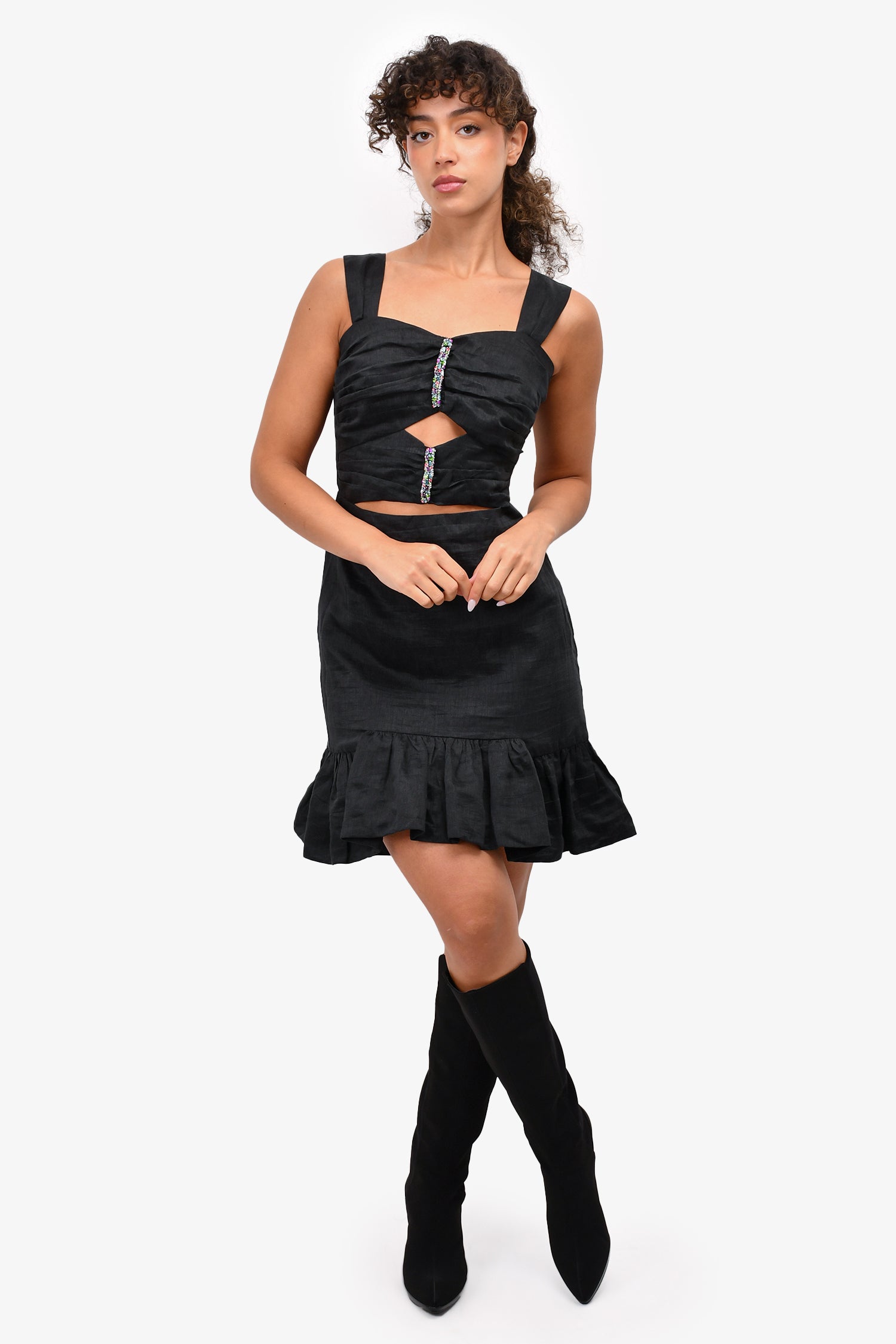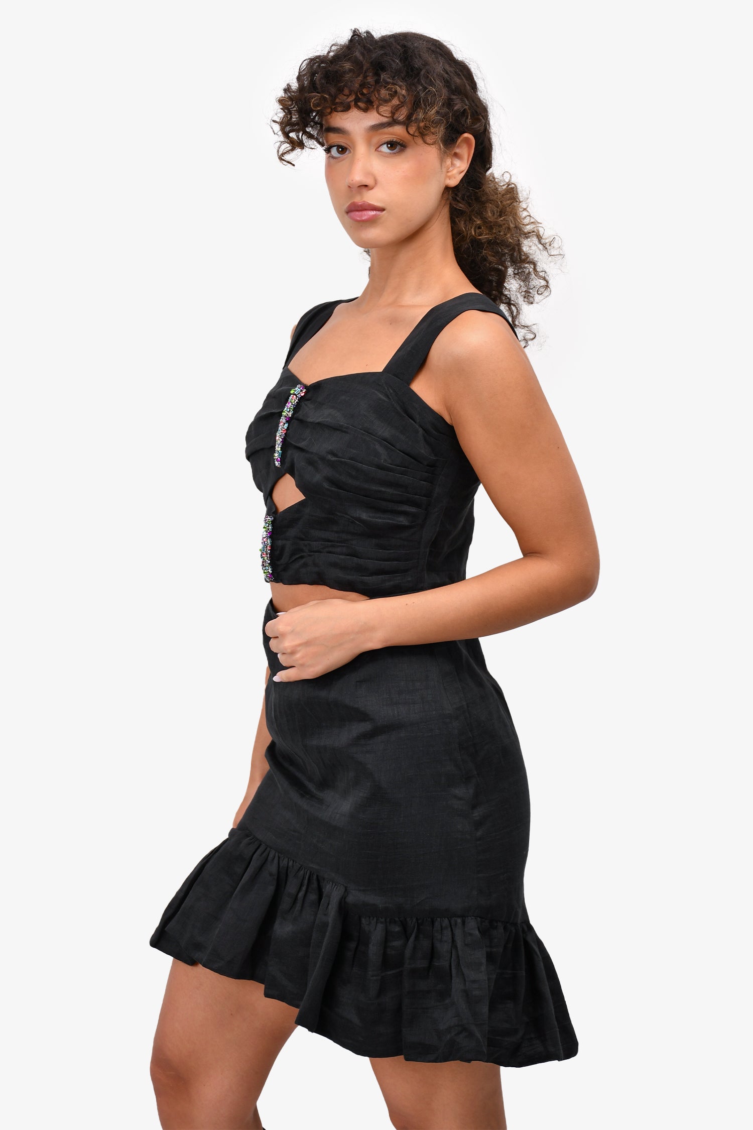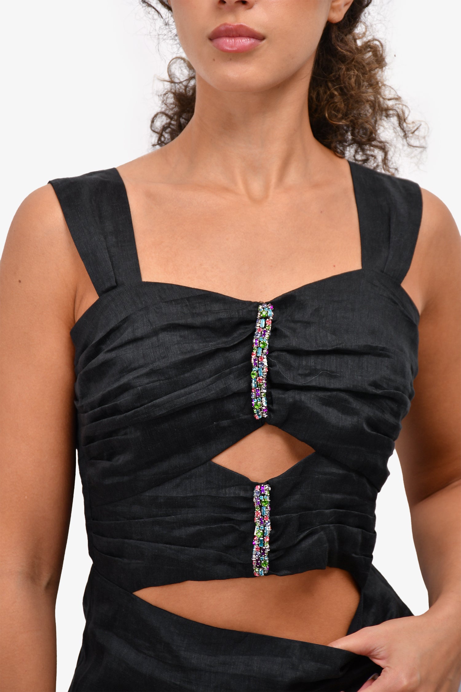 Refresh availabilitySandro Black Linen Blend Sleeveless Cutout Dress with Multicolour Rhinestones. Rear zip closure. Lined.