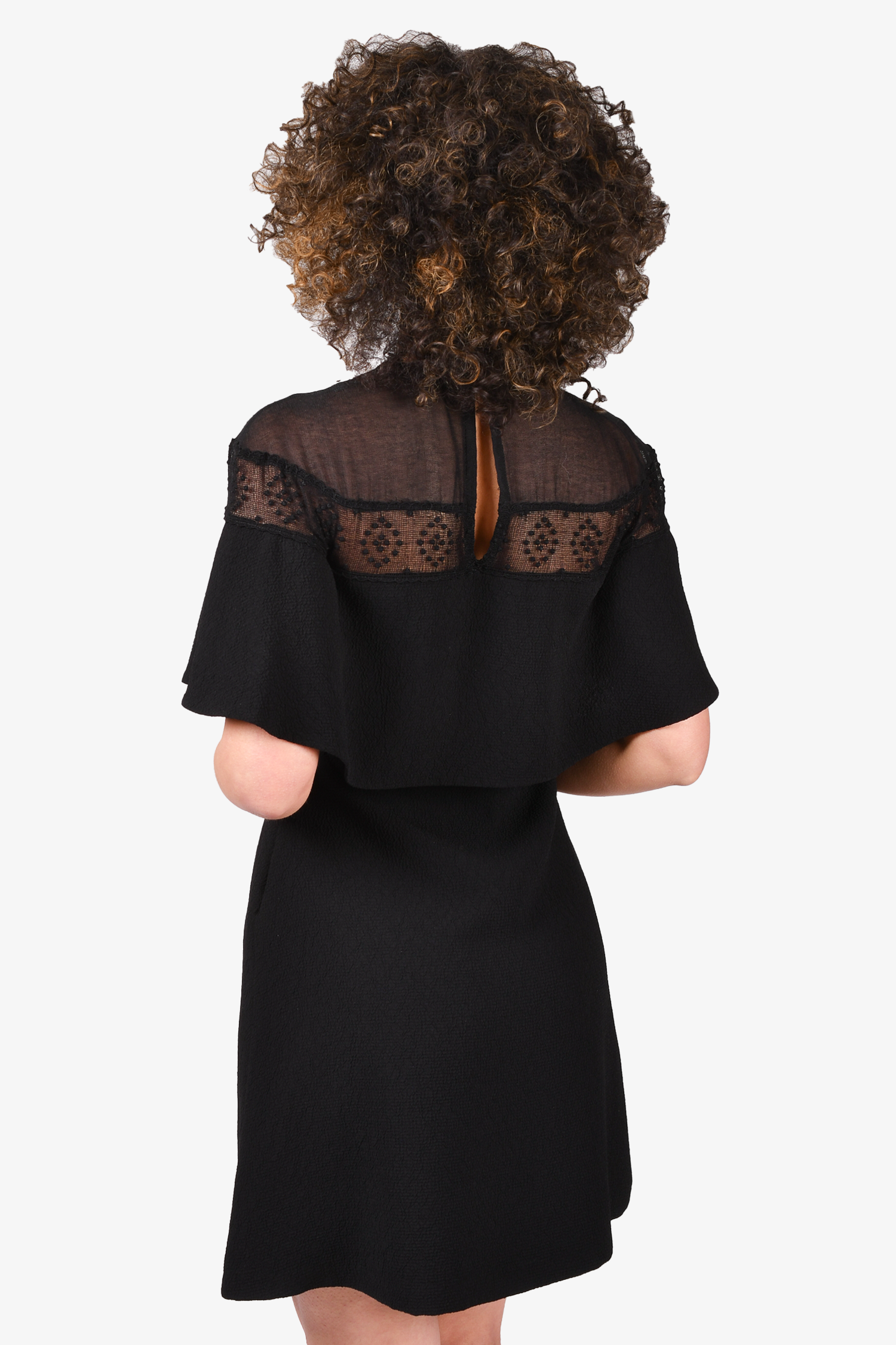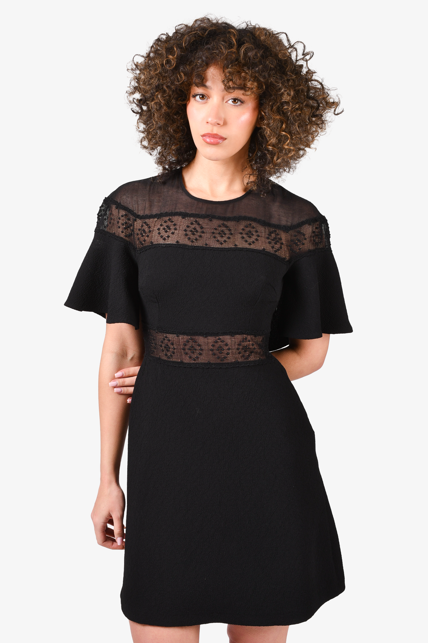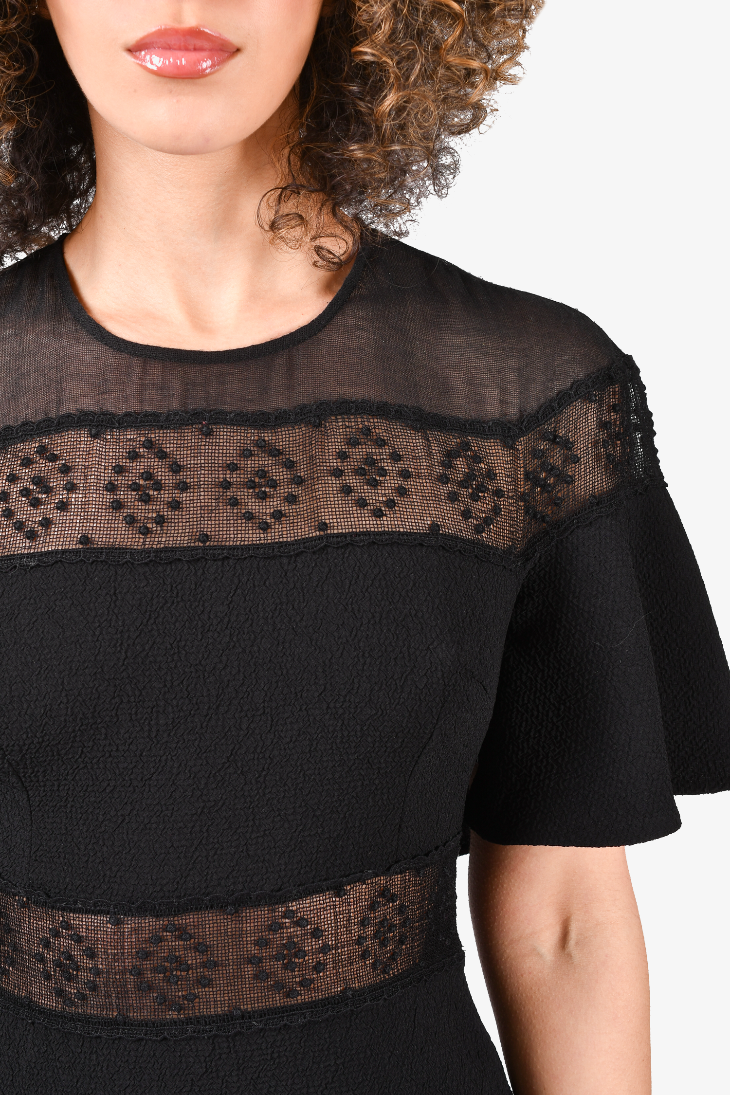 Refresh availabilitySandro Black Ruffle Dress with Sheer Detail Dress. Round neck. Rear button closure. Lined. Tonal stitching.