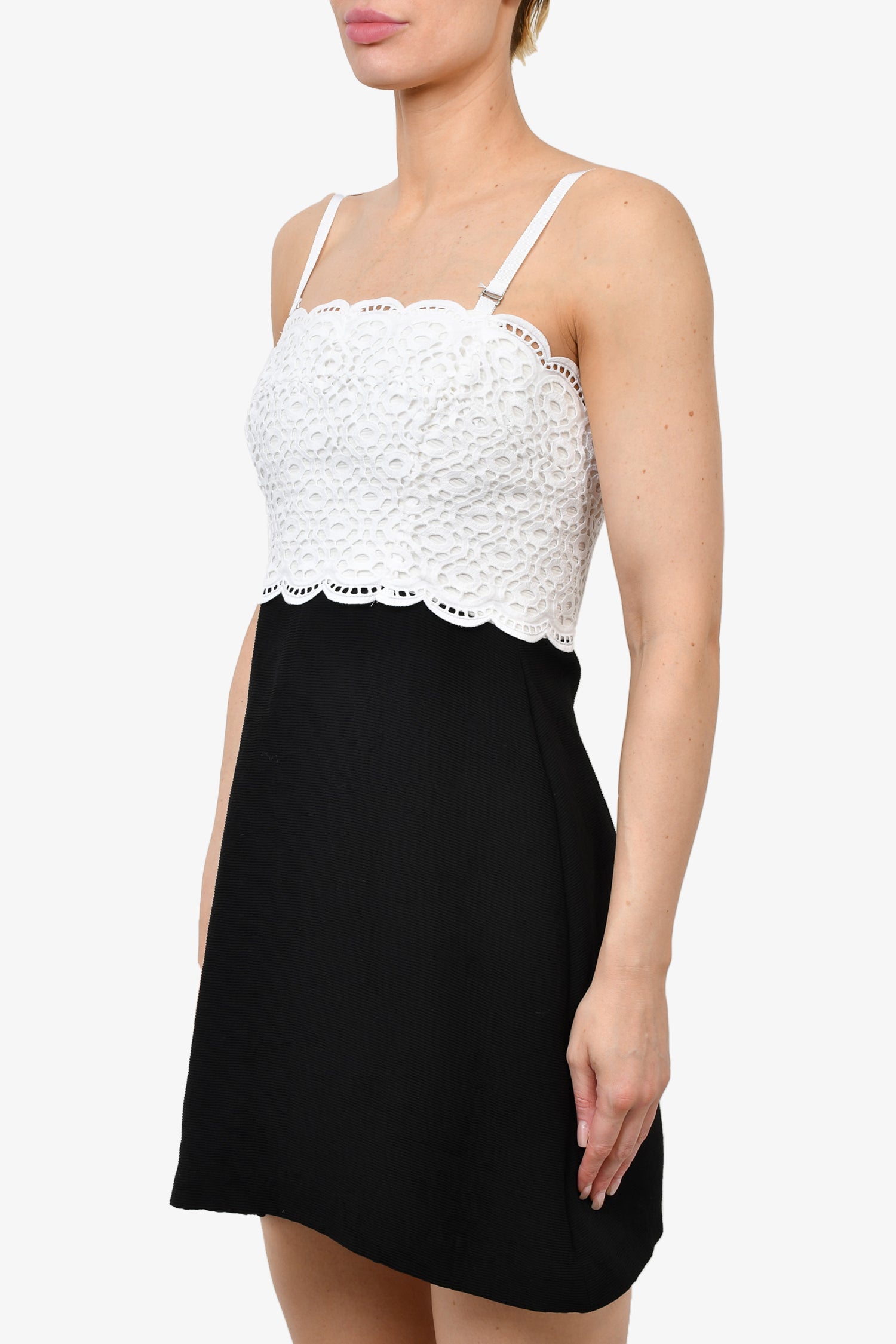 Refresh availabilitySandro Black/White Sleeveless Mini Dress with Eyelet Lace Detailing. Adjustable straps. Rear zip closure. Tonal stitching.