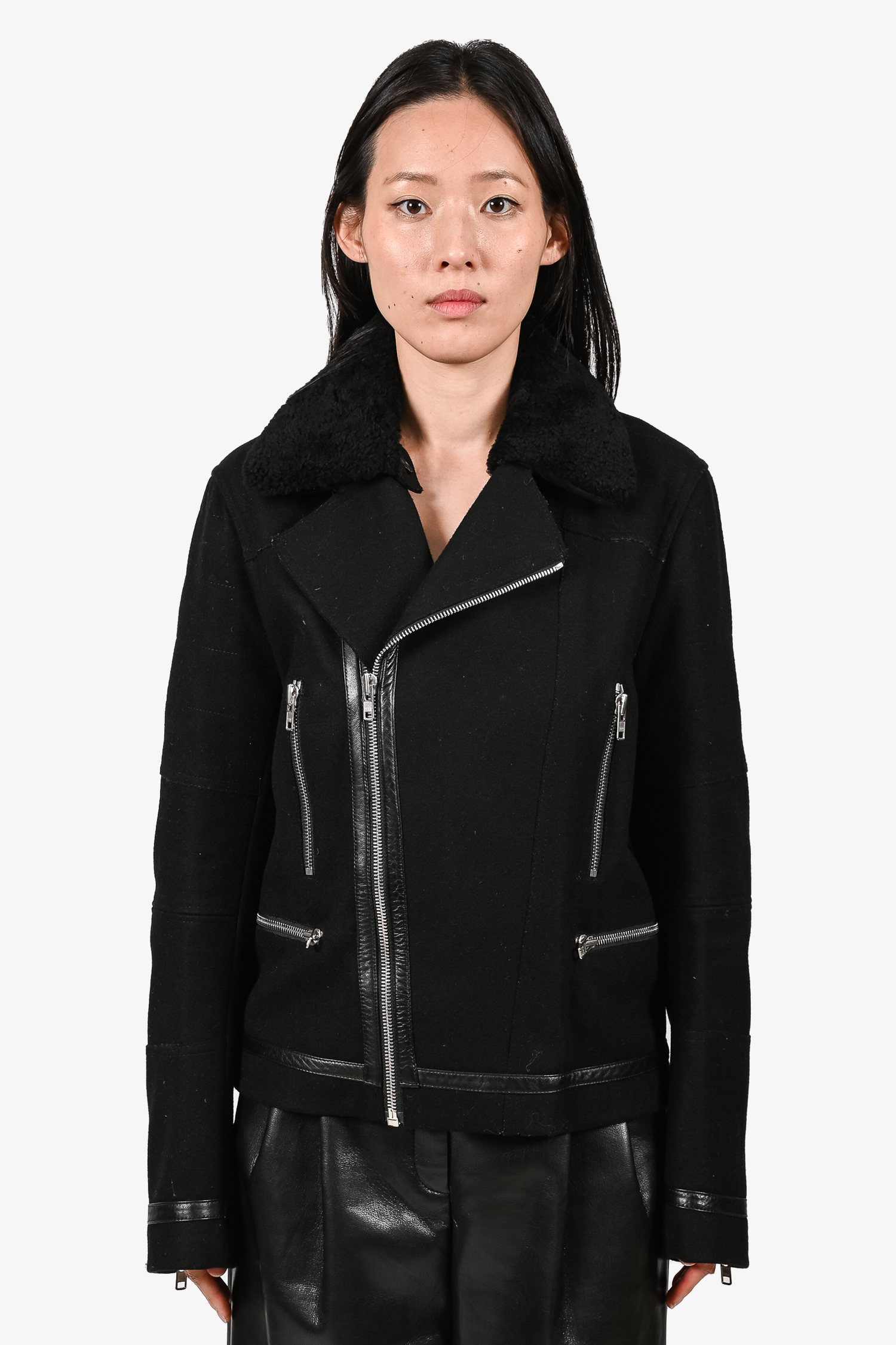Refresh availabilitySandro Black Wool Biker Jacket. Front zip closure. Front zip pockets. Zip details on the cuffs. Lined. Tonal stitching.