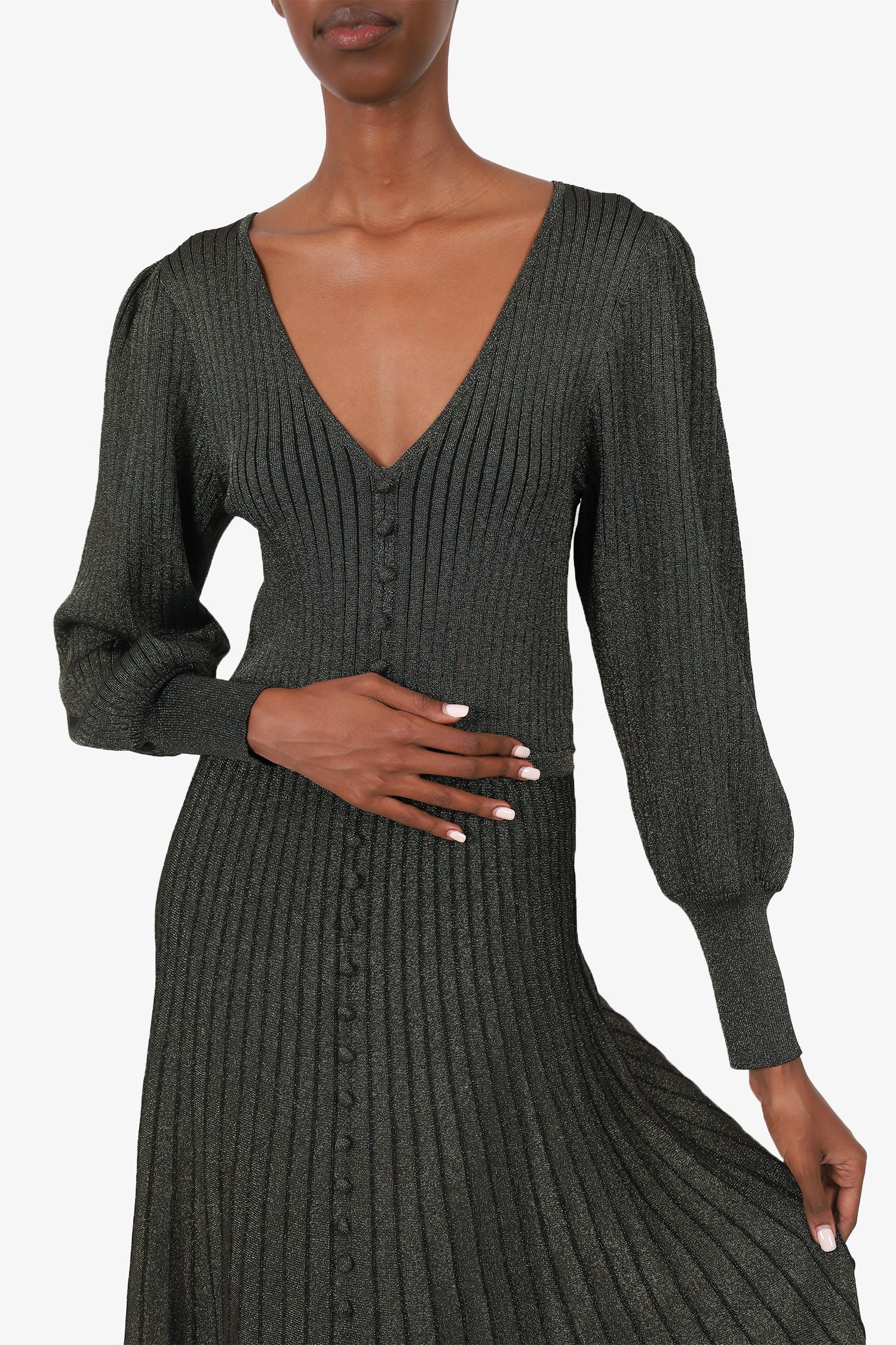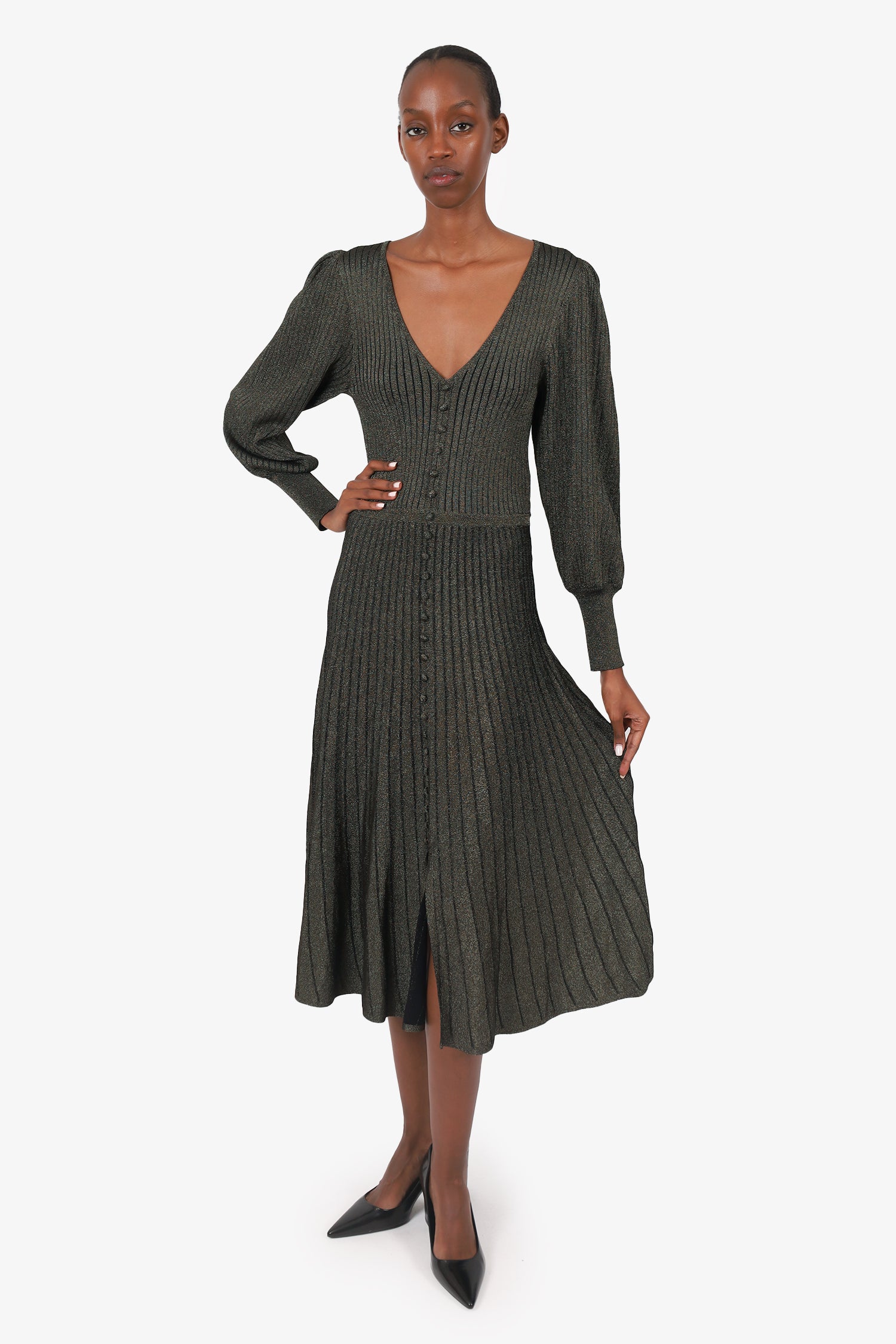 Refresh availabilitySandro Black/Gold Metallic Ribbed-knit Dress. Pull-on. V-neckline. Front exterior button details. Tonal stitching.