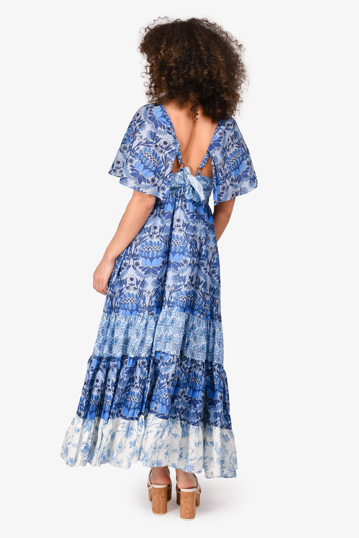 Sandro Blue Linen Floral Printed Tiered Dress Size 40