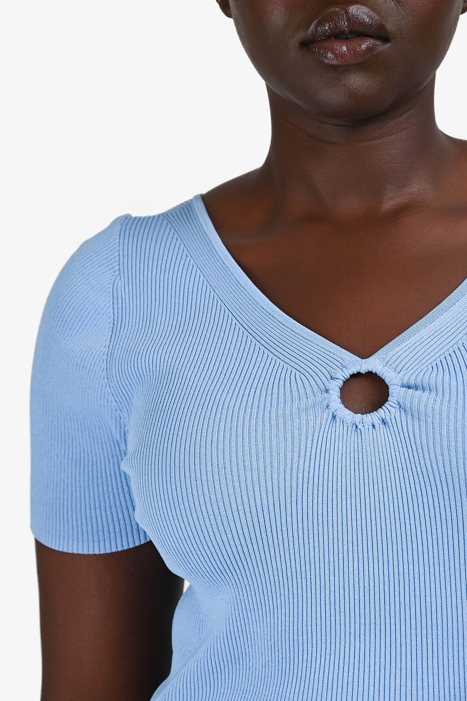 Refresh availabilitySandro Blue Ribbed Knit Short Sleeves Top. V neckline with cutout detail. Short sleeves. Pull-on style. Tonal stitching.