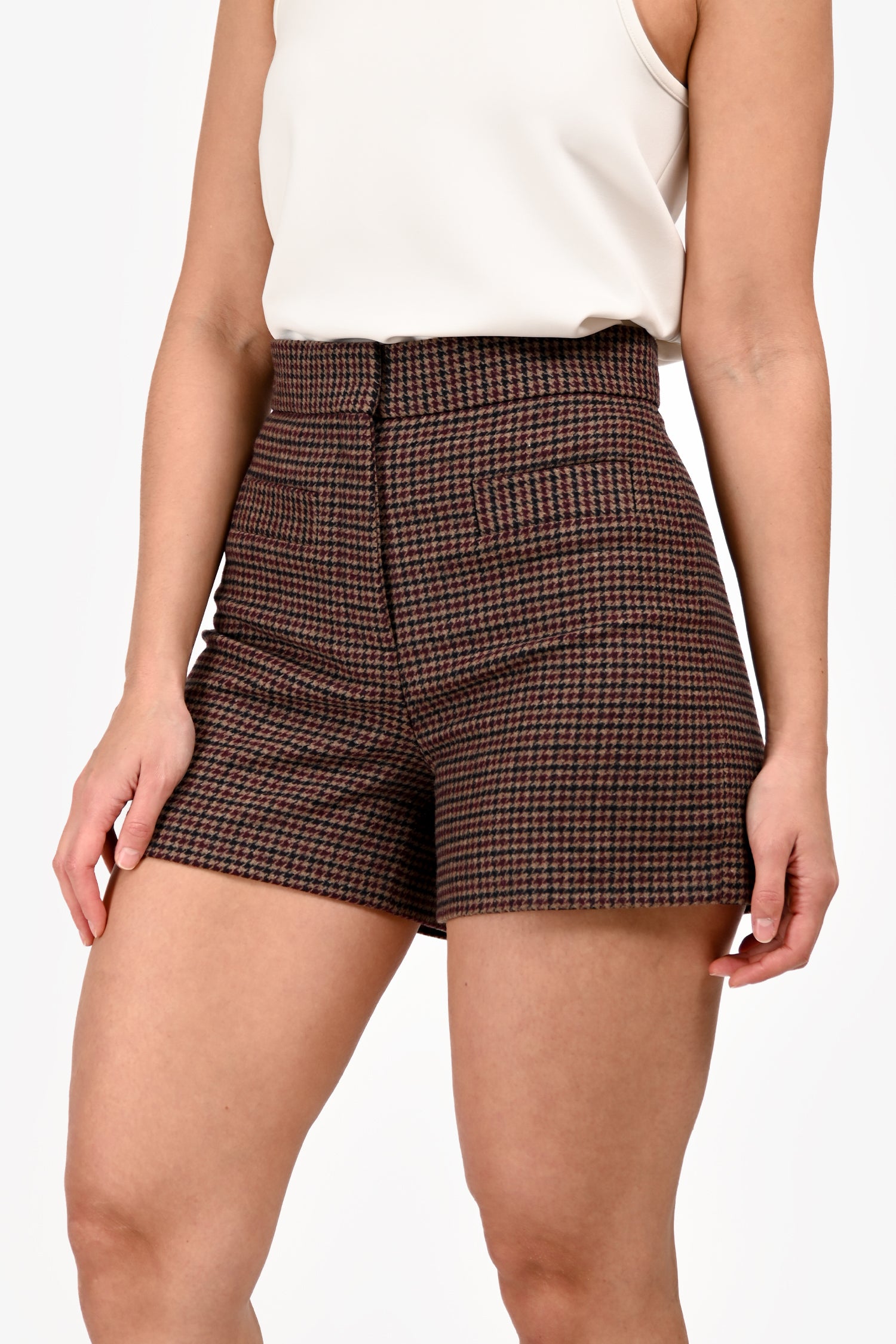 Refresh availabilitySandro Brown/Burgundy Wool Blend Houndstooth High-Waisted Shorts. Pull-on. Hidden zip and hook-and-eye closure in the front. 2 welt pockets in the front. Silver-tone hardware. Tonal stitching.