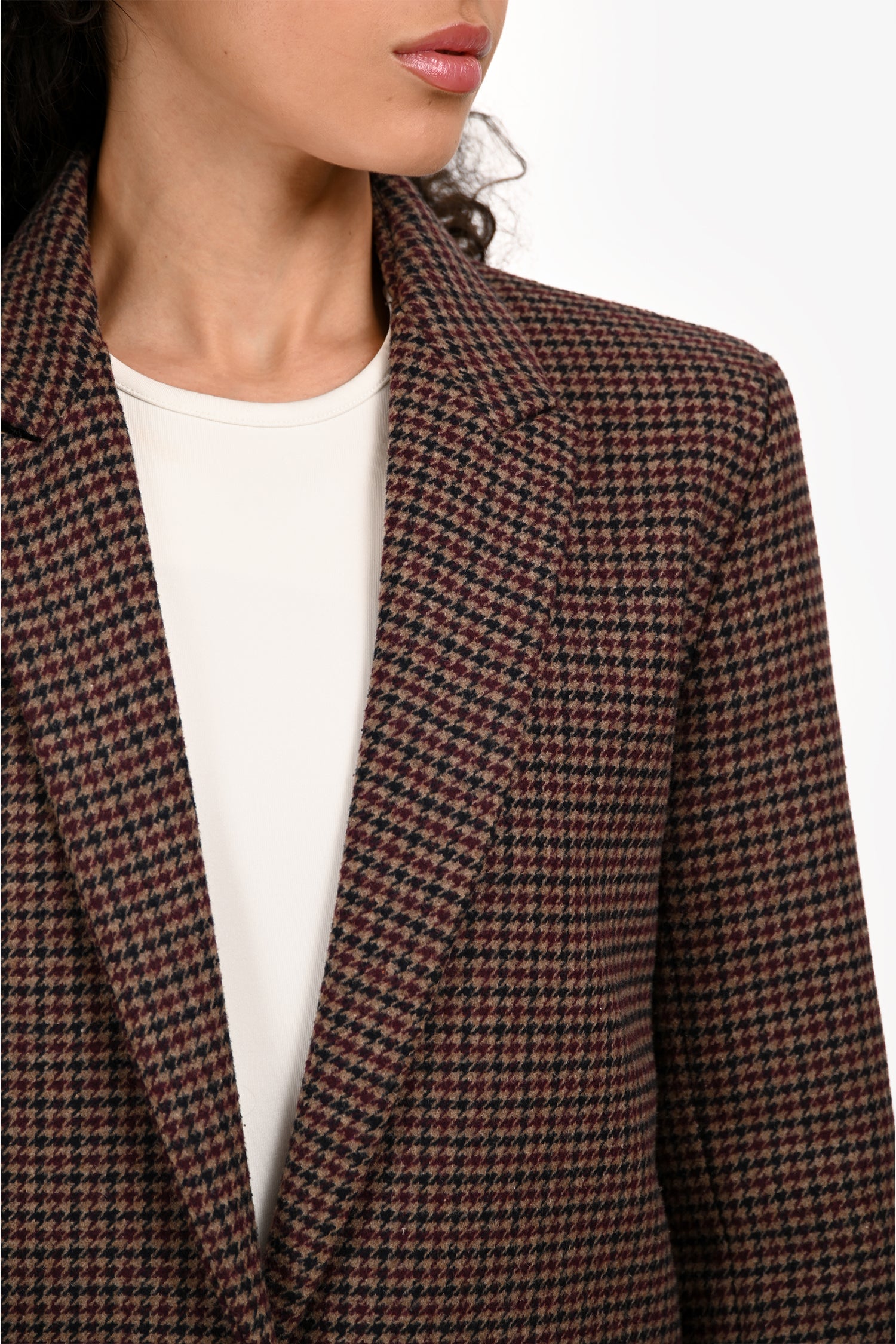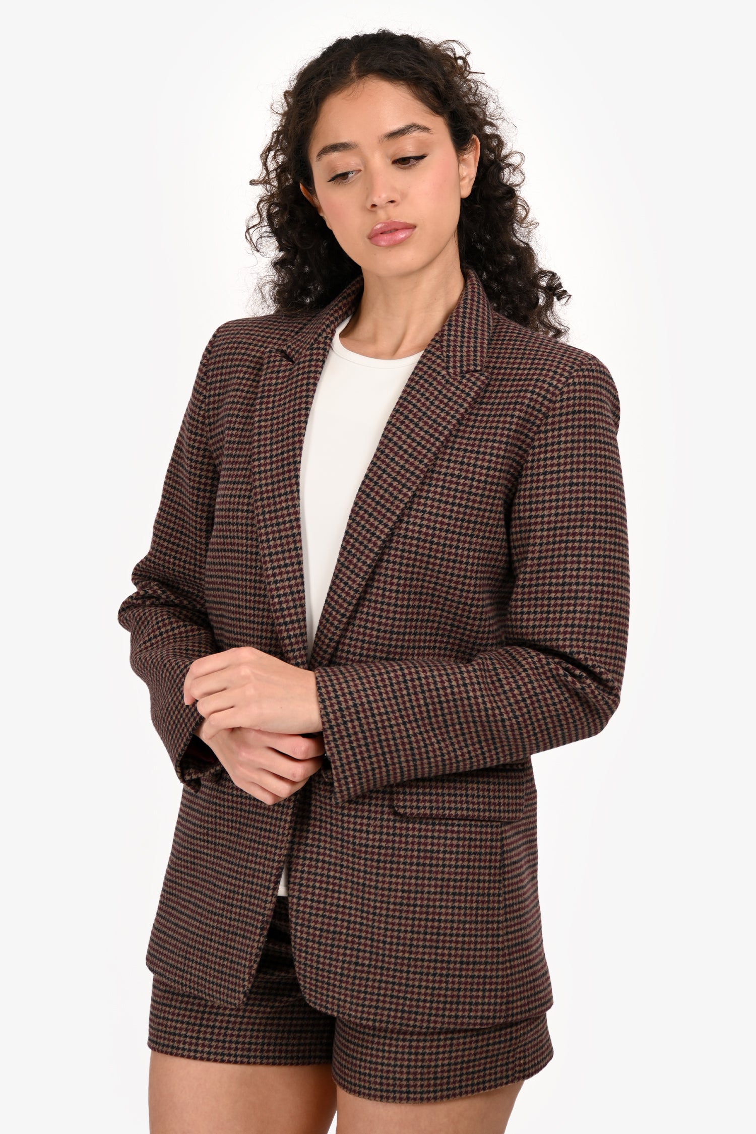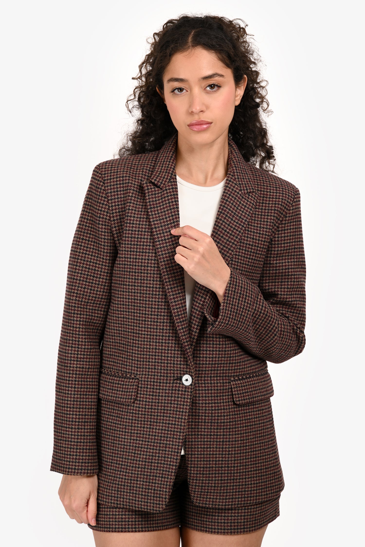 Refresh availabilitySandro Brown/Burgundy Wool Blend Houndstooth Single Breasted Blazer. Slip-on. Peak lapels. Button closure in the front. 2 welt pockets with fold-over closure in the front. Lined. Tonal stitching.