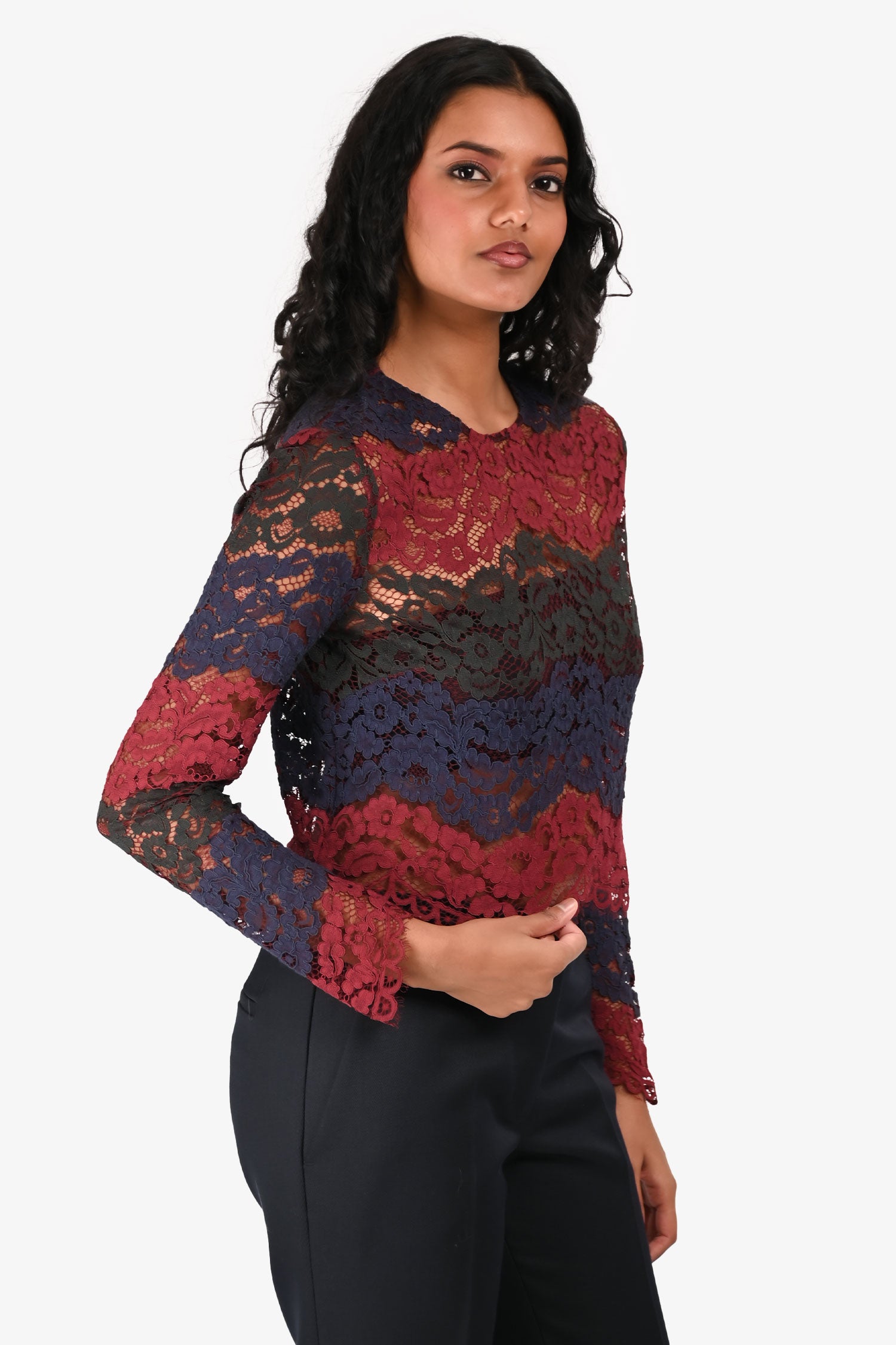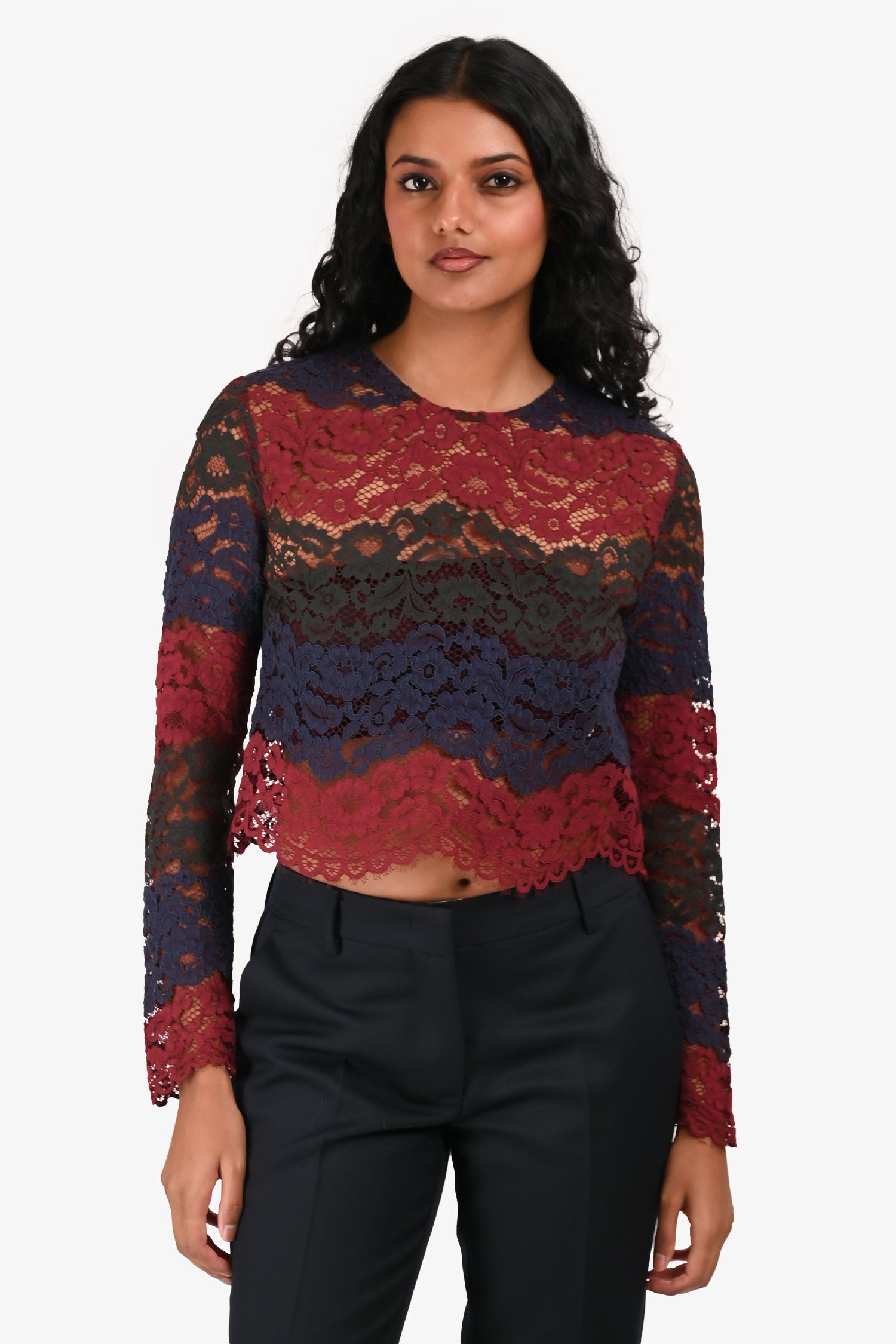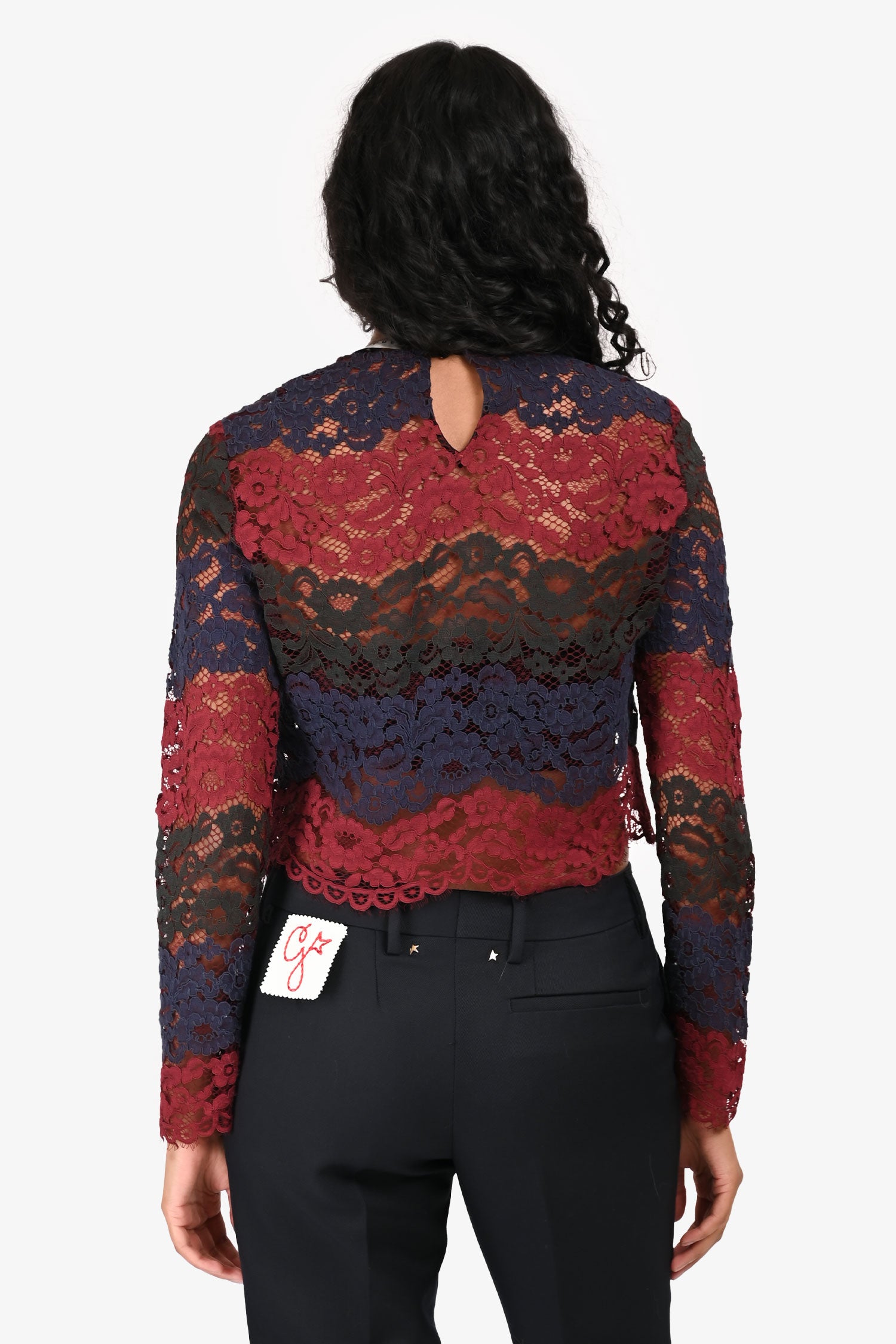Sandro Burgundy/Navy/Green Lace Cropped Long Sleeve Top Size 1