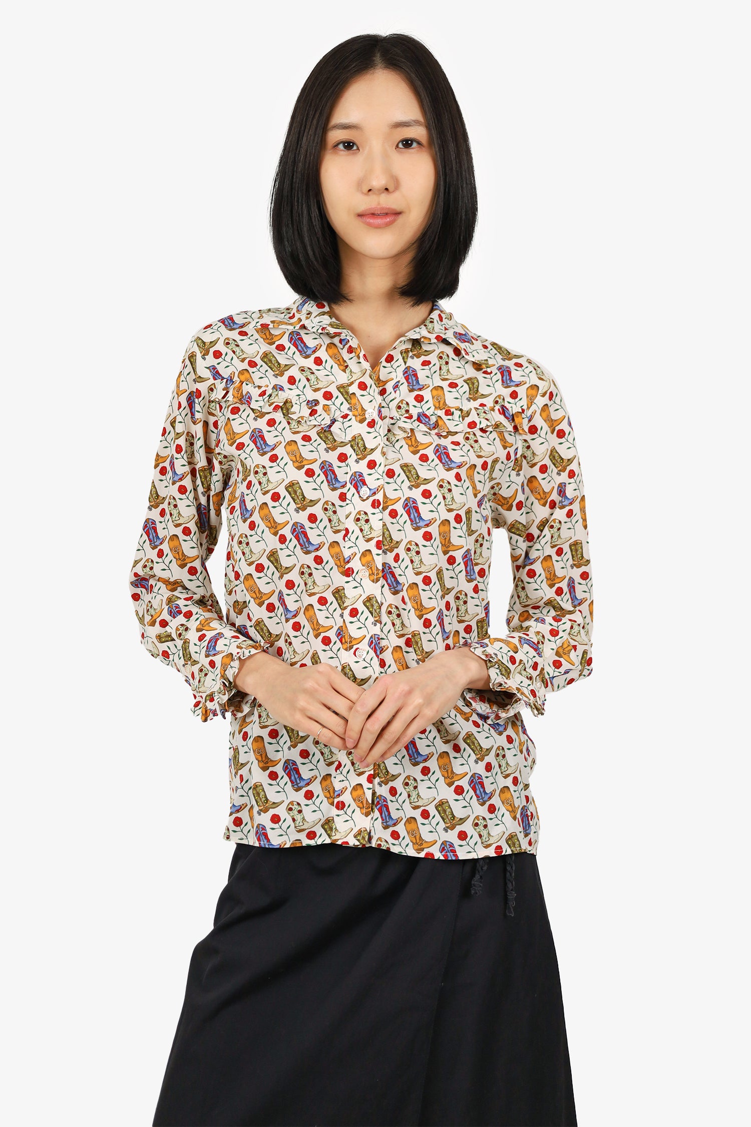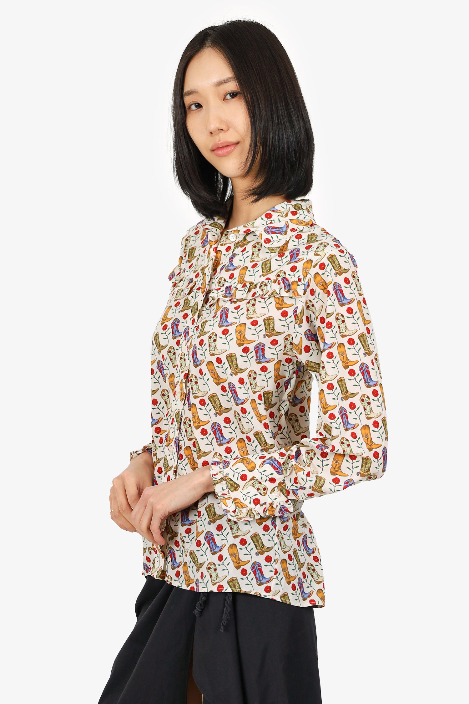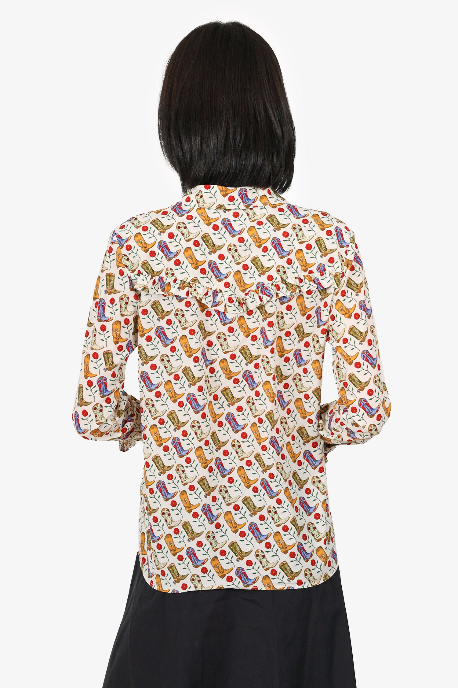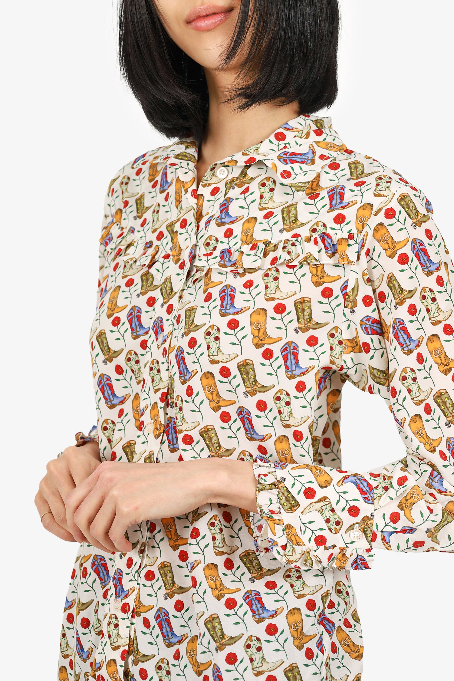Refresh availabilitySandro Cream/ Brown Western Boot Ruffle Detail Button Down Top. Collared neckline. Front button-up closure. Sleeve cuffs with button-up closure. Tonal stitching.