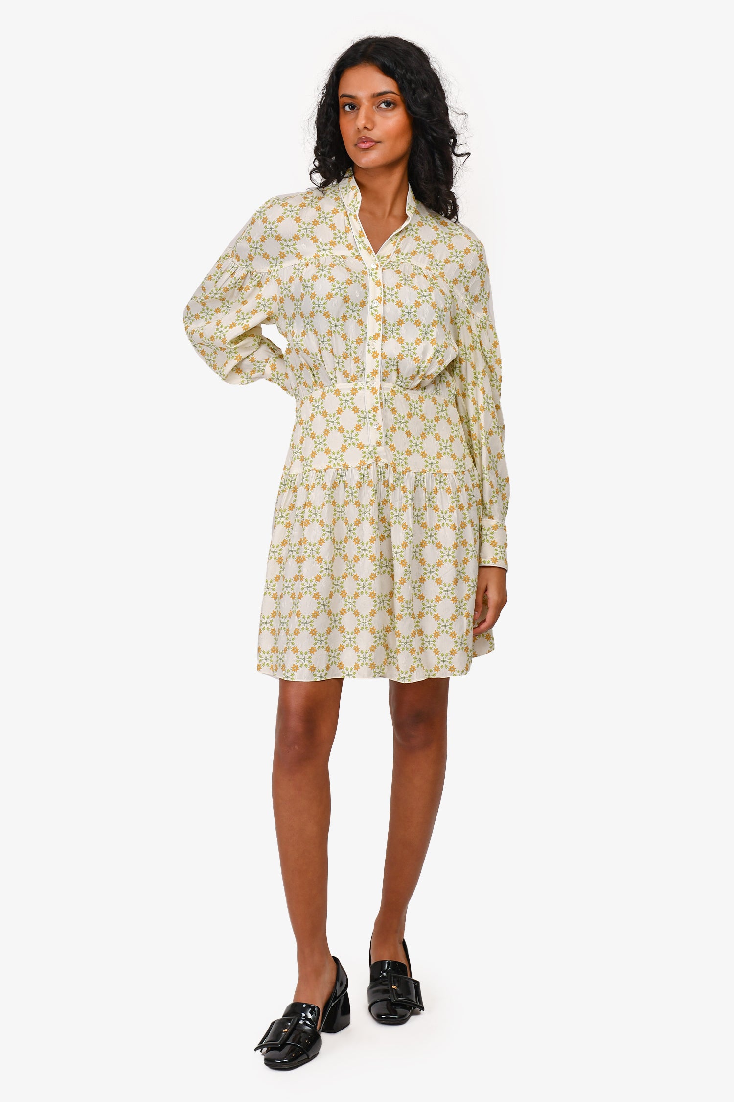 Refresh availabilitySandro Cream Floral Button Down Shirt Dress. Front button down. Button closures on the cuffs. White piped trimming. Tonal stitching.