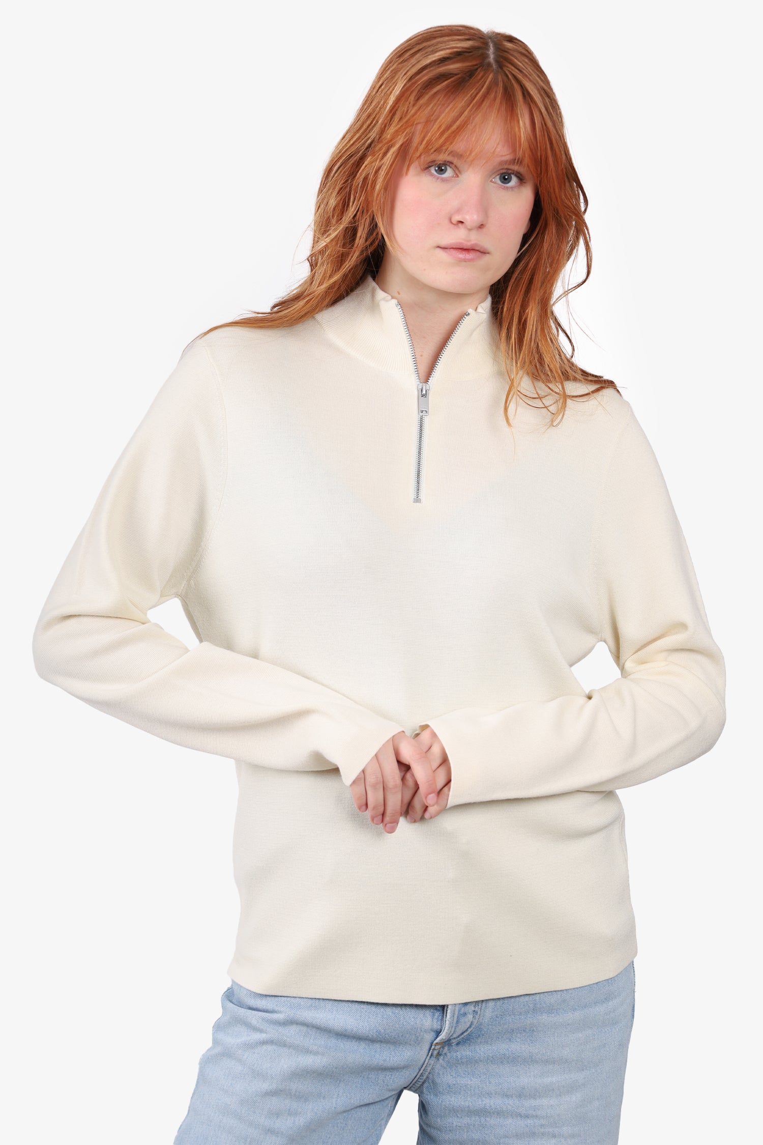 Refresh availabilitySandro Cream Wool Half Zip Mock Neck Sweater. High neckline. Pull-on. Tonal stitching.