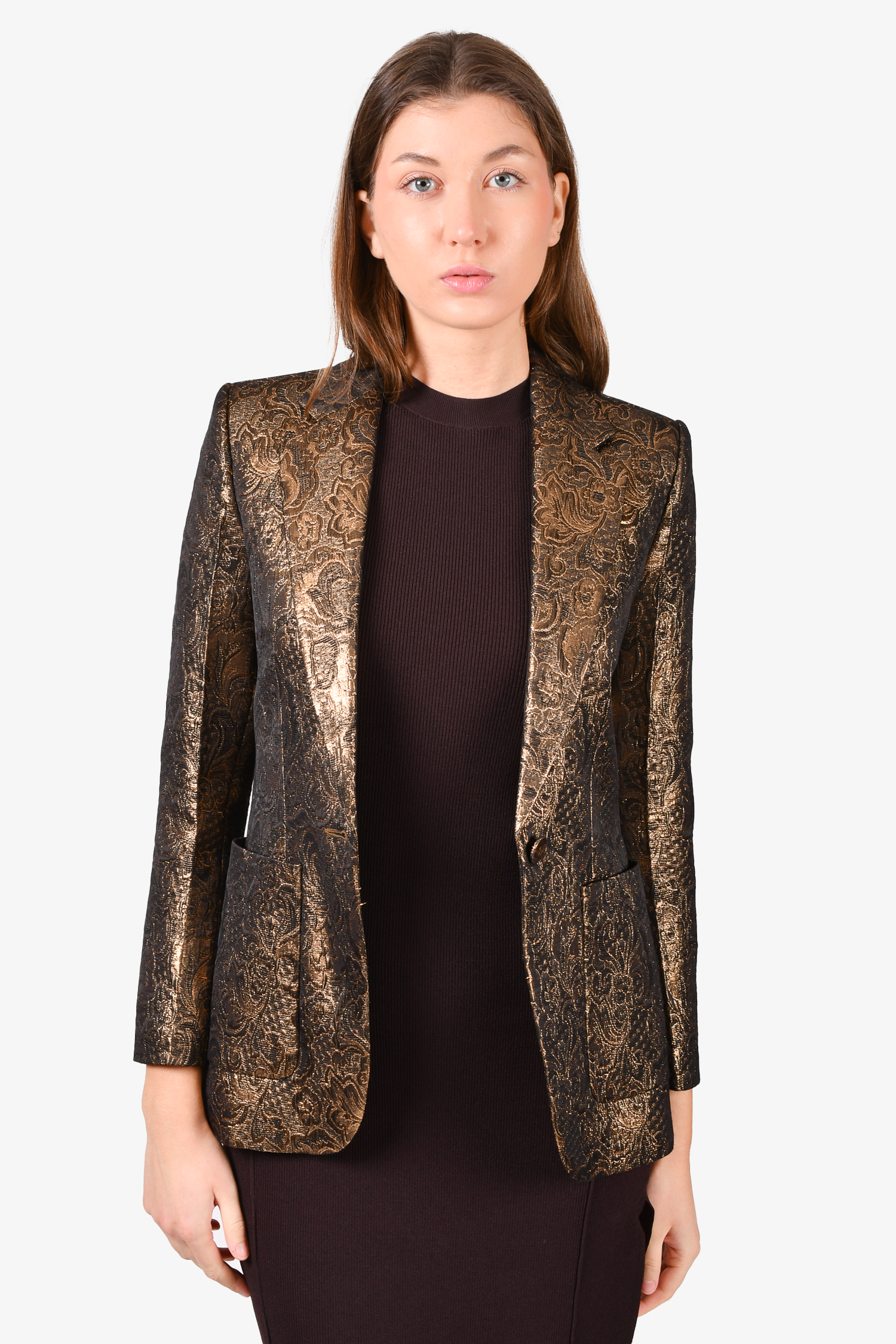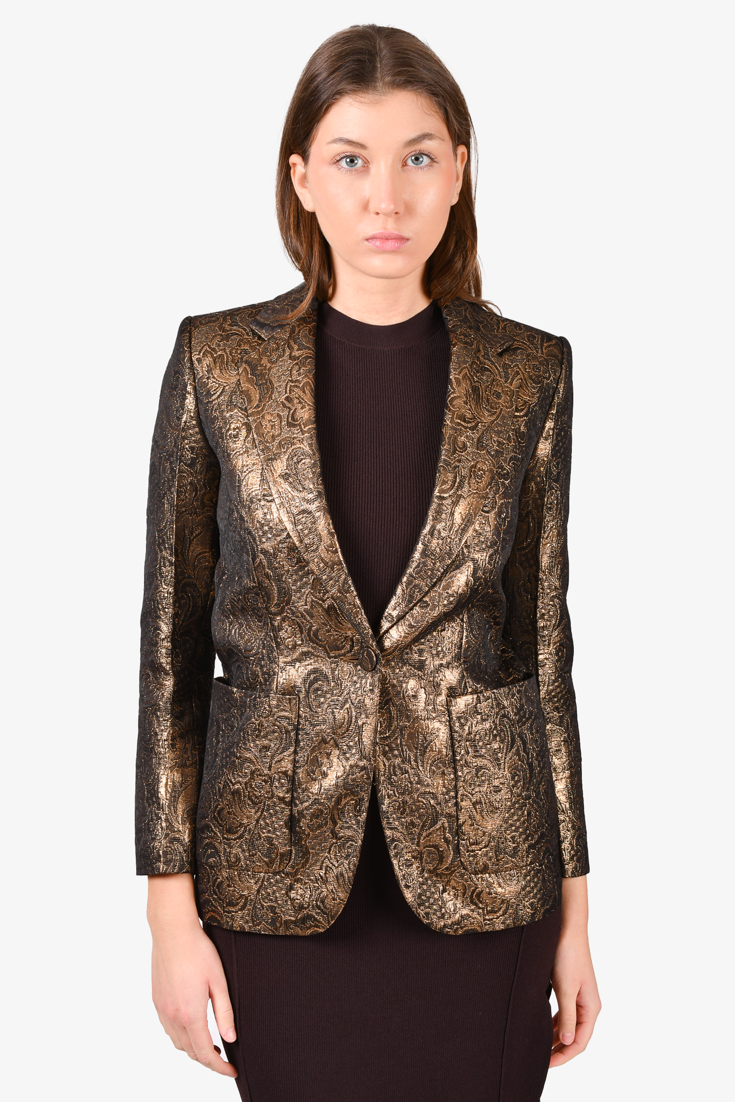 Refresh availabilitySandro Gold/Black Patterned Blazer. Single front button closure. Lined. Padded shoulders. Button details on the cuffs. Tonal stitching.