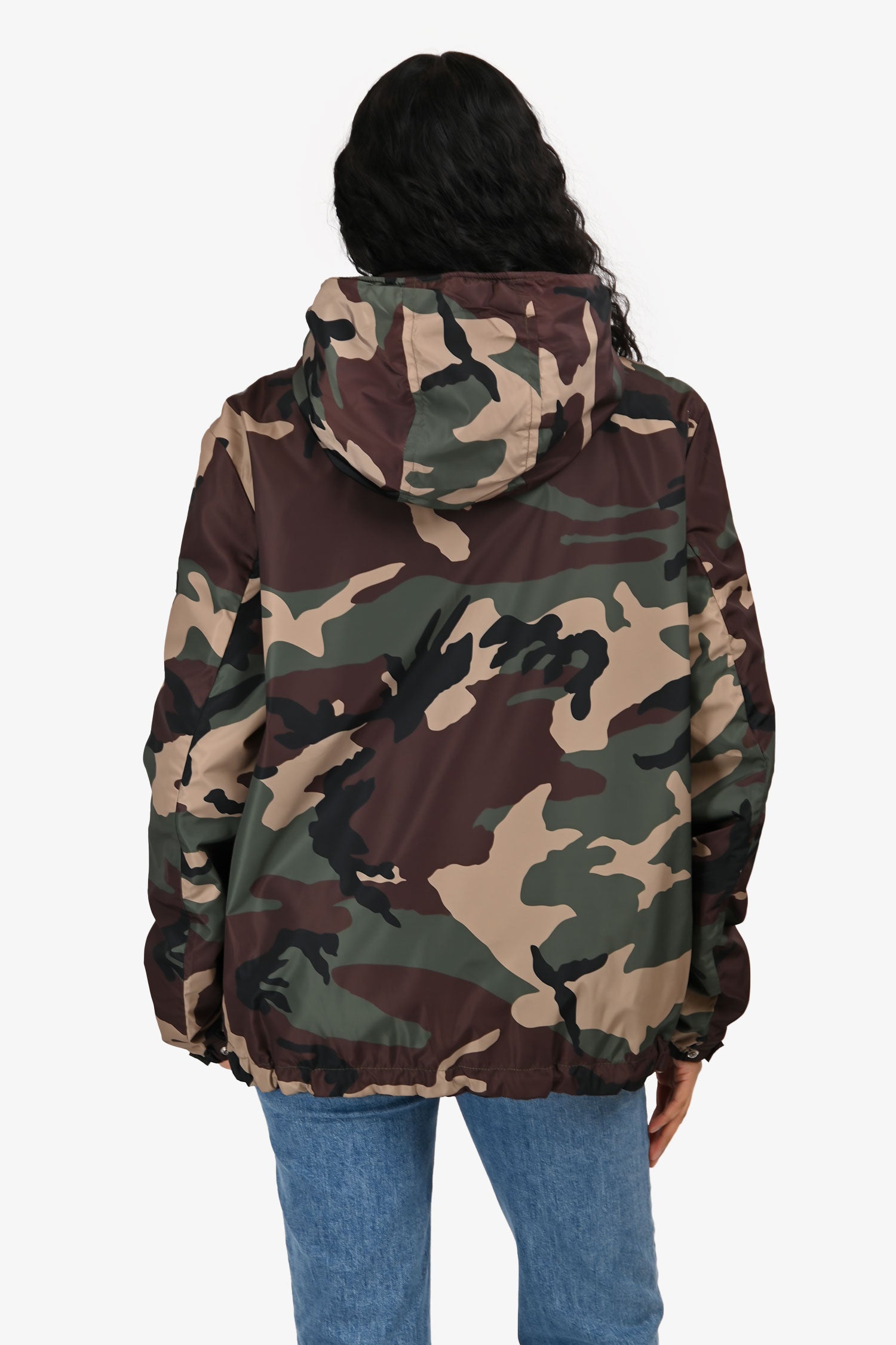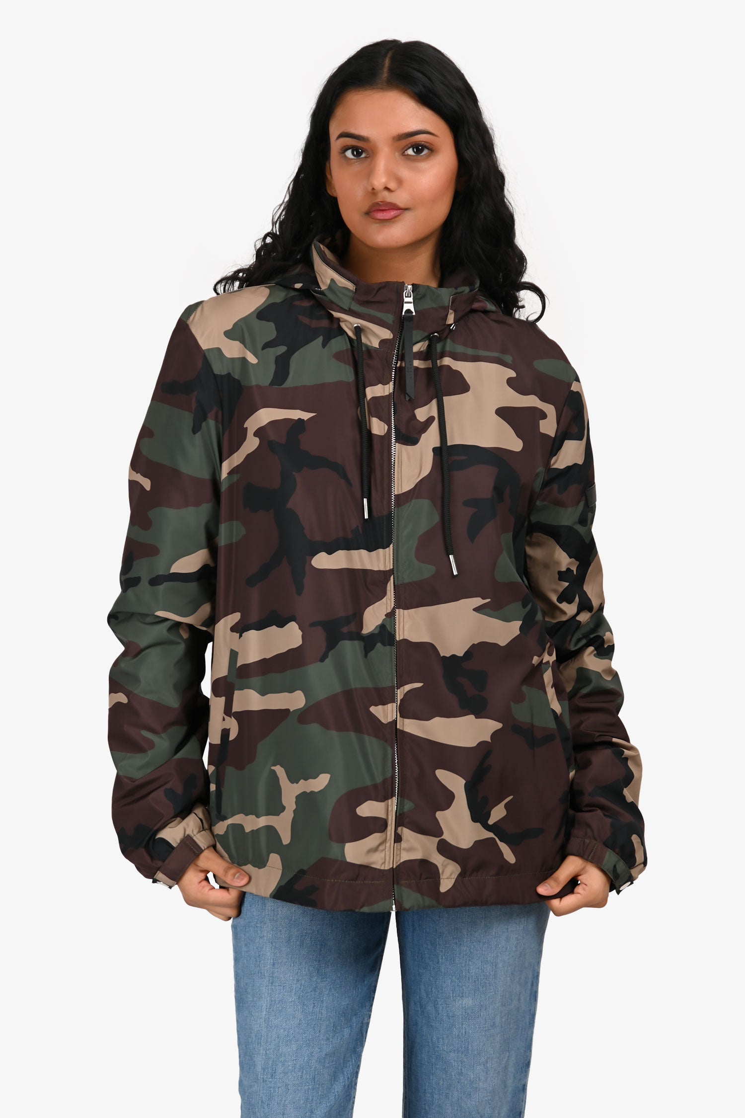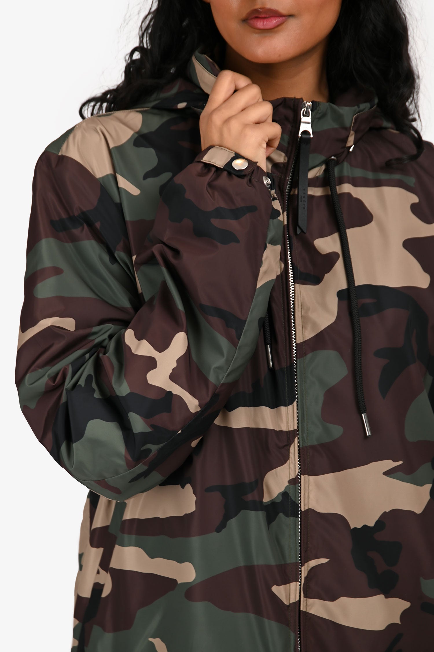 Refresh availabilitySandro Green Army Print Windbreaker. Raised collar with zippered hood compartment. Front zip closure. 2 front slip pockets. Sleeve cuffs with snap-button closures. Lined interior. Silver-tone hardware. Tonal stitching.