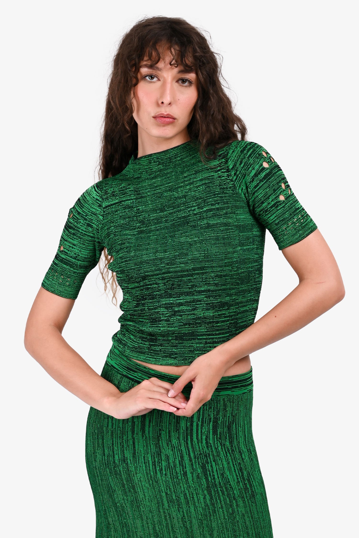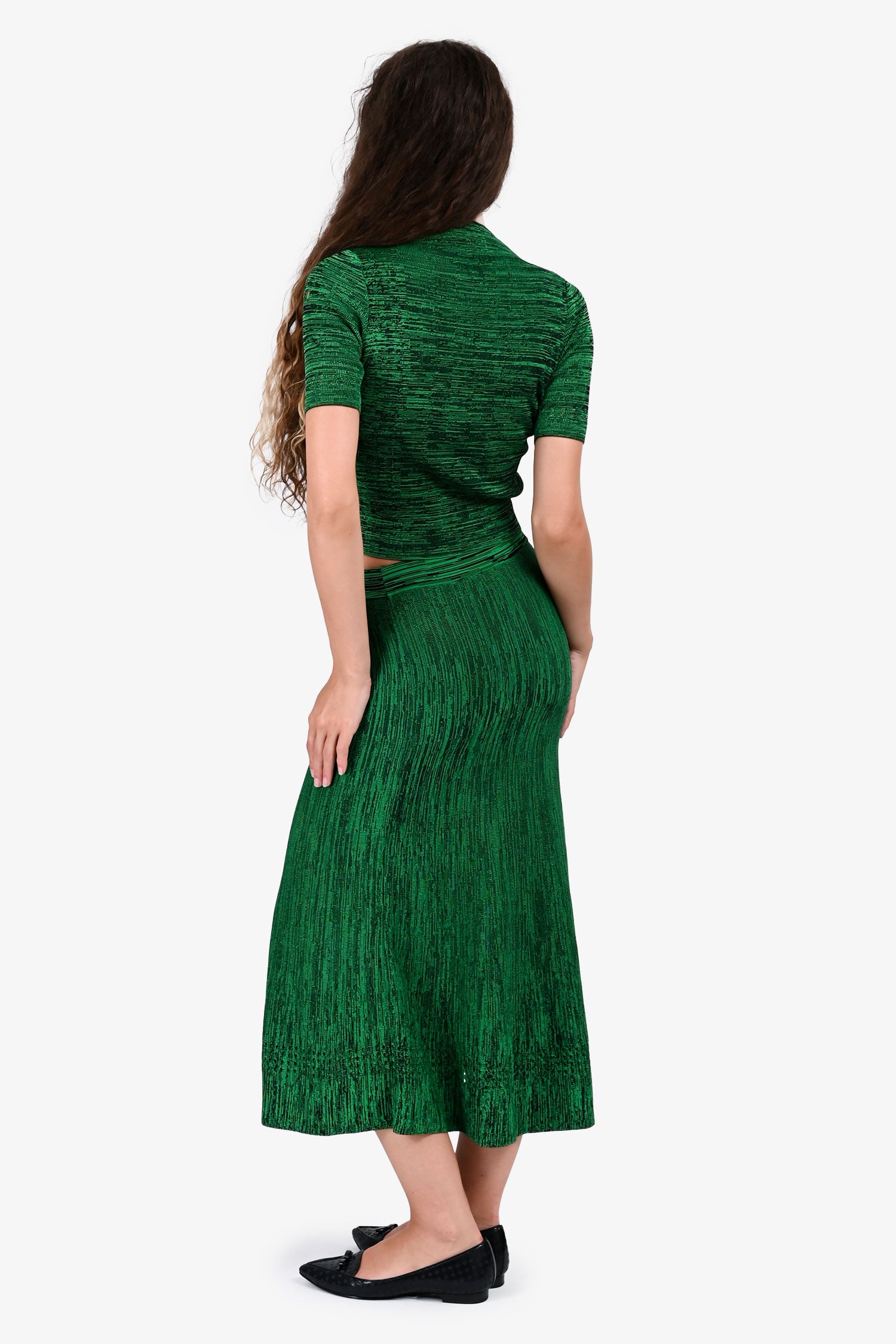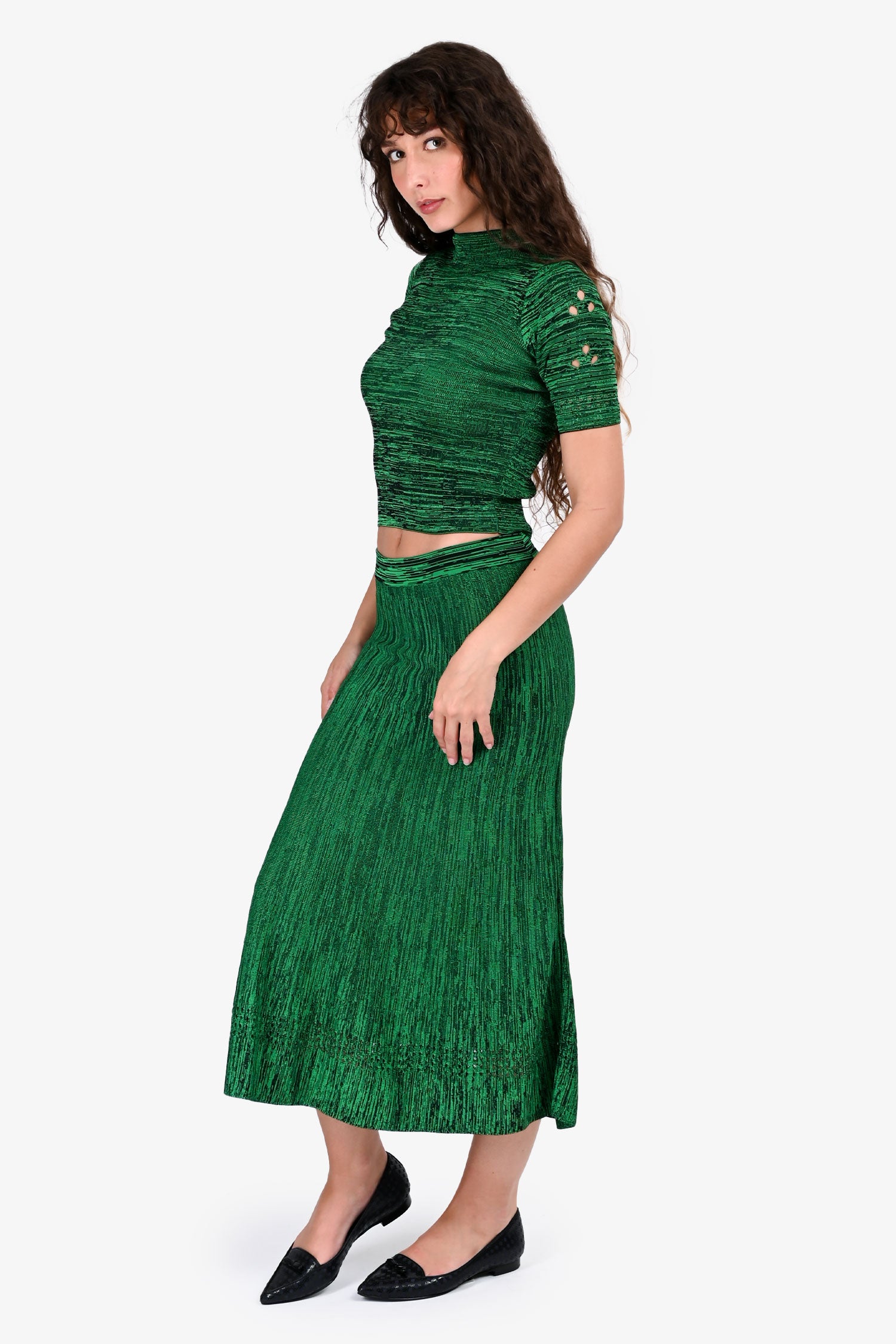 Refresh availabilitySandro Green/Black Gradient Midi Skirt/Top Set. Top features crew neckline and short sleeves with cutout details. Midi skirt has high-rise waist with elastic waistband and flared silhouette. Tonal stitching.